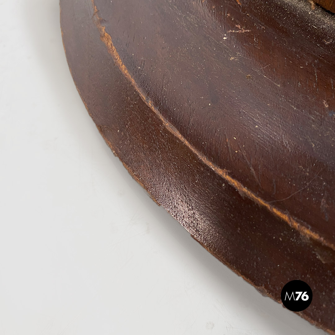 Piedistallo o espositore a colonna in legno con finitura il rilievo sagomata, con motivo ripetuto, a sezione irregolare e non tonda, sebbene la base di appoggio ed il piano superiore siano di forma tonda. Quest’ultimo è provvisto di una finitura grezza, con un piccolo foro centrale.