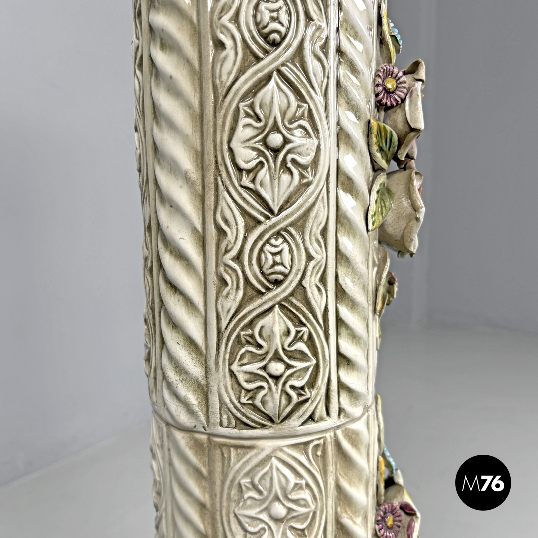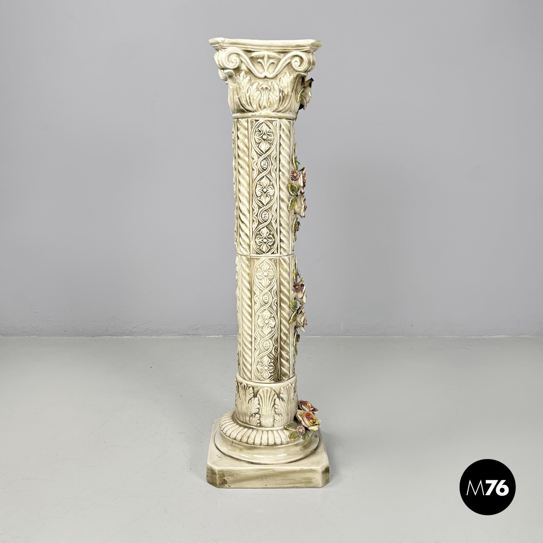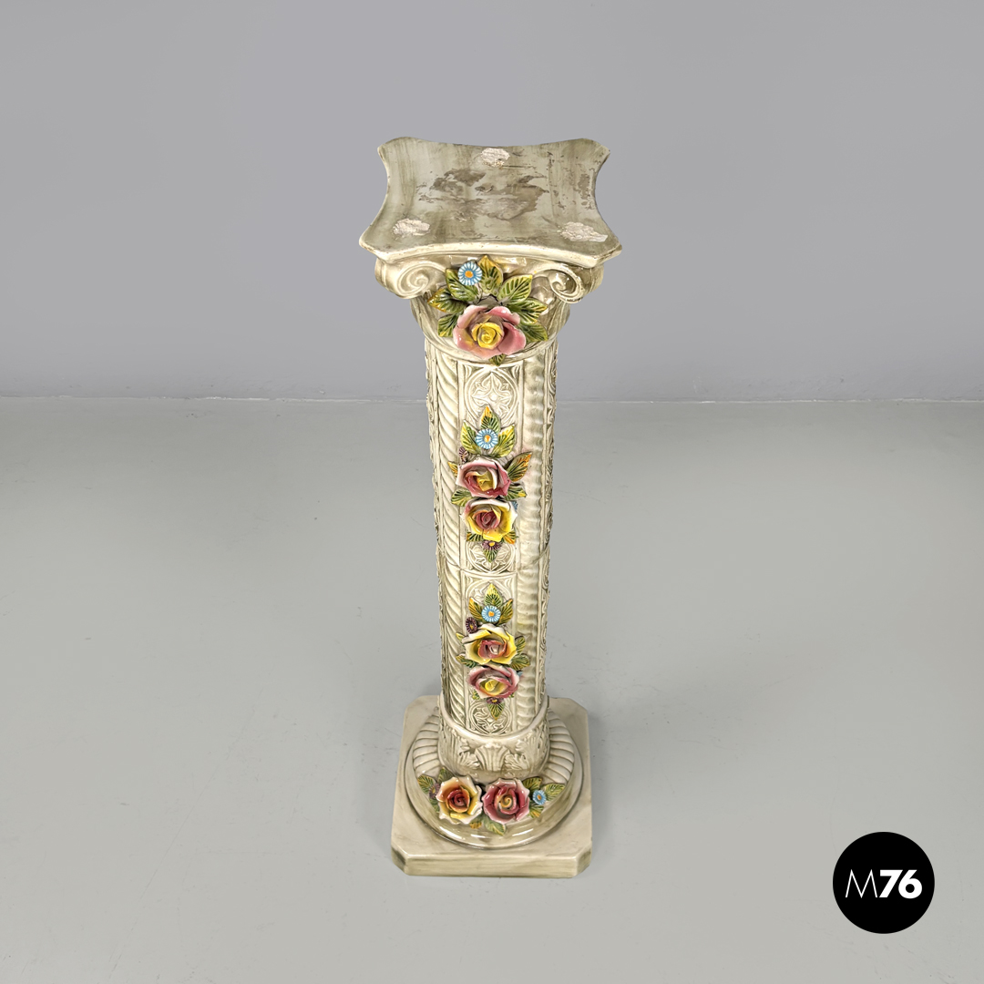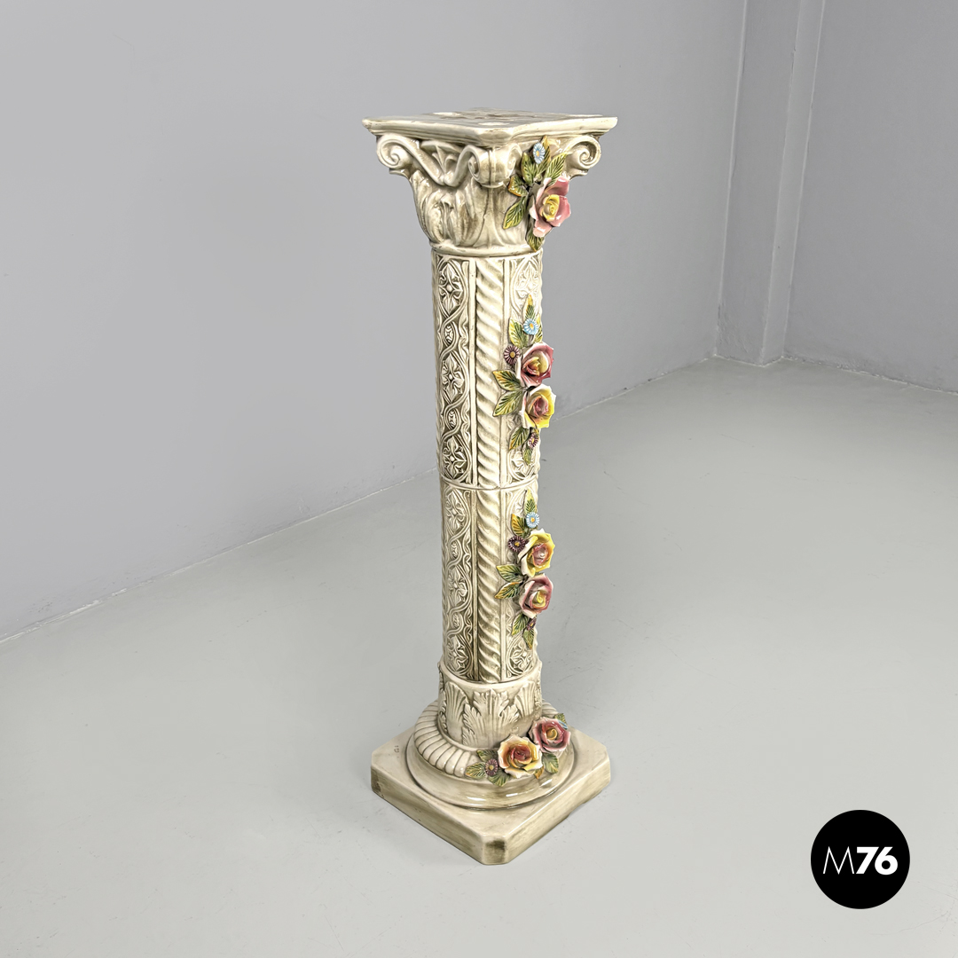 Colonna o piedistallo in ceramica a base quadrata in ceramica smaltata bianca con sfumature marroni. Sono presenti su tutta la struttura decorazioni in rilievo che ricordano l’arte medievale, su quattro punti si trovano dei fiori realistici in rilevo di colore giallo, cele ste e rosa con foglie verdi.