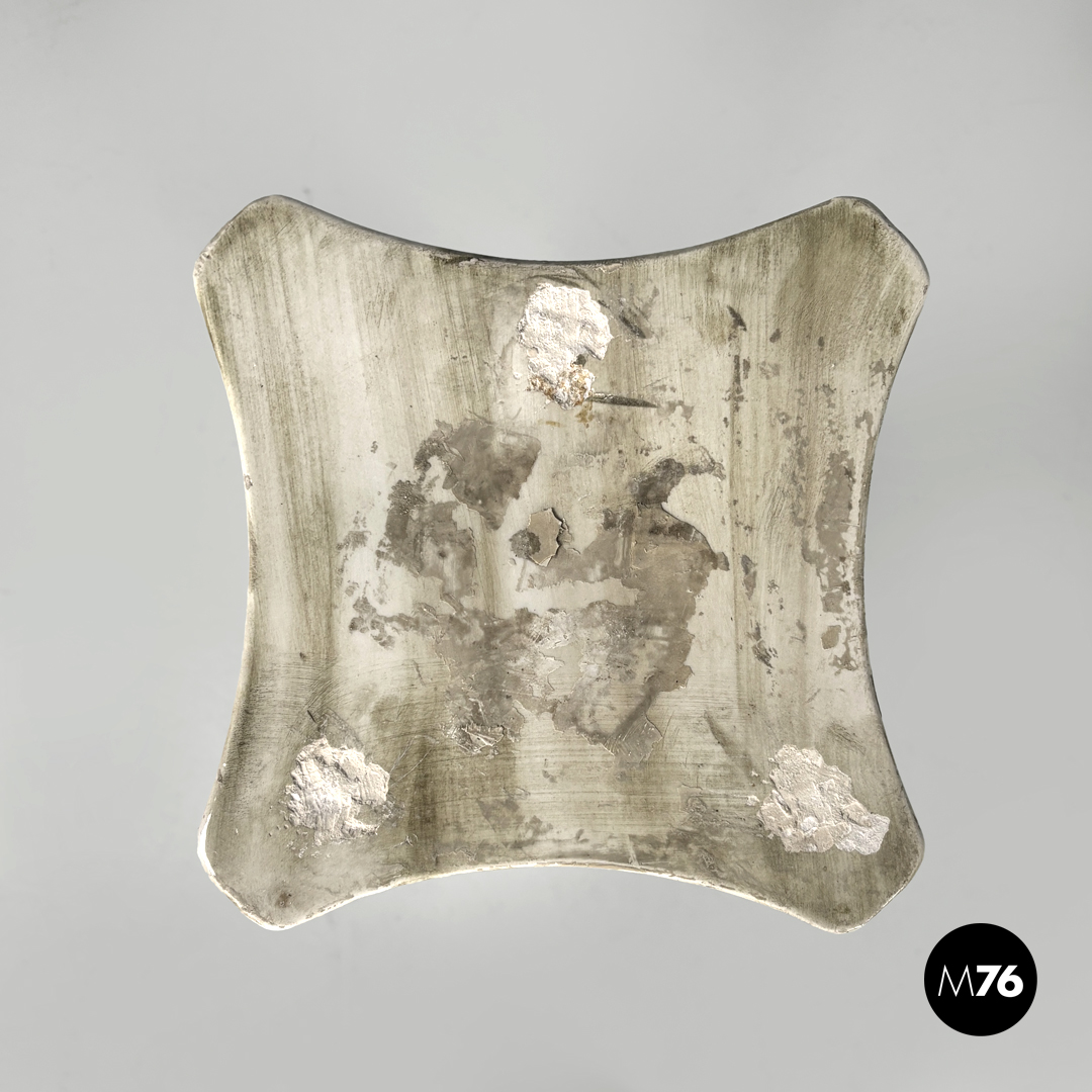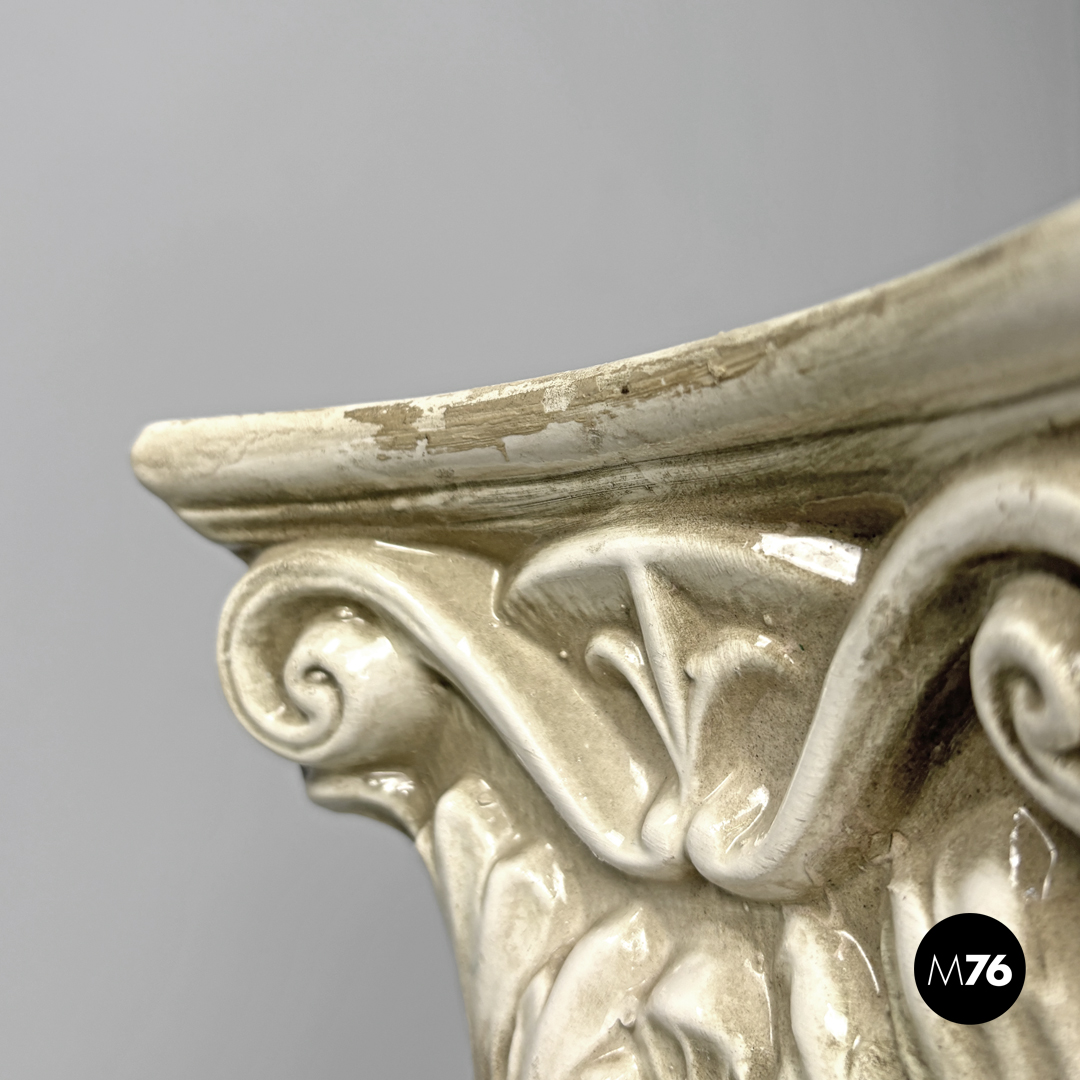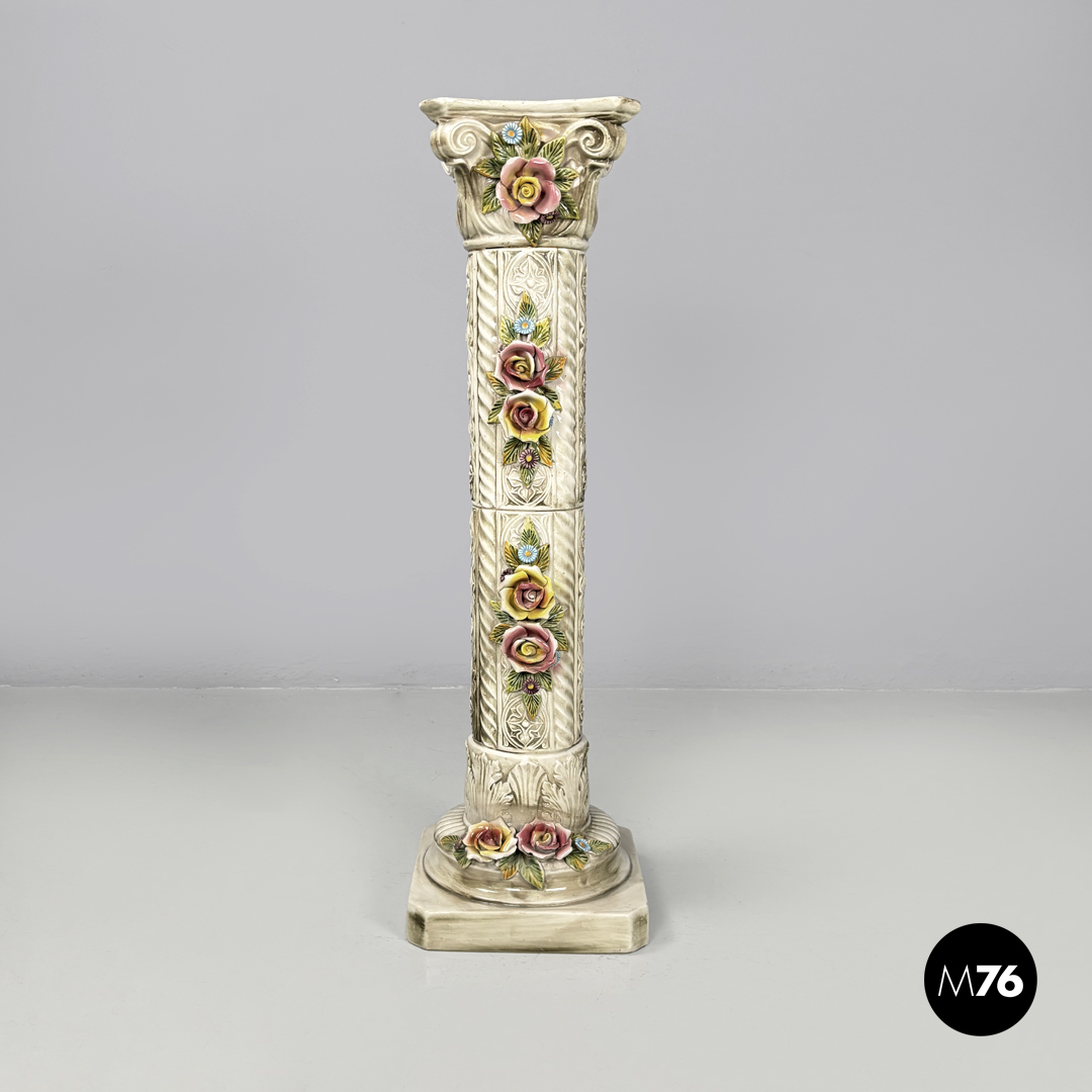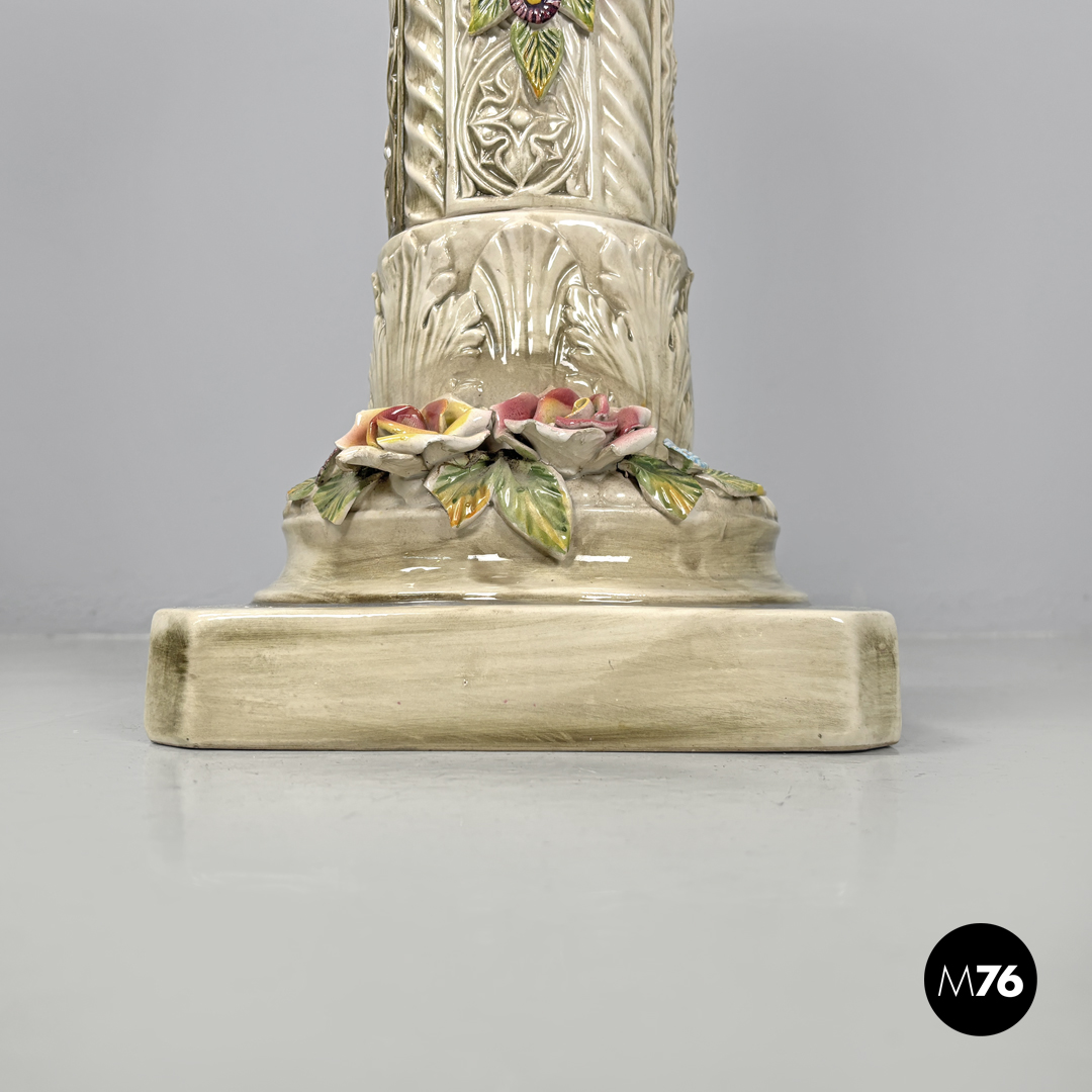 Colonna o piedistallo in ceramica a base quadrata in ceramica smaltata bianca con sfumature marroni. Sono presenti su tutta la struttura decorazioni in rilievo che ricordano l’arte medievale, su quattro punti si trovano dei fiori realistici in rilevo di colore giallo, cele ste e rosa con foglie verdi.
