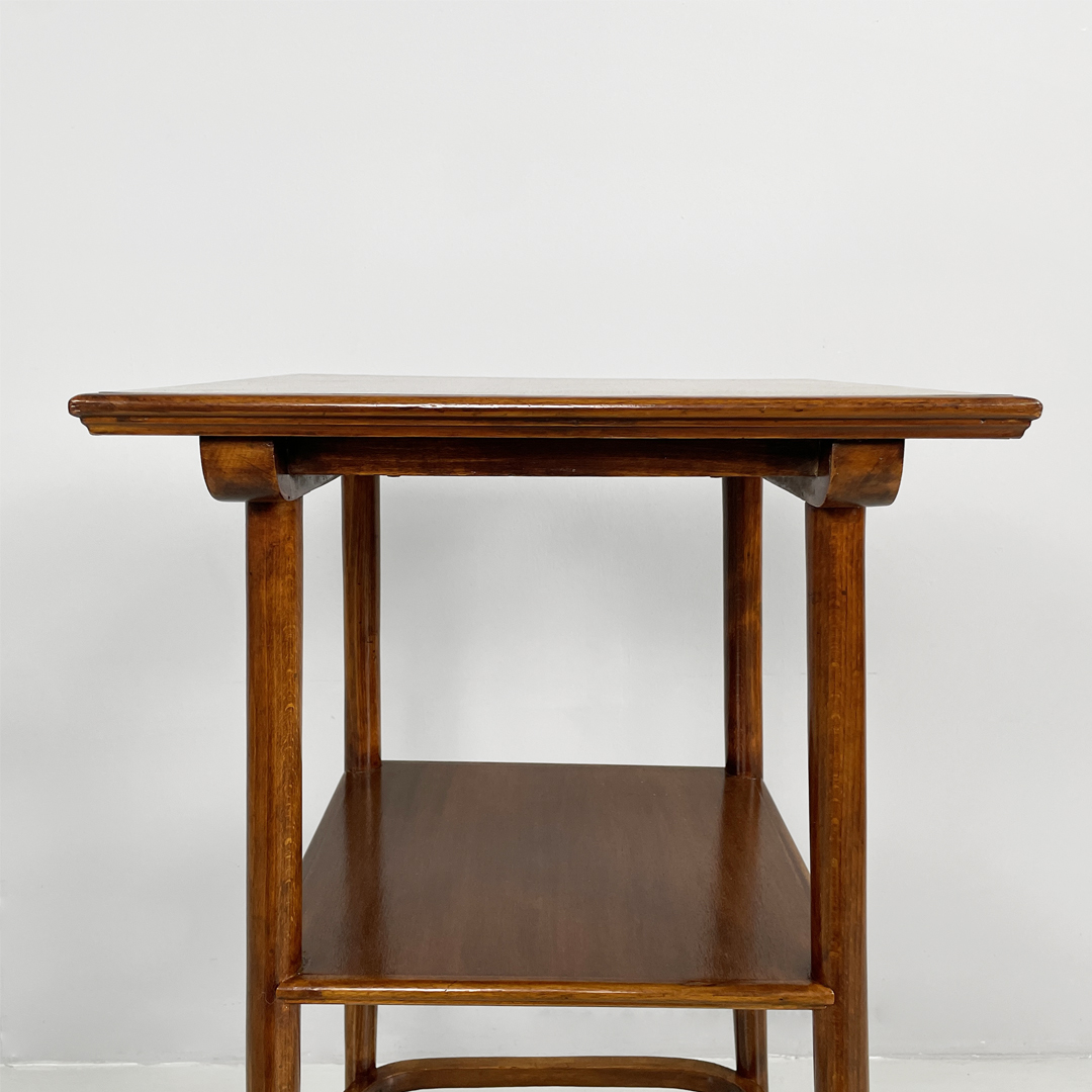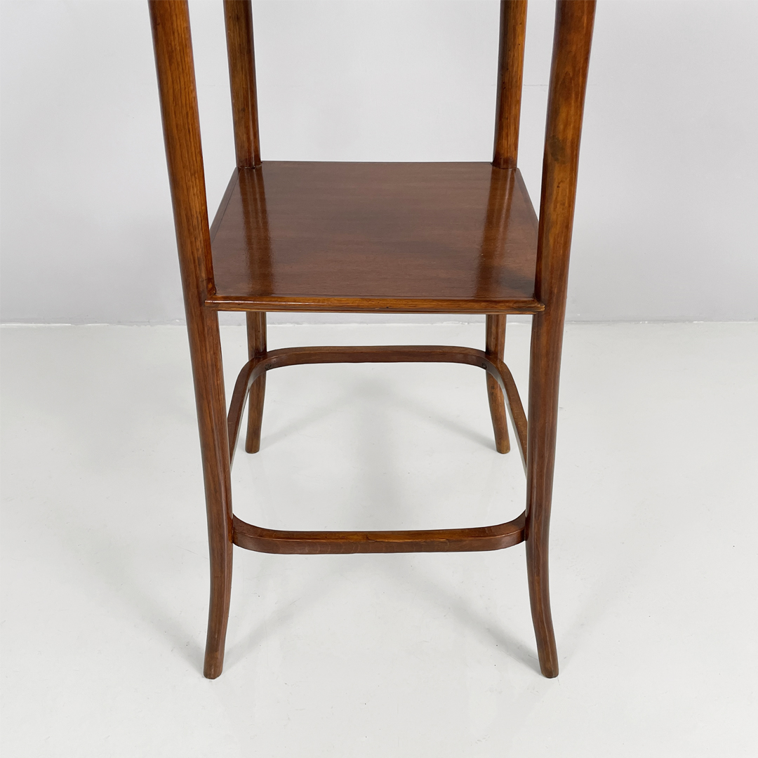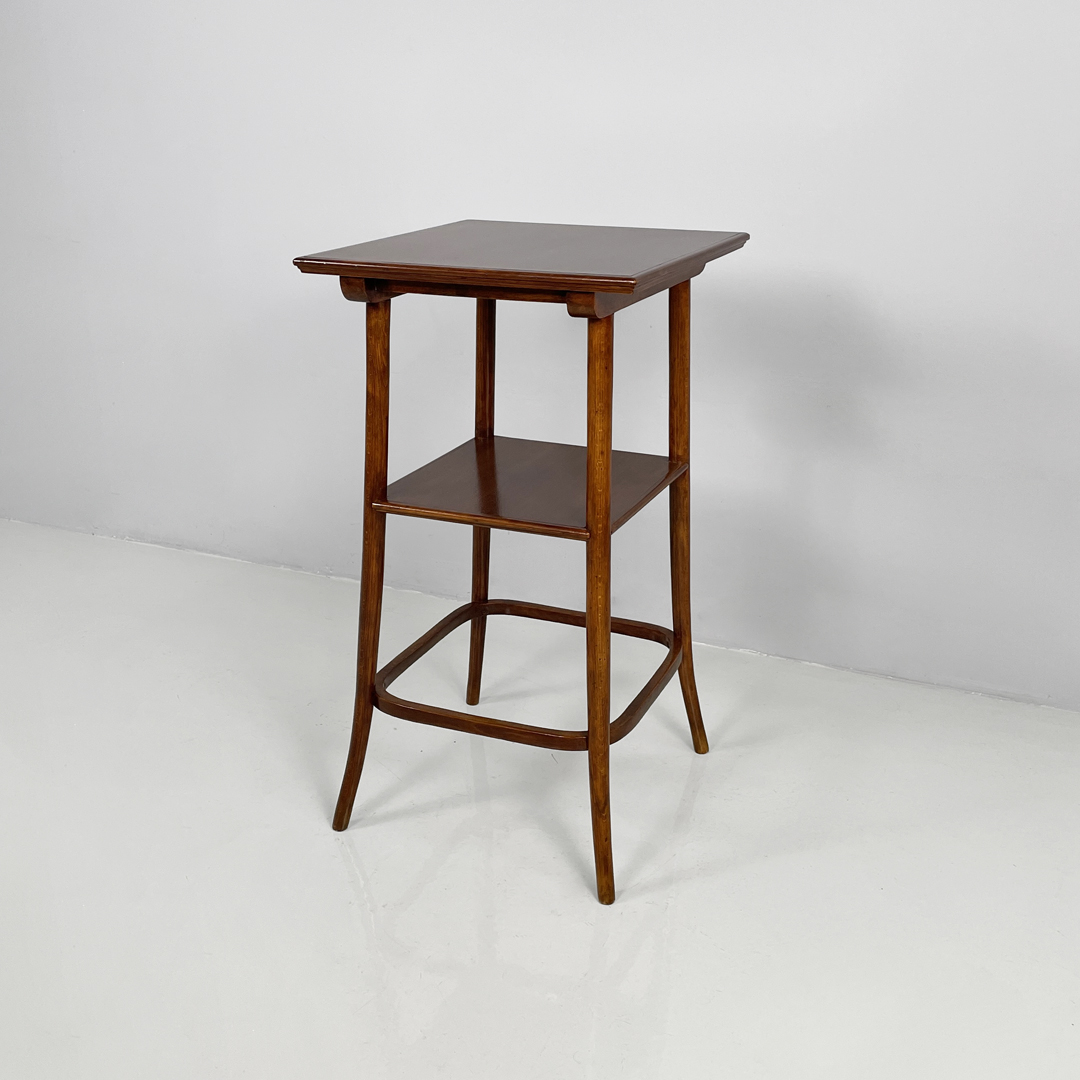 Piedistallo o colonna espositore con piano quadrato in legno. Il piano è sostenuto da quattro gambe a sezione tonda in legno che si allargano verso l’esterno. Presenta un secondo piano.