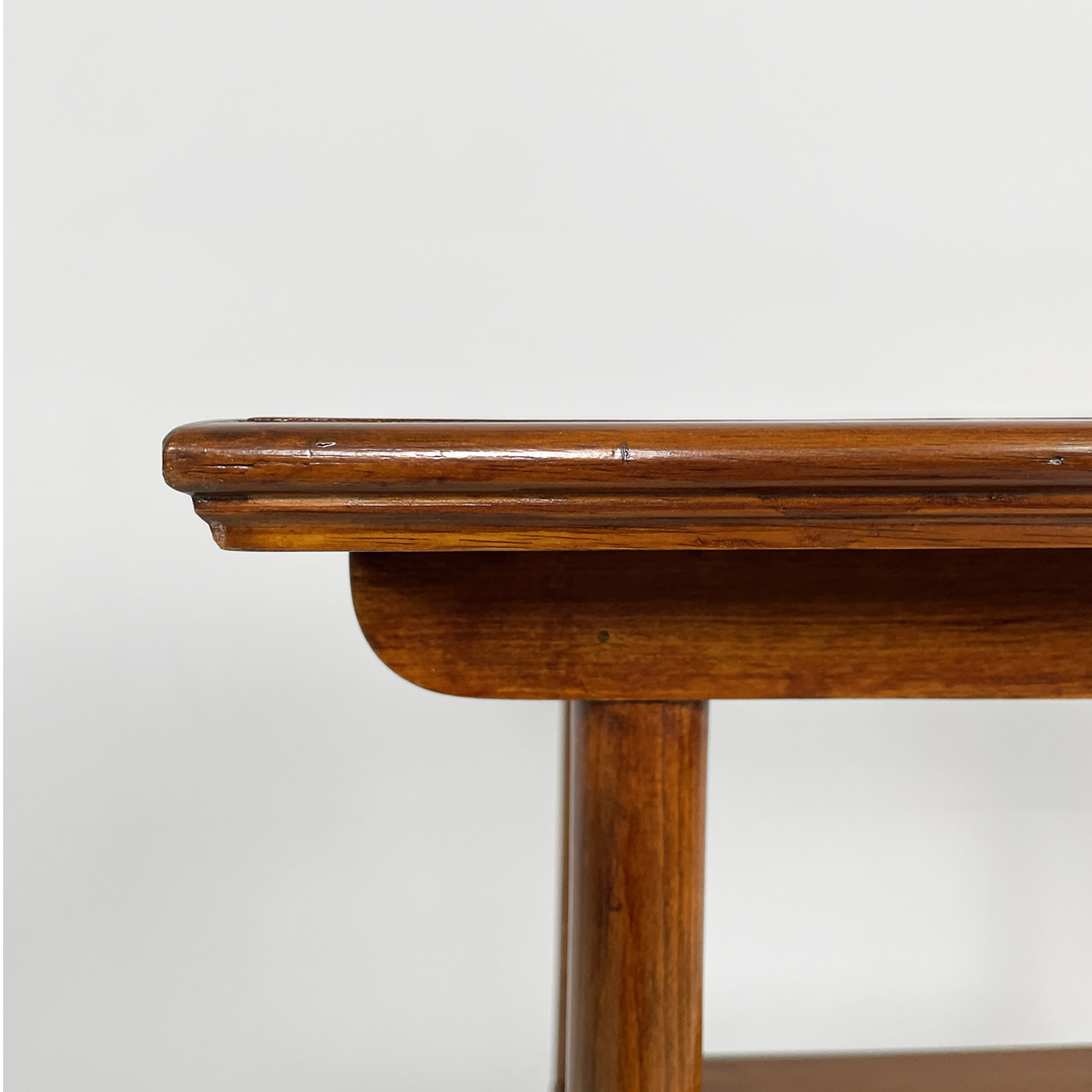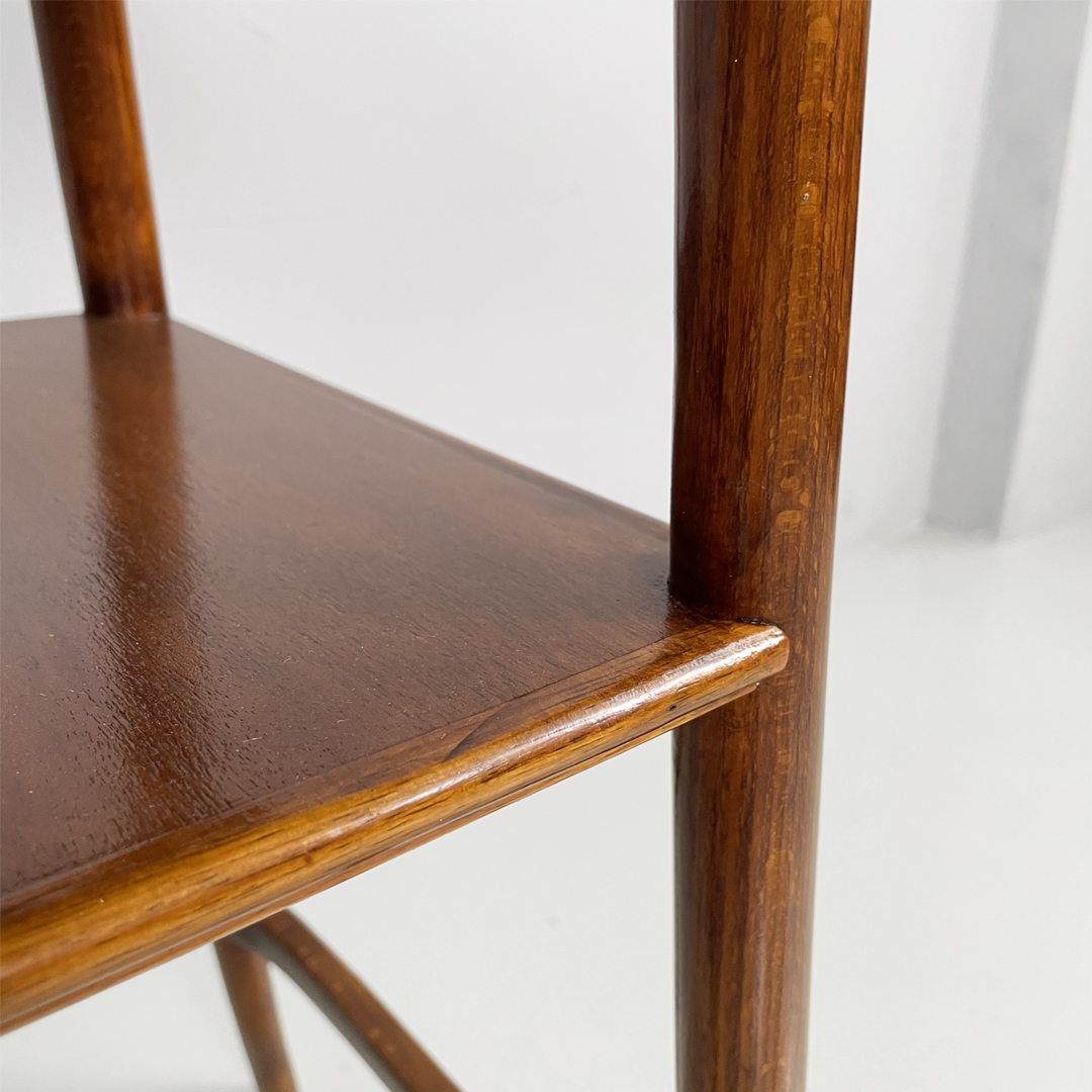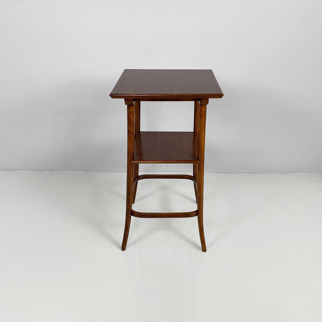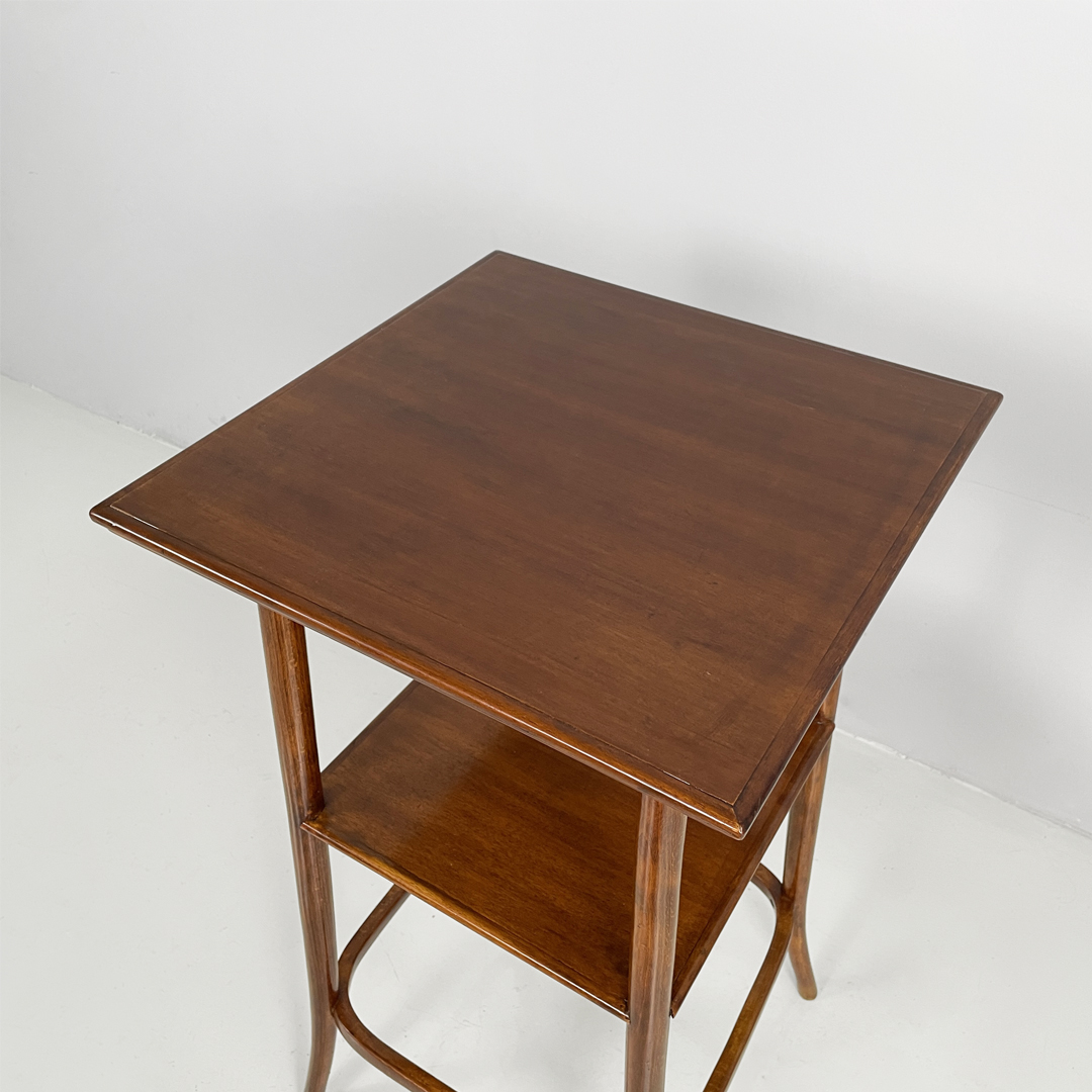 Piedistallo o colonna espositore con piano quadrato in legno. Il piano è sostenuto da quattro gambe a sezione tonda in legno che si allargano verso l’esterno. Presenta un secondo piano.