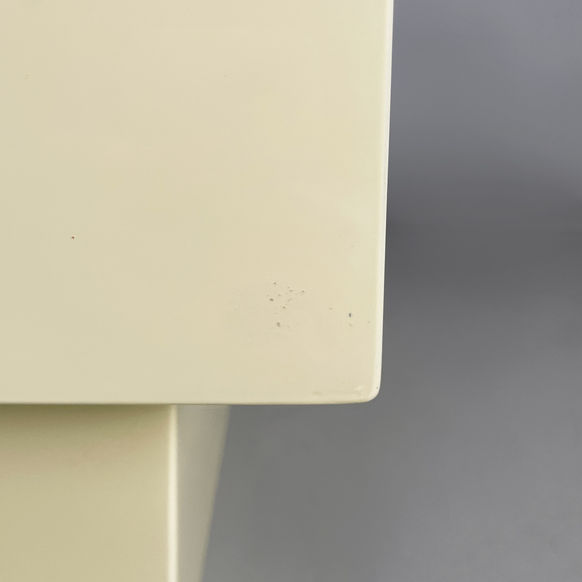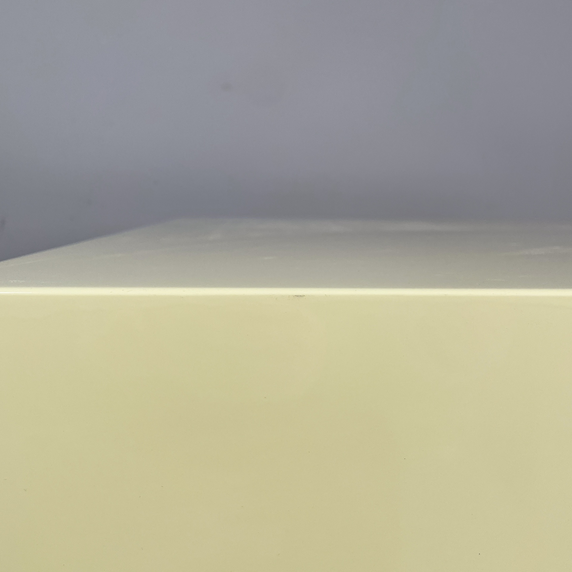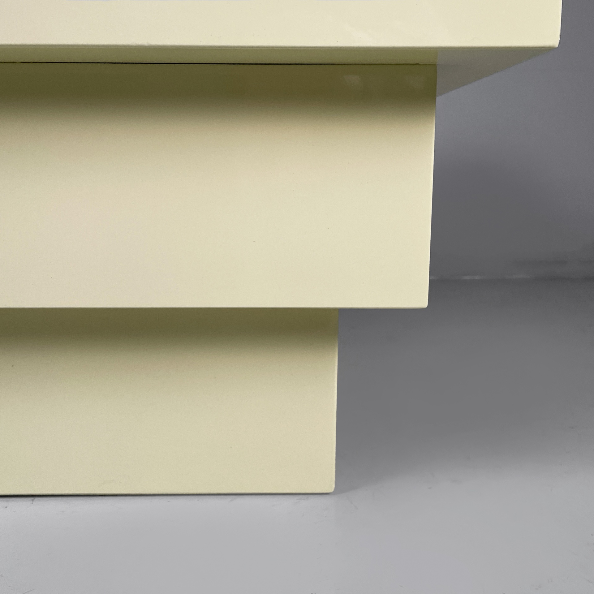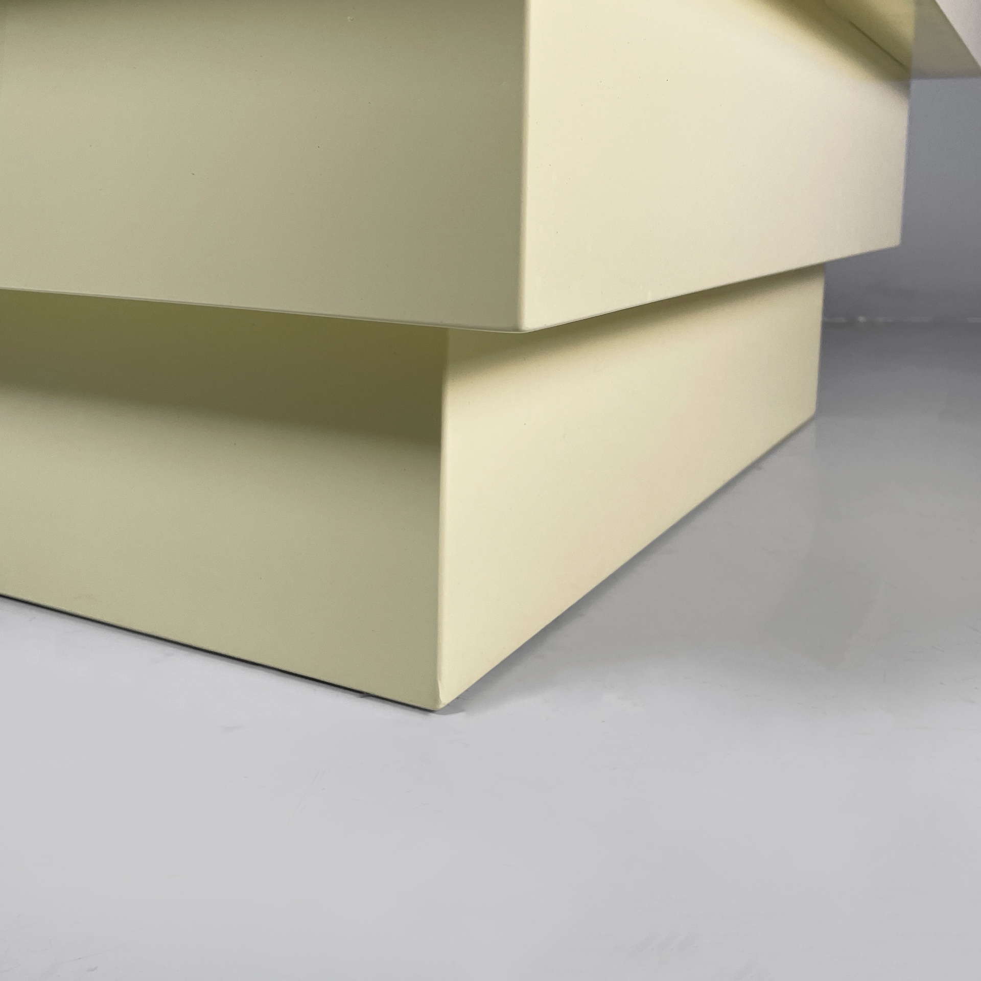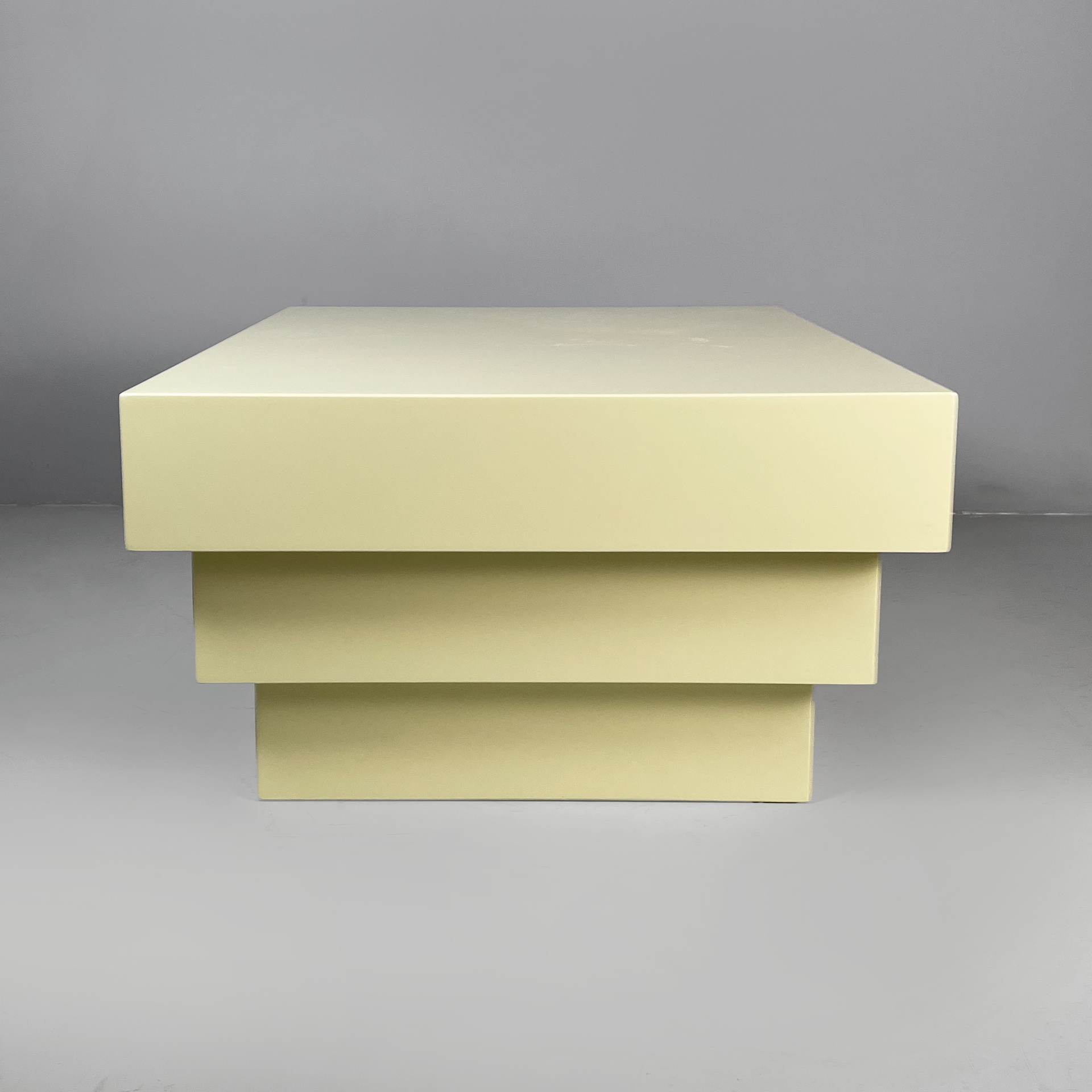 Piedistallo o tavolo da caffè con piano quadrato, interamente in legno laccato giallo chiaro. La struttura a scala si tende a stringere verso la base. Utilizzabile come espositore.