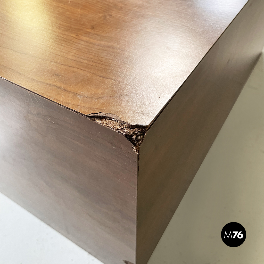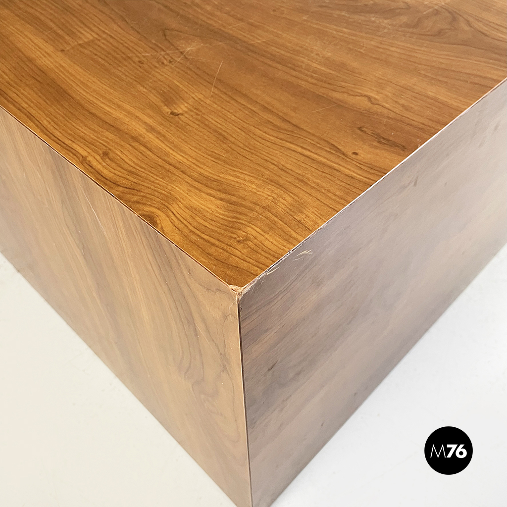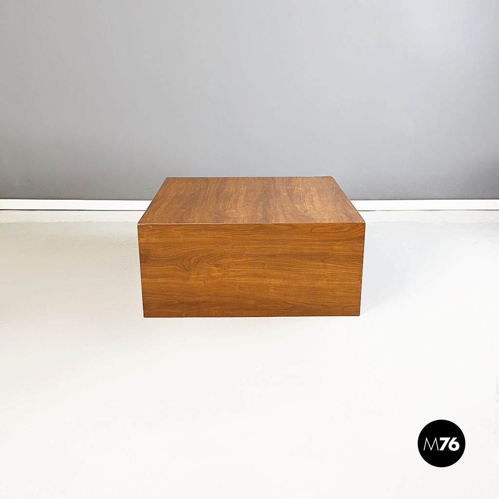Piedistallo, espositore o tavolo da caffè con forma a parallelepipedo in legno, rivestita col suo originale laminato color noce.