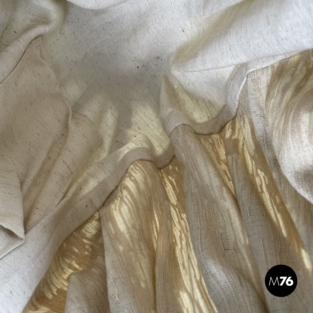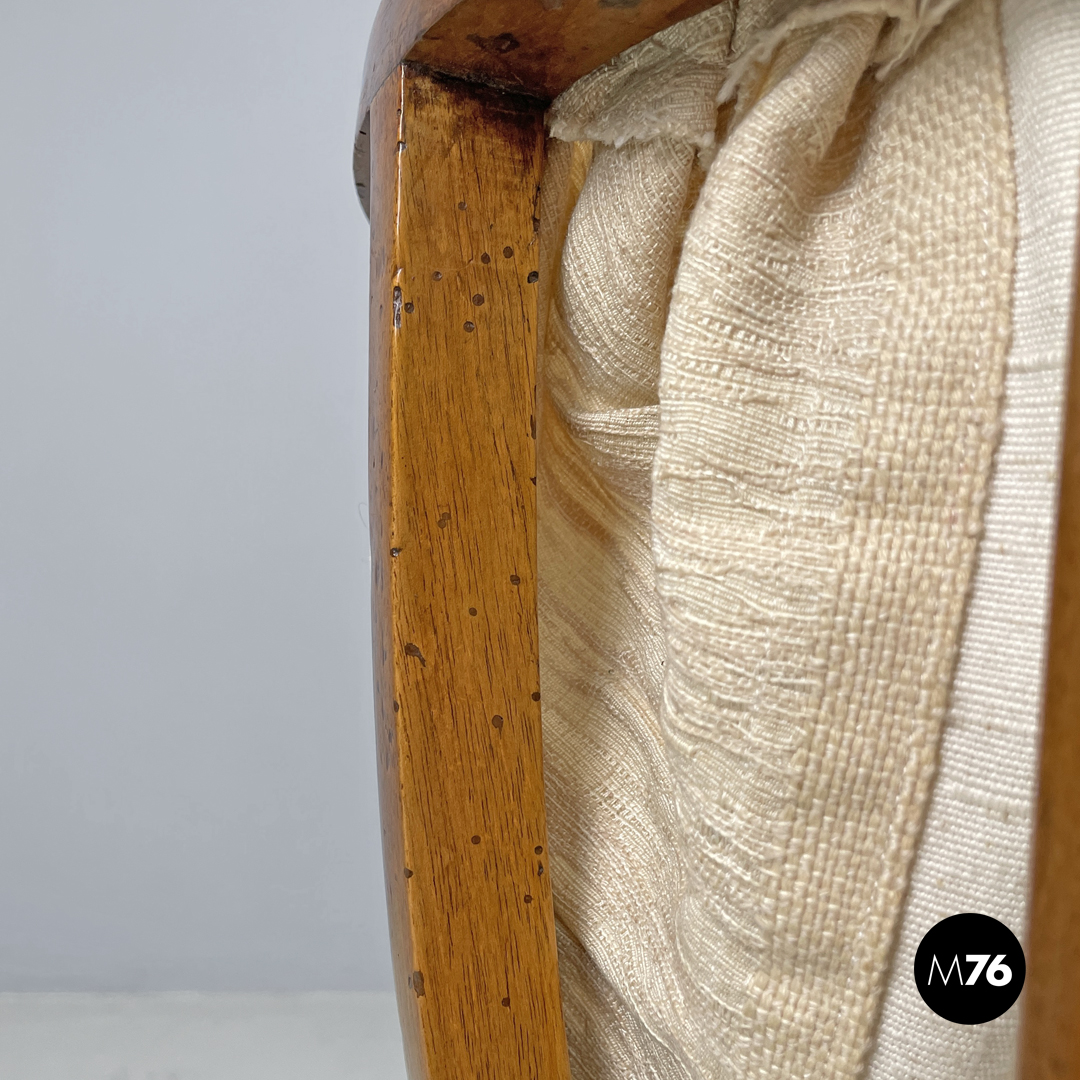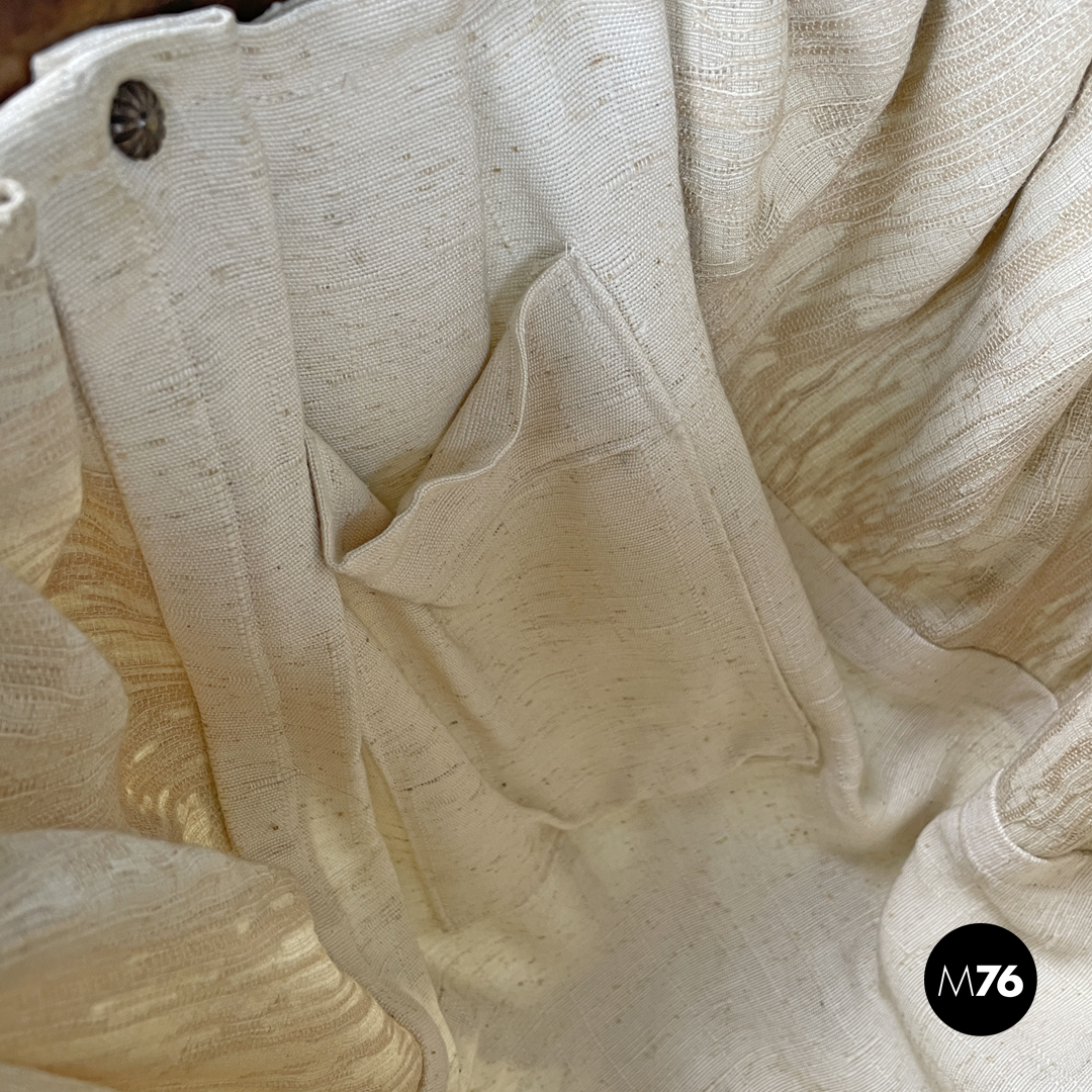 Piedistallo porta gomitoli o porta cucito in legno e tessuto di cotone. La parte alta è composta da un cesto con bordo tondo e bracci stondati, che contiene una fodera in cotone color bianco avorio a tessitura grezza, con una tasca, ed è collegata alla struttura tramite borchie in ferro. Le tre gambe seguono linee curve e si sviluppano verso l’esterno.