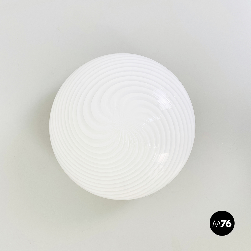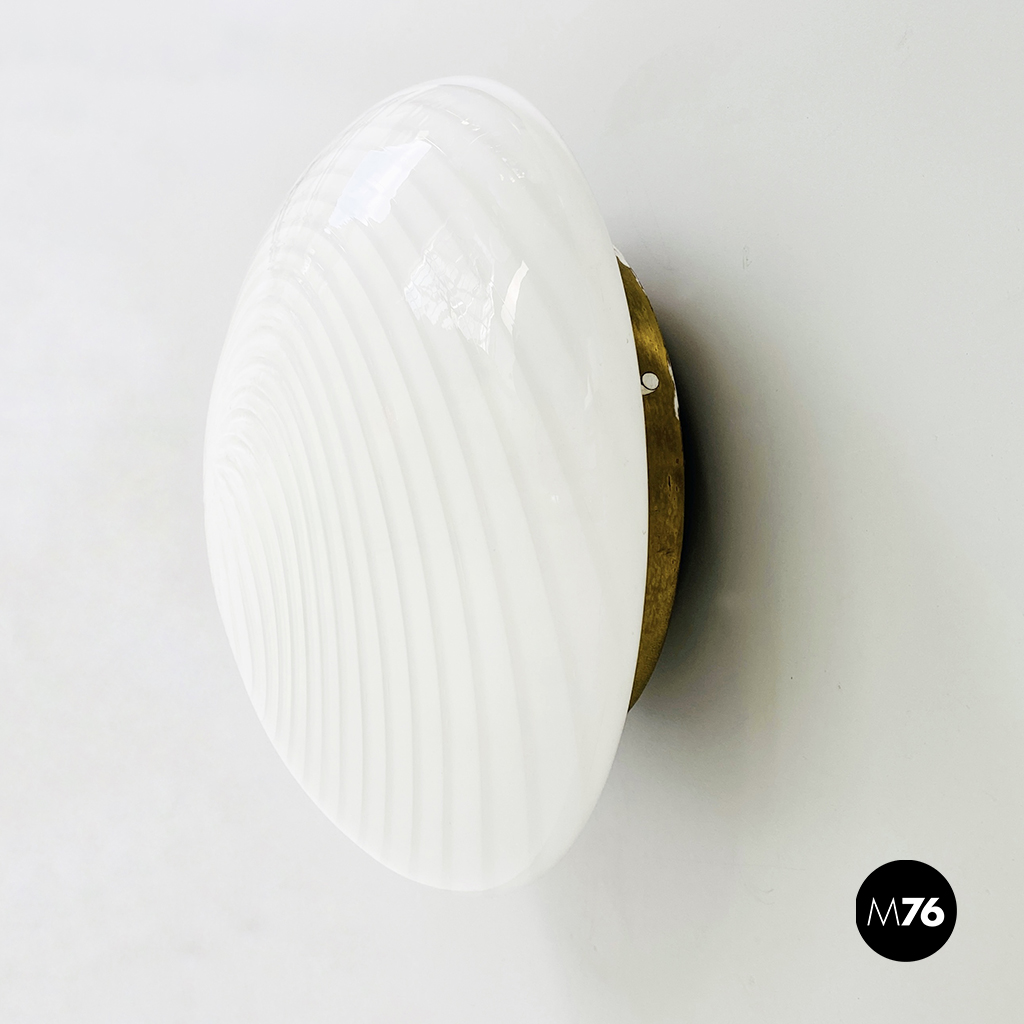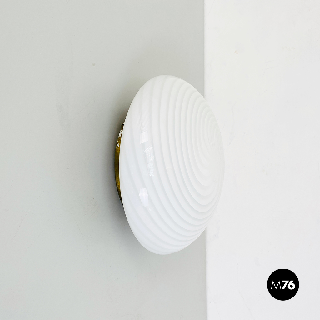 Plafoniera o applique in vetro di Murano bianco con fantasia a spirale e struttura in ottone.
