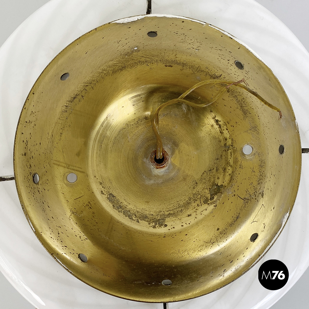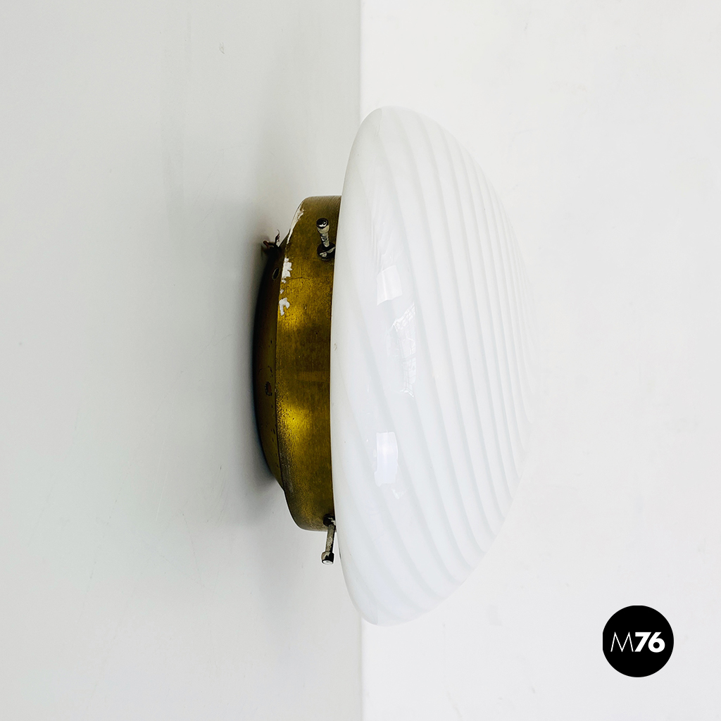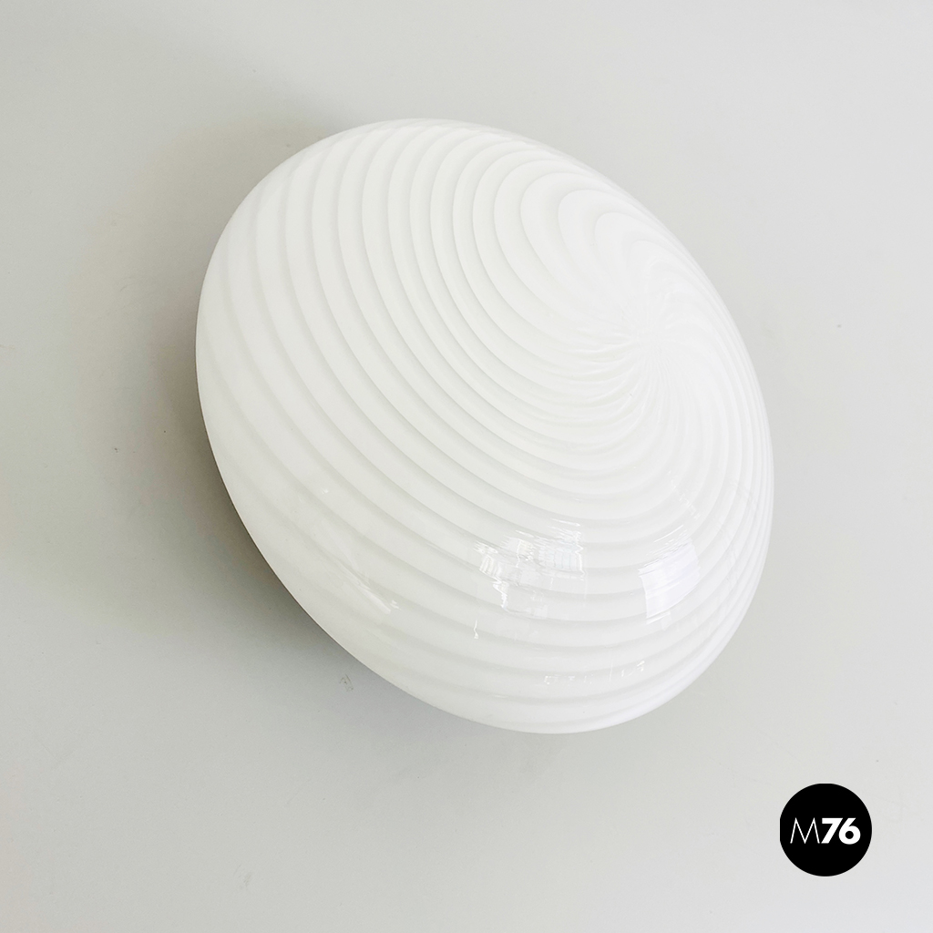 Plafoniera o applique in vetro di Murano bianco con fantasia a spirale e struttura in ottone.