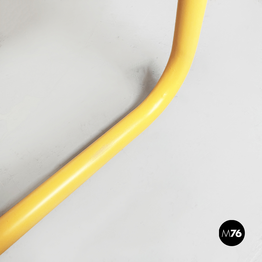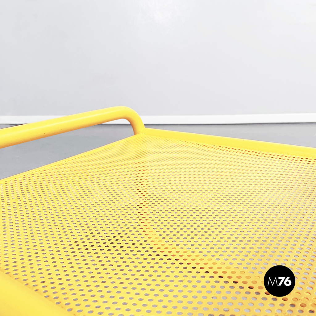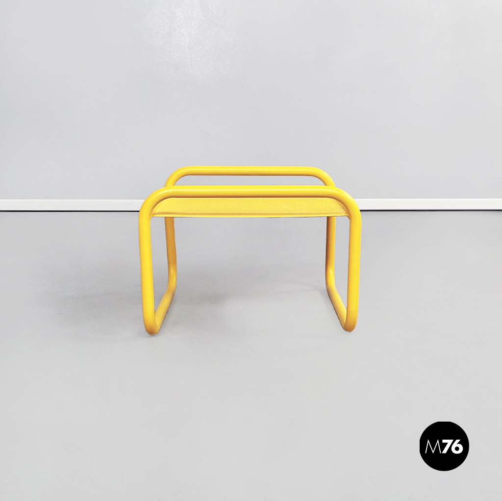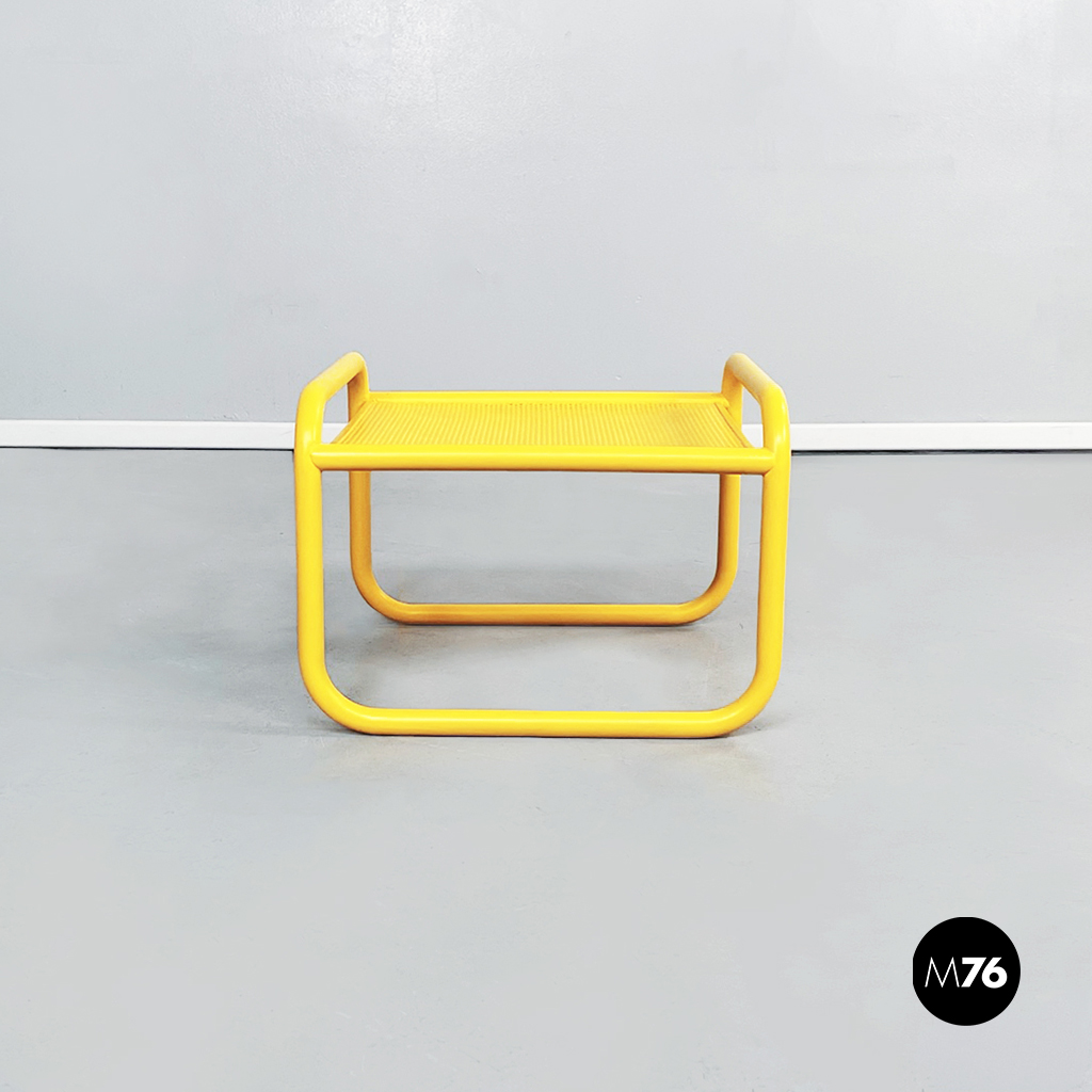 Poggiapiedi modello Locus Solus in metallo verniciato giallo. Il piano rettangolare di appoggio è traforato. La struttura è in tubolare. Questo poggiapiedi è adatto per il giardino o in generale per gli esterni, ed è utilizzabile anche come pouf o tavolo da caffè.
