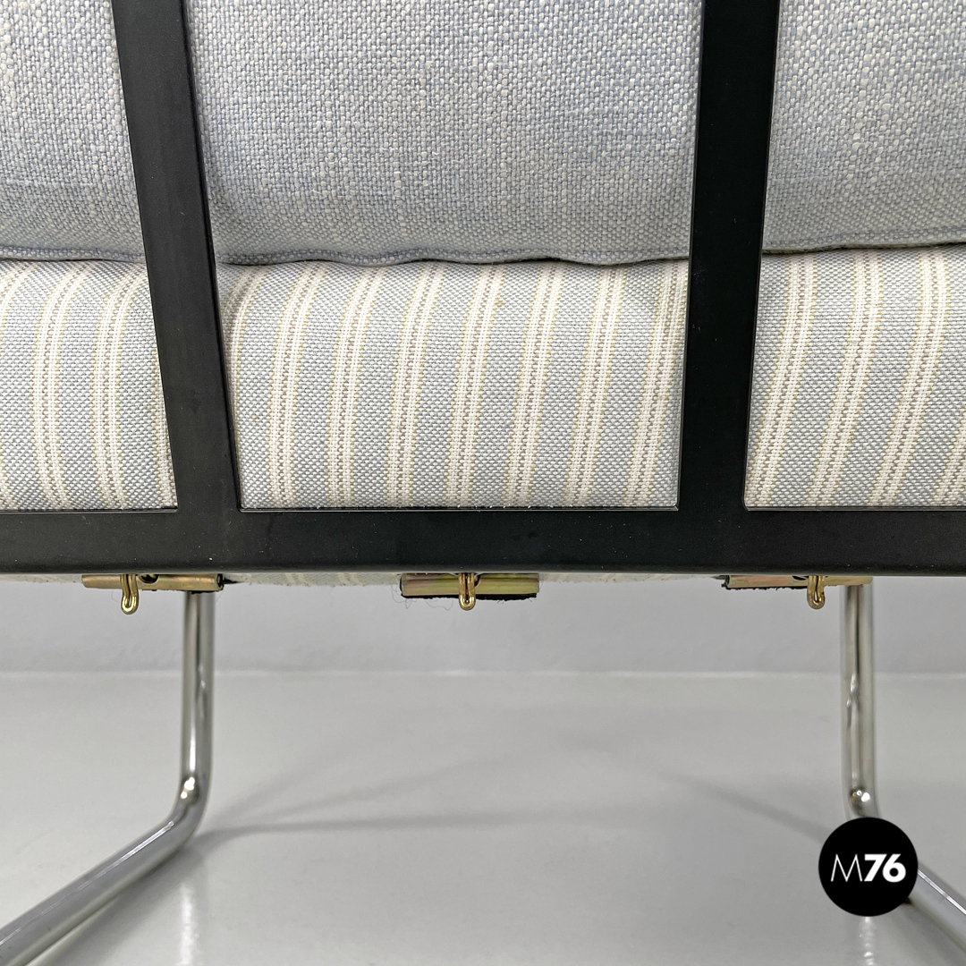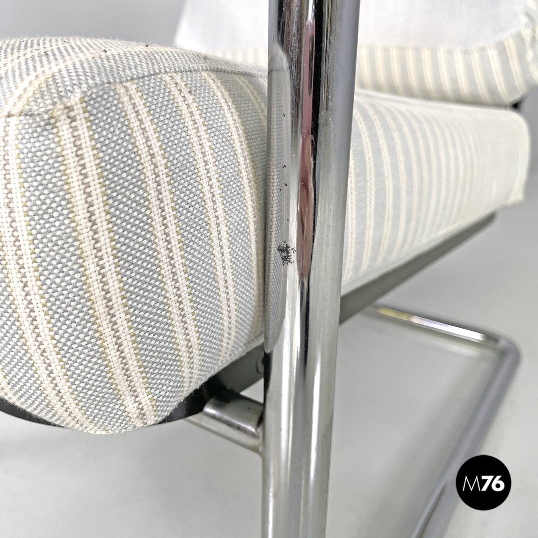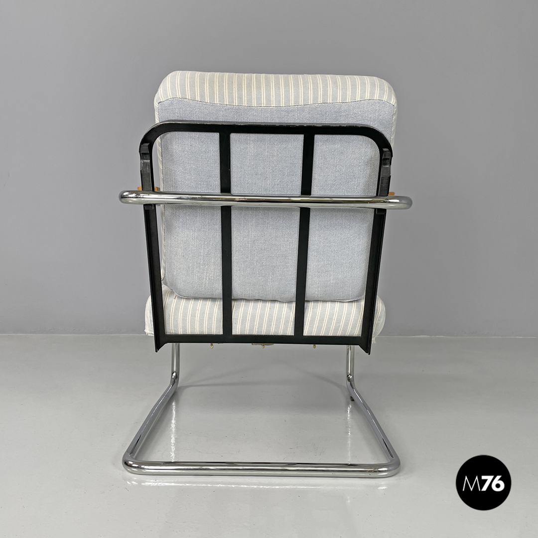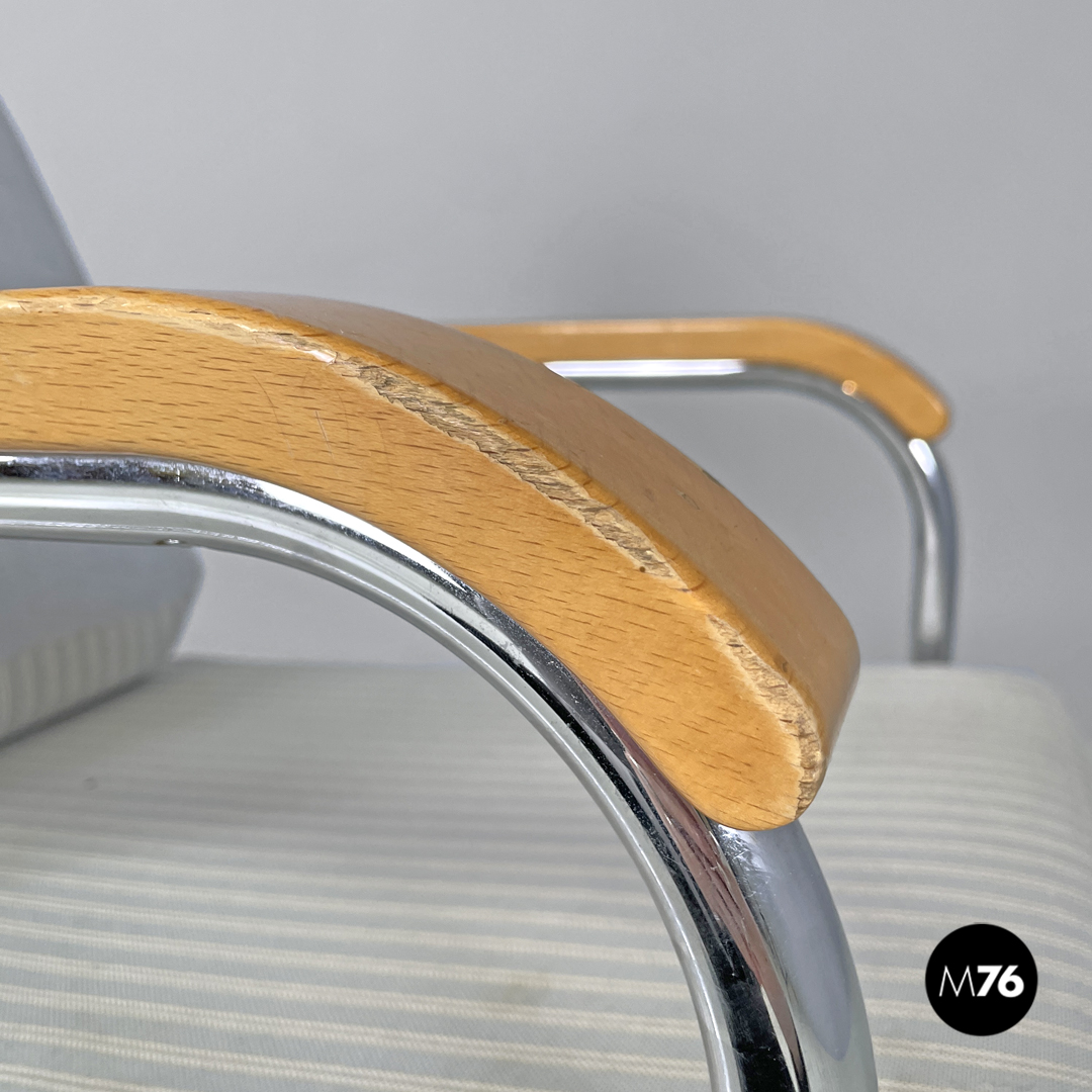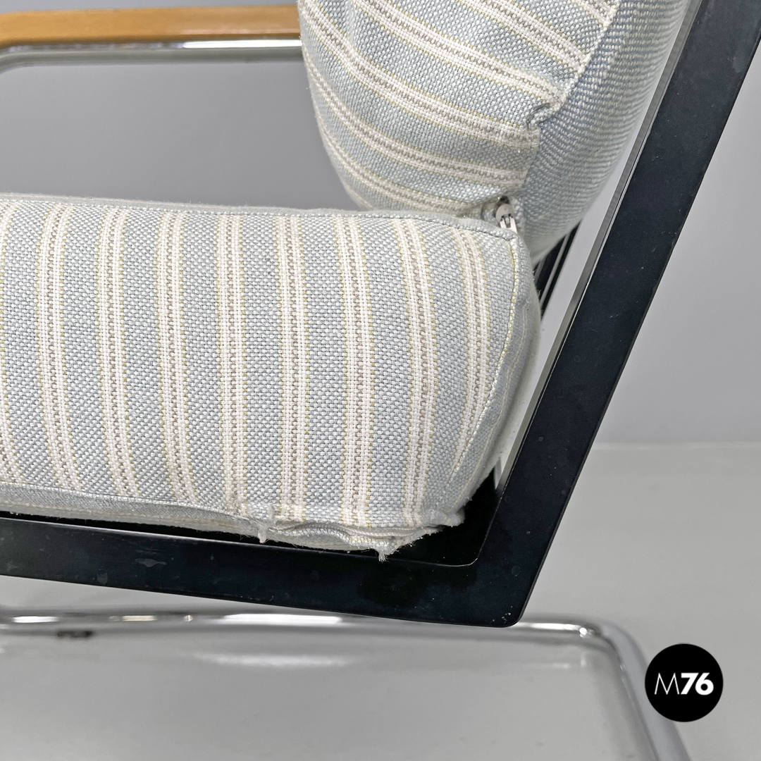 Poltrona modello 1435 a base rettangolare. La seduta e lo schienale sono composti da due cuscini imbottiti rivestiti di due tessuti differenti: uno celeste e uno celeste a righe bianche. La struttura è in tondino di metallo cromato ed ha i braccioli in legno a sezione rettangolare. La struttura interna è in metallo nero con fasce elastiche sulla seduta, ed ha due modalità di inclinazione.