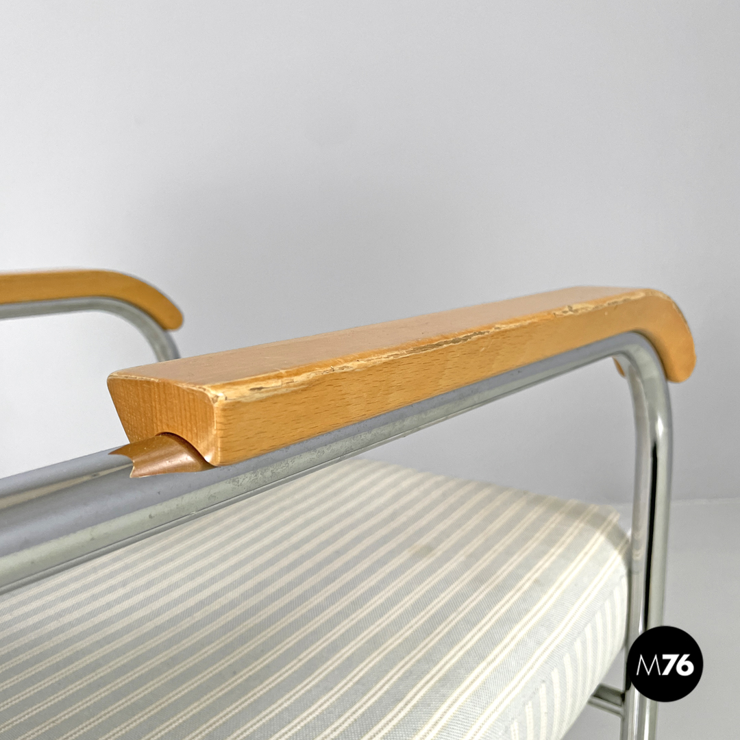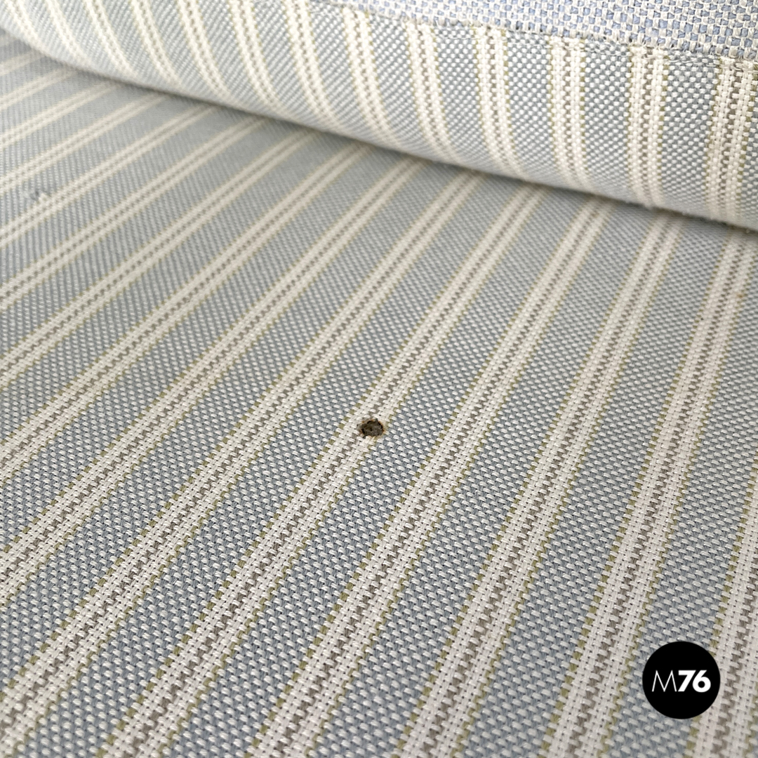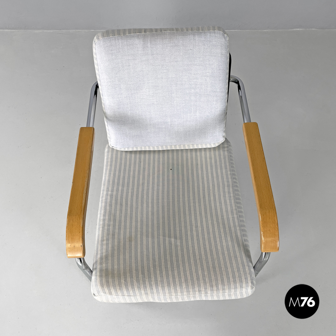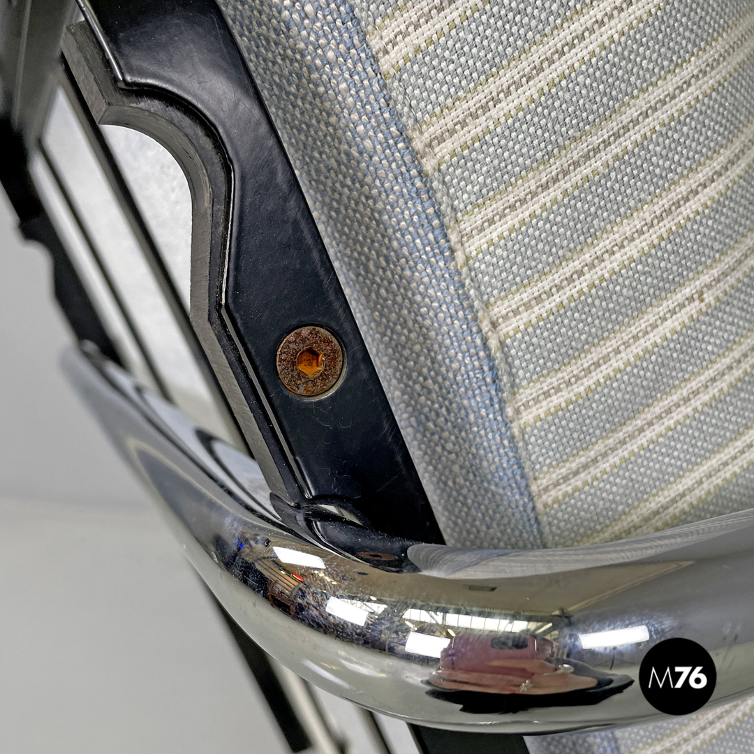 Poltrona modello 1435 a base rettangolare. La seduta e lo schienale sono composti da due cuscini imbottiti rivestiti di due tessuti differenti: uno celeste e uno celeste a righe bianche. La struttura è in tondino di metallo cromato ed ha i braccioli in legno a sezione rettangolare. La struttura interna è in metallo nero con fasce elastiche sulla seduta, ed ha due modalità di inclinazione.