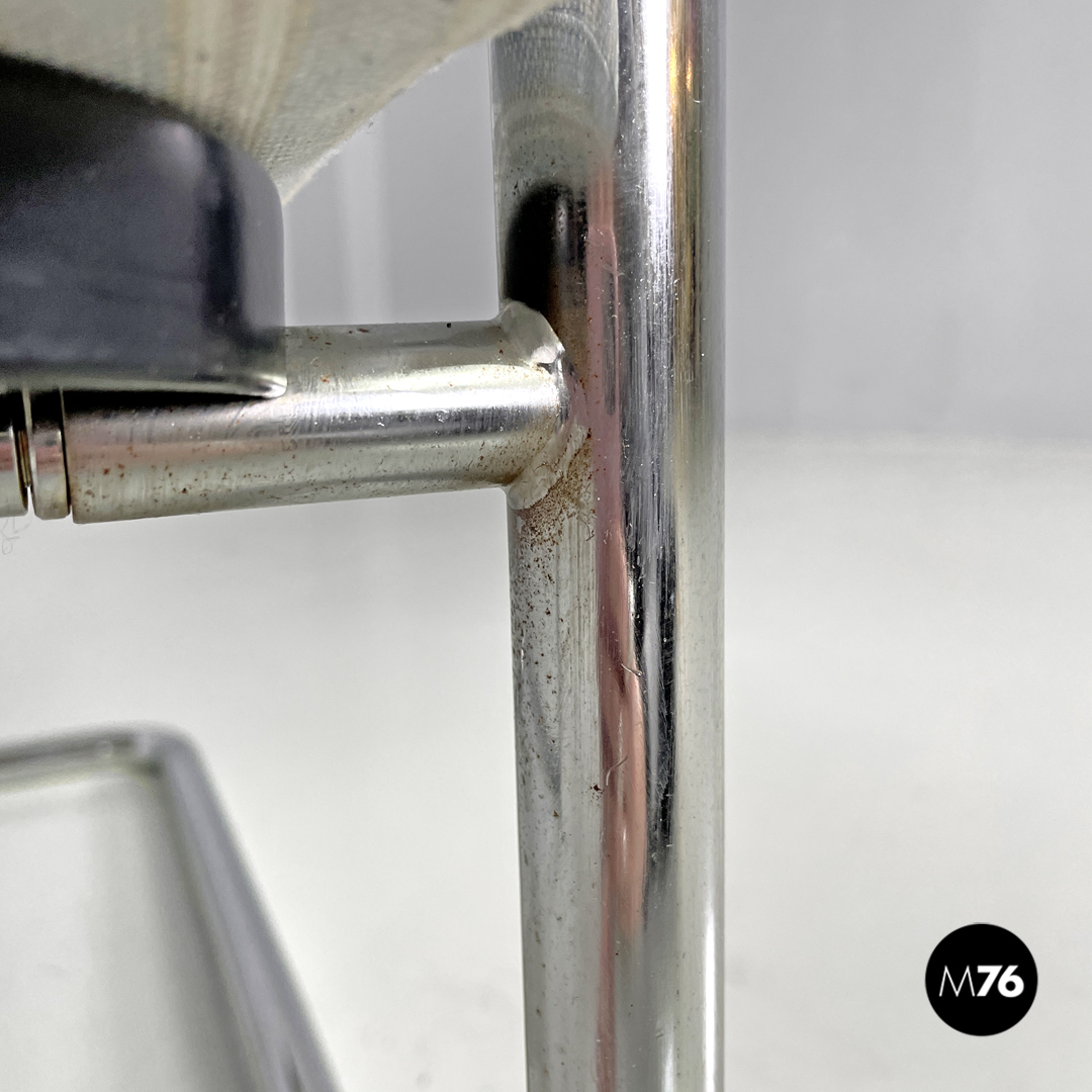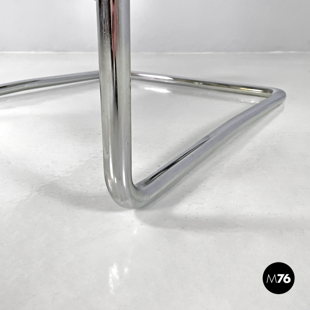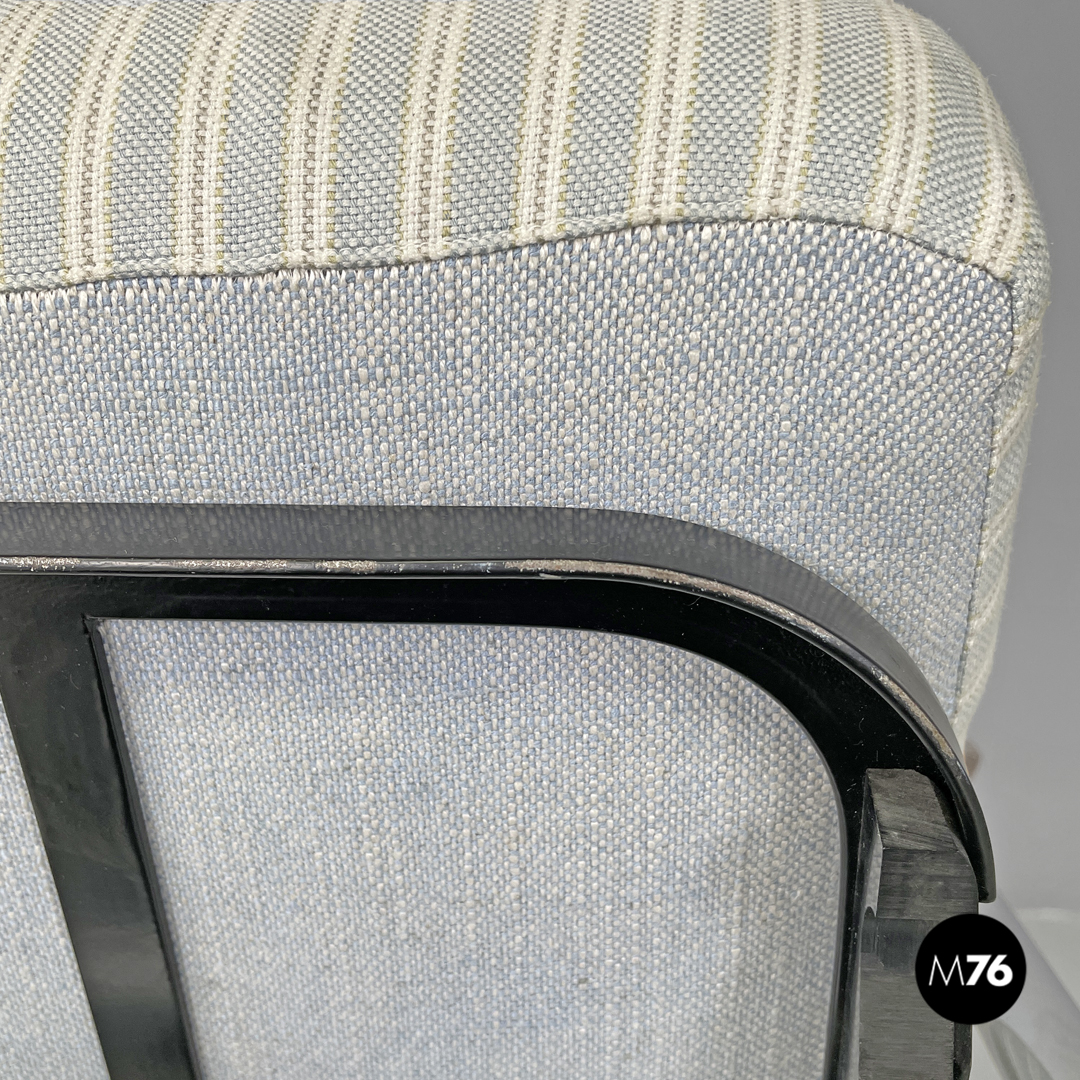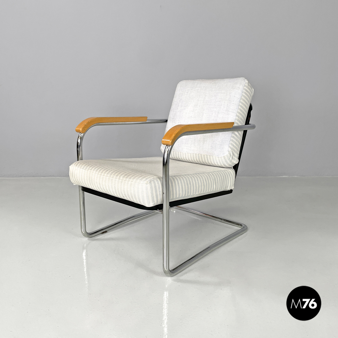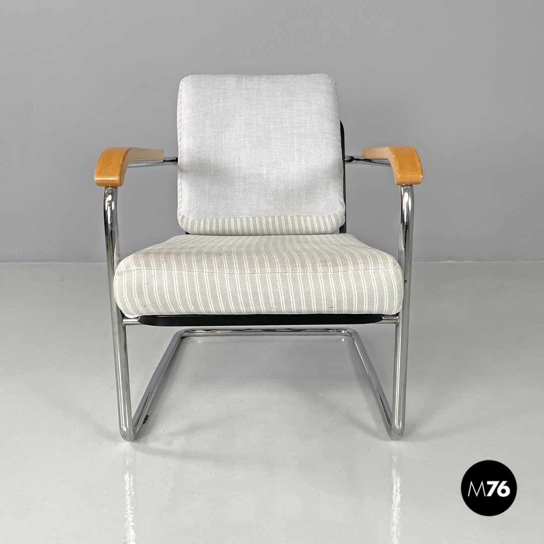 Poltrona modello 1435 a base rettangolare. La seduta e lo schienale sono composti da due cuscini imbottiti rivestiti di due tessuti differenti: uno celeste e uno celeste a righe bianche. La struttura è in tondino di metallo cromato ed ha i braccioli in legno a sezione rettangolare. La struttura interna è in metallo nero con fasce elastiche sulla seduta, ed ha due modalità di inclinazione.
