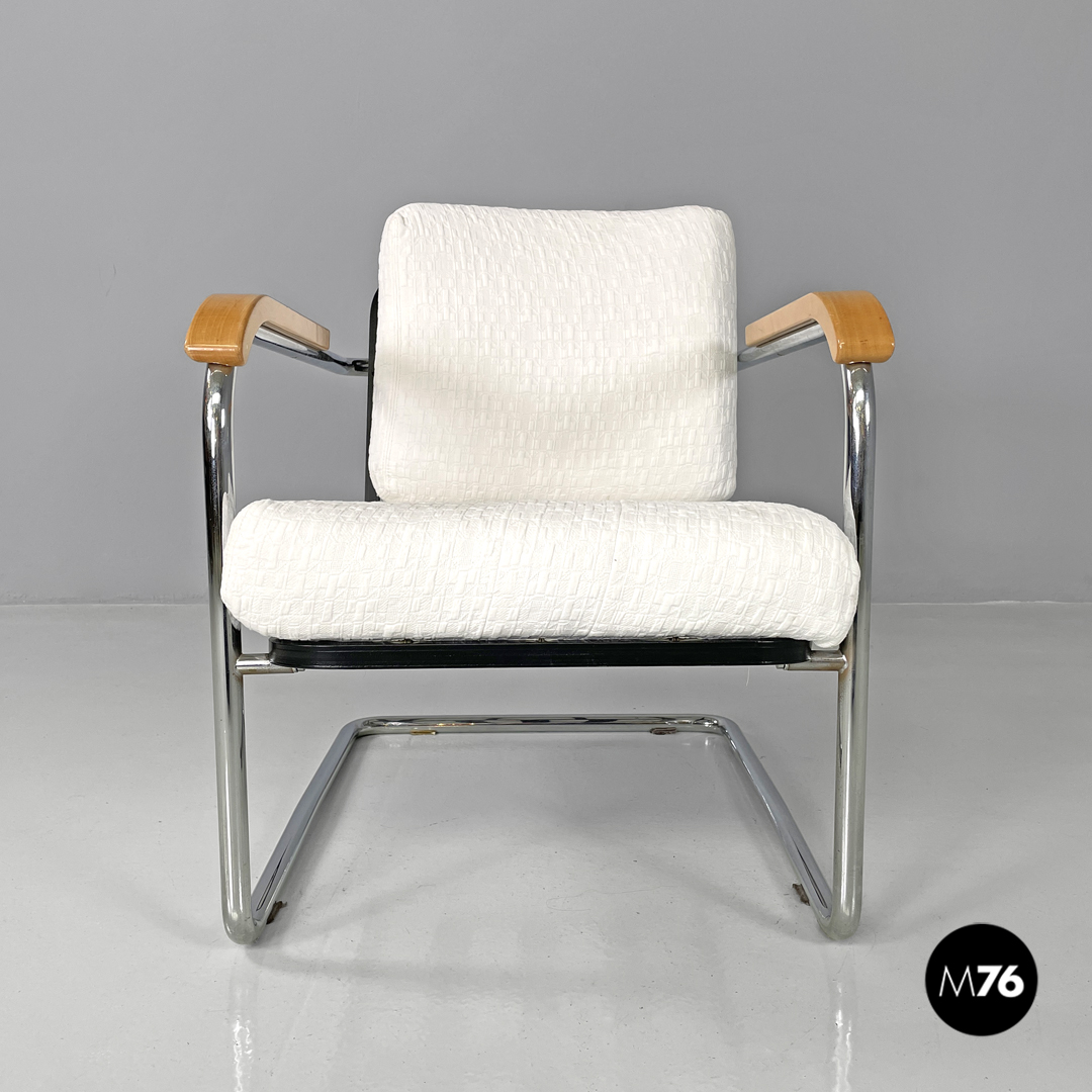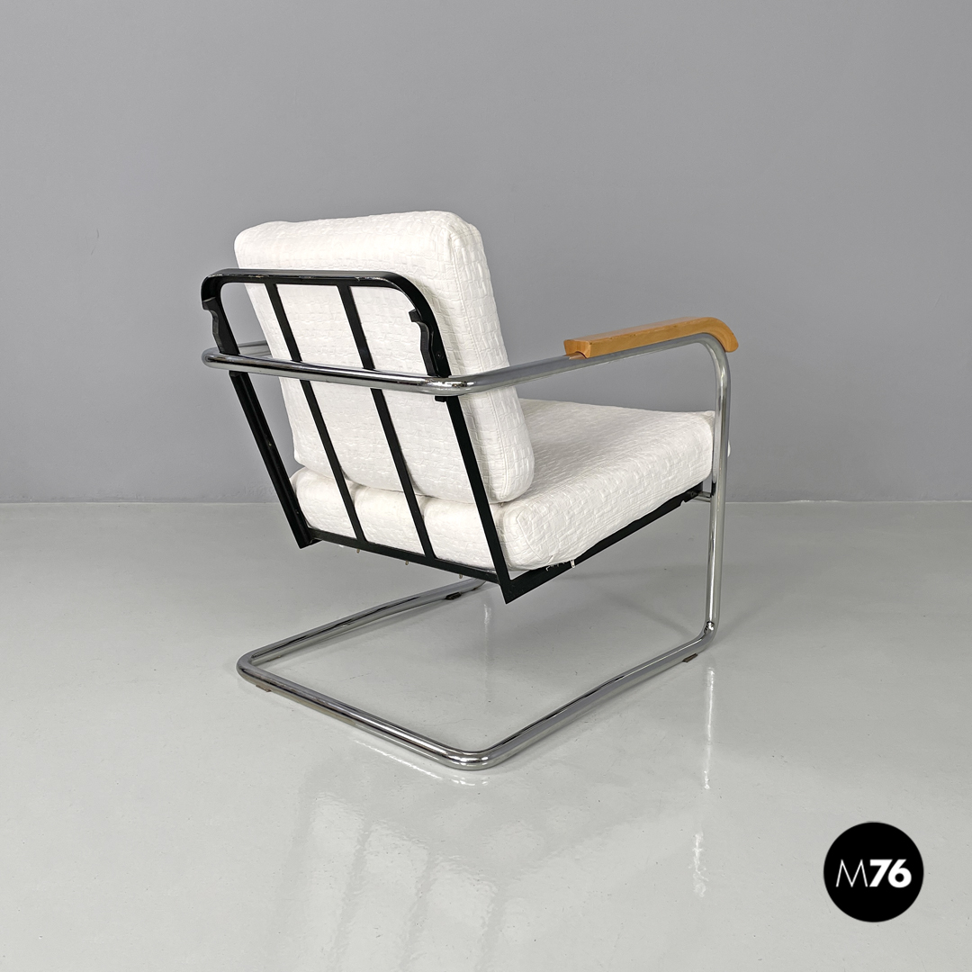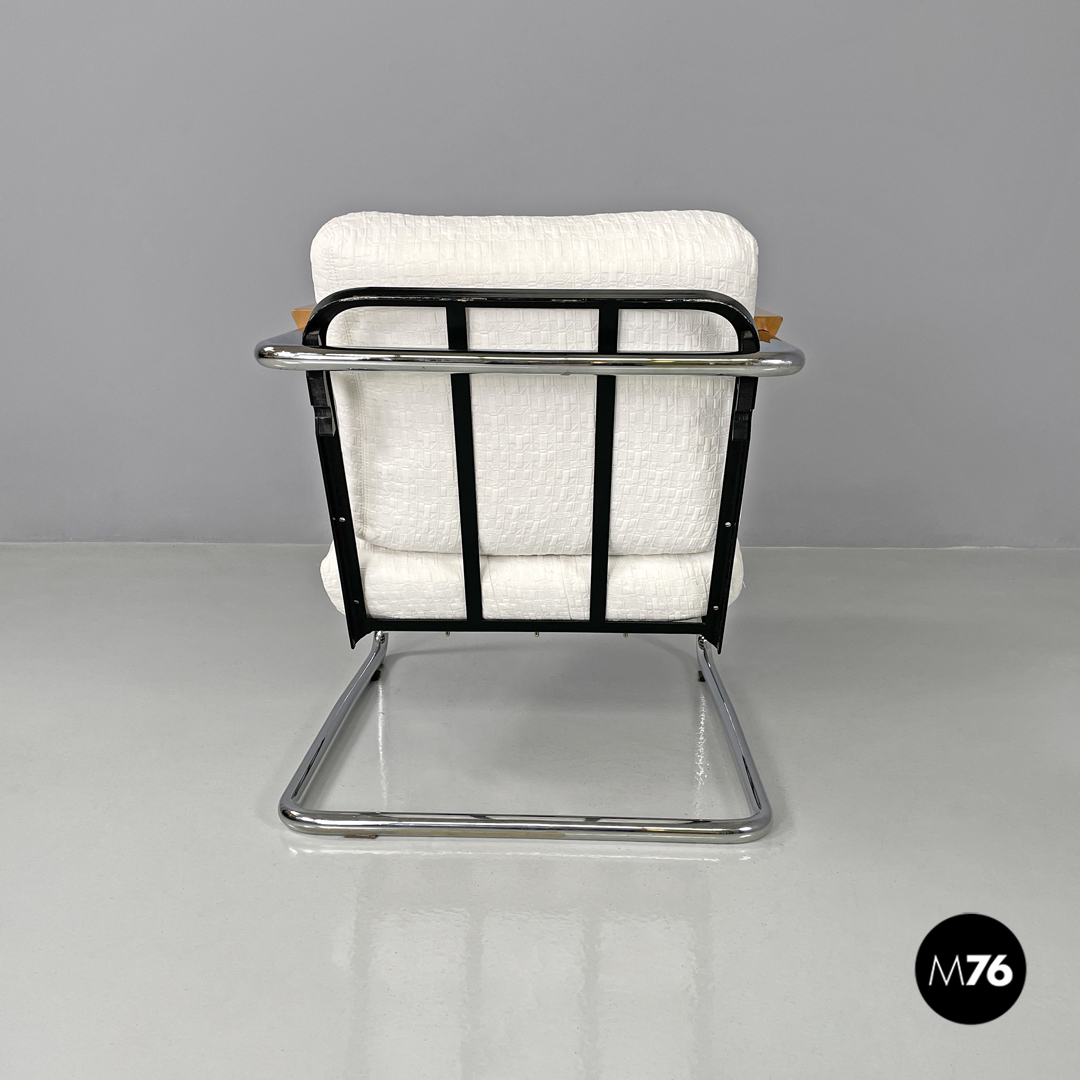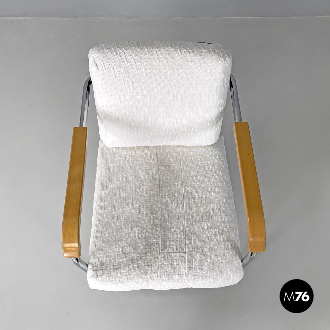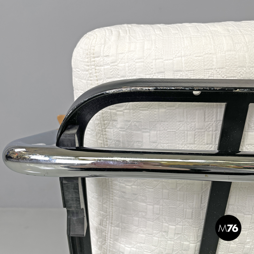 Poltrona modello 1435 a base rettangolare. La seduta e lo schienale sono composti da due cuscini imbottiti rivestiti di tessuto bianco con texture geometrica, la struttura è in tondino di metallo cromato ed ha i braccioli in legno a sezione rettangolare. La struttura interna è in metallo nero con fasce elastiche sulla seduta, ed ha due modalità di inclinazione.