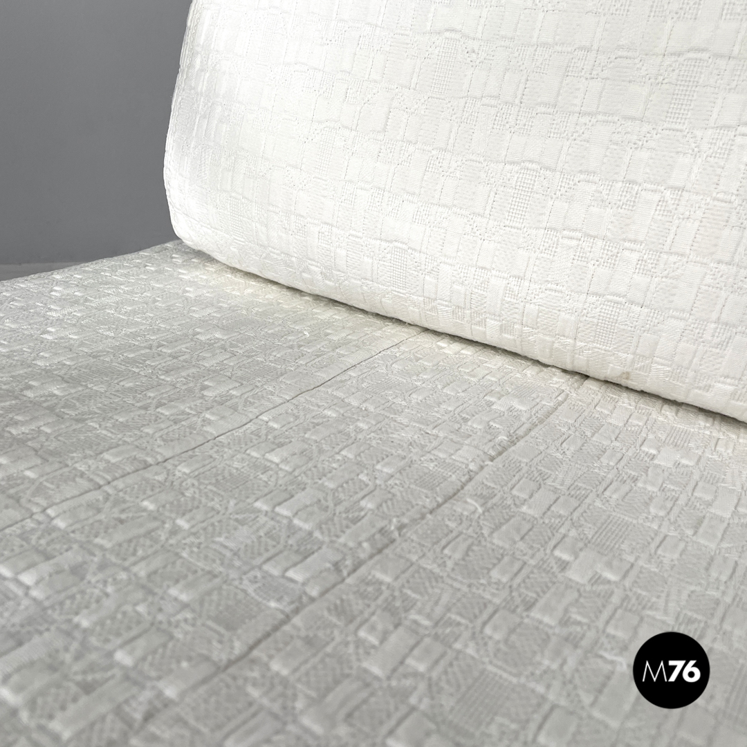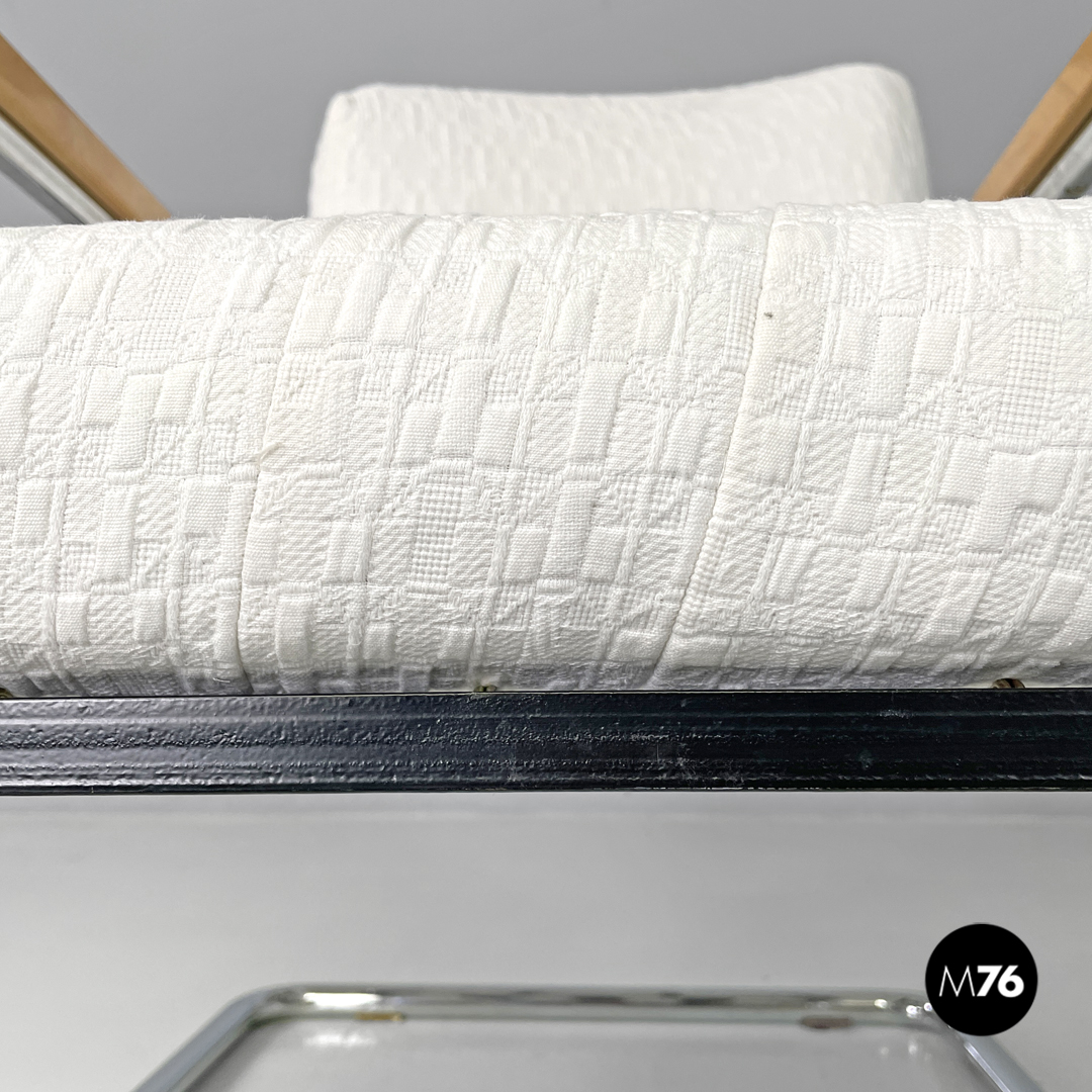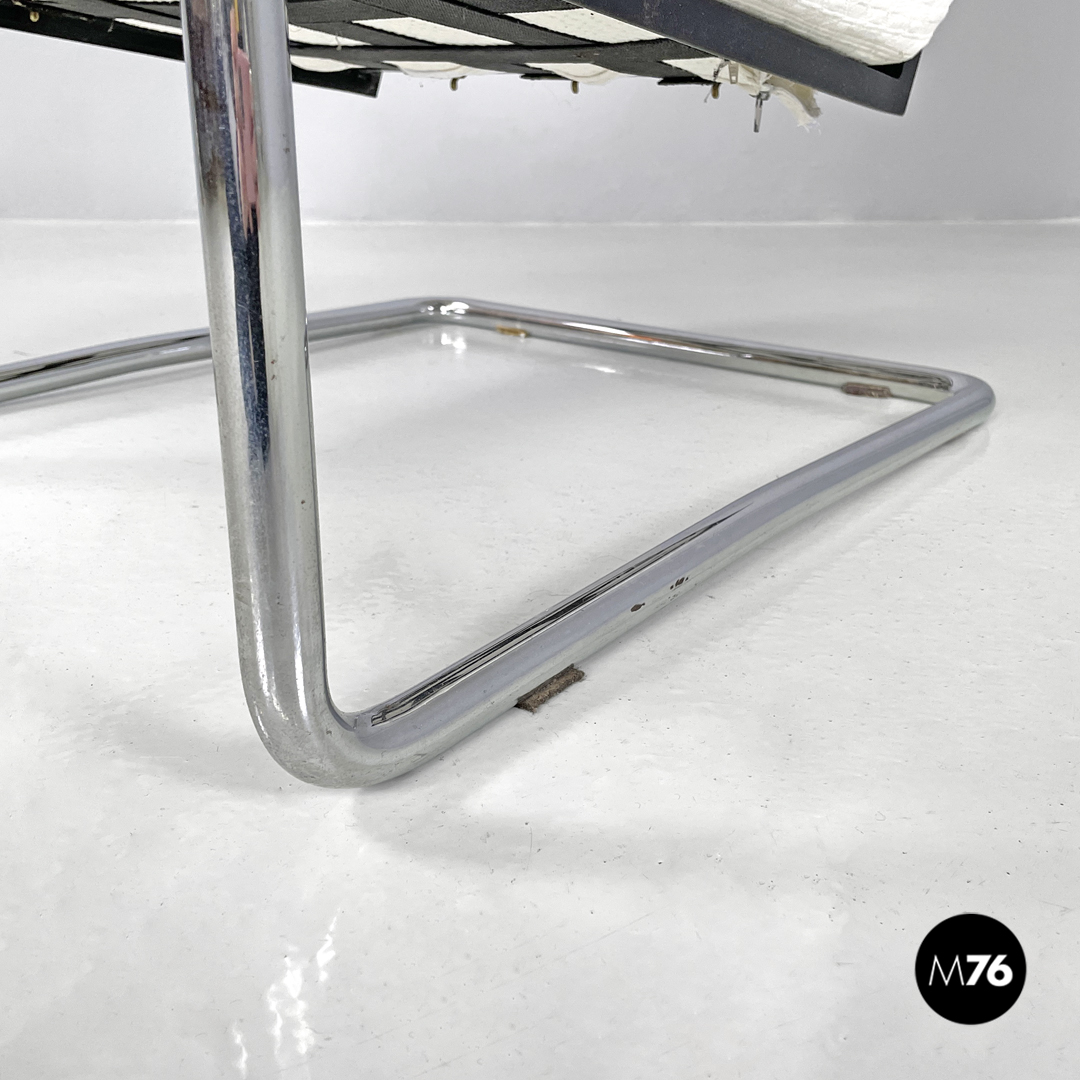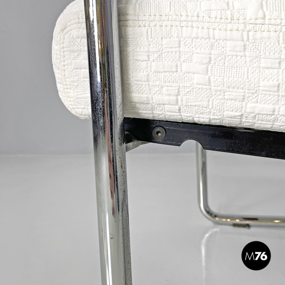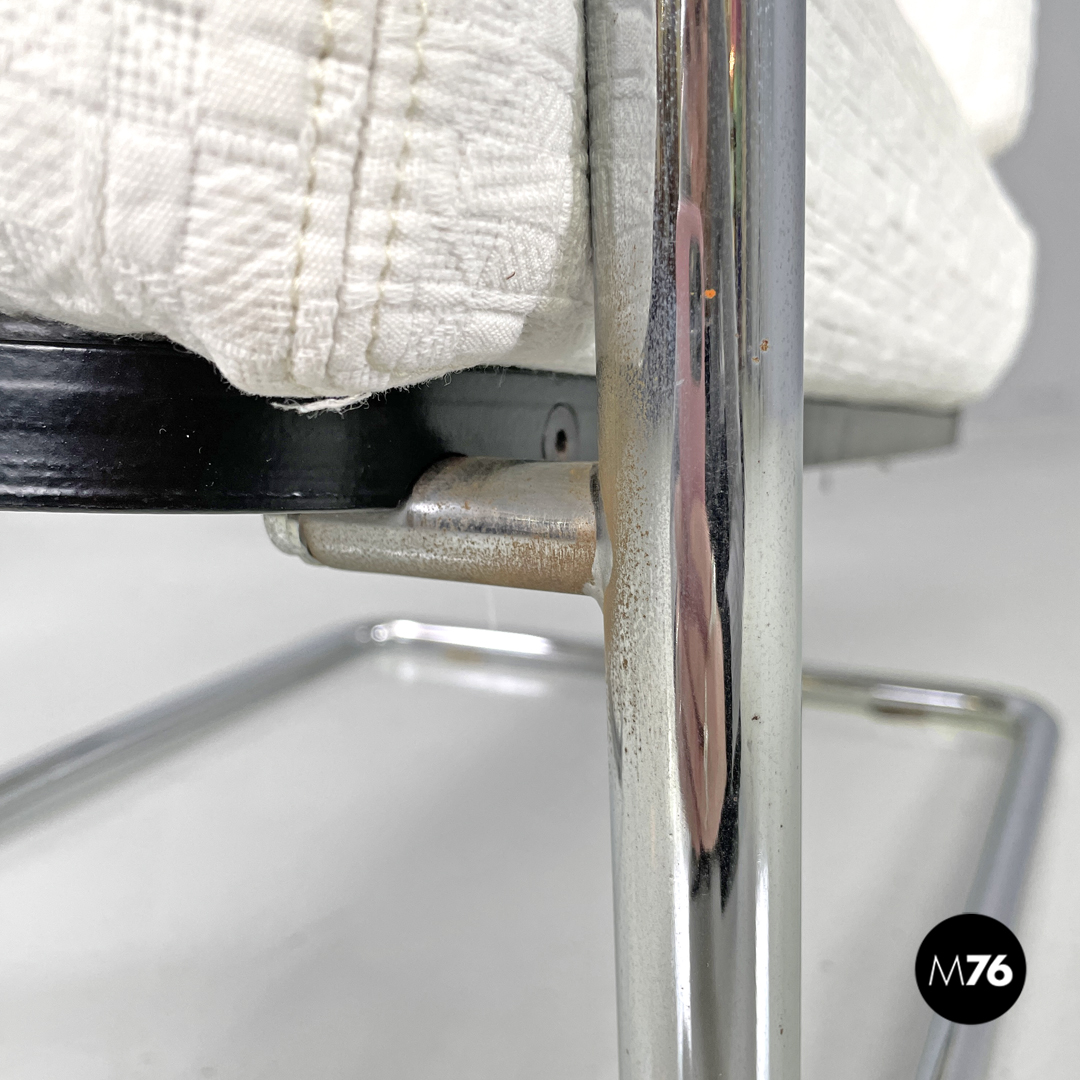 Poltrona modello 1435 a base rettangolare. La seduta e lo schienale sono composti da due cuscini imbottiti rivestiti di tessuto bianco con texture geometrica, la struttura è in tondino di metallo cromato ed ha i braccioli in legno a sezione rettangolare. La struttura interna è in metallo nero con fasce elastiche sulla seduta, ed ha due modalità di inclinazione.