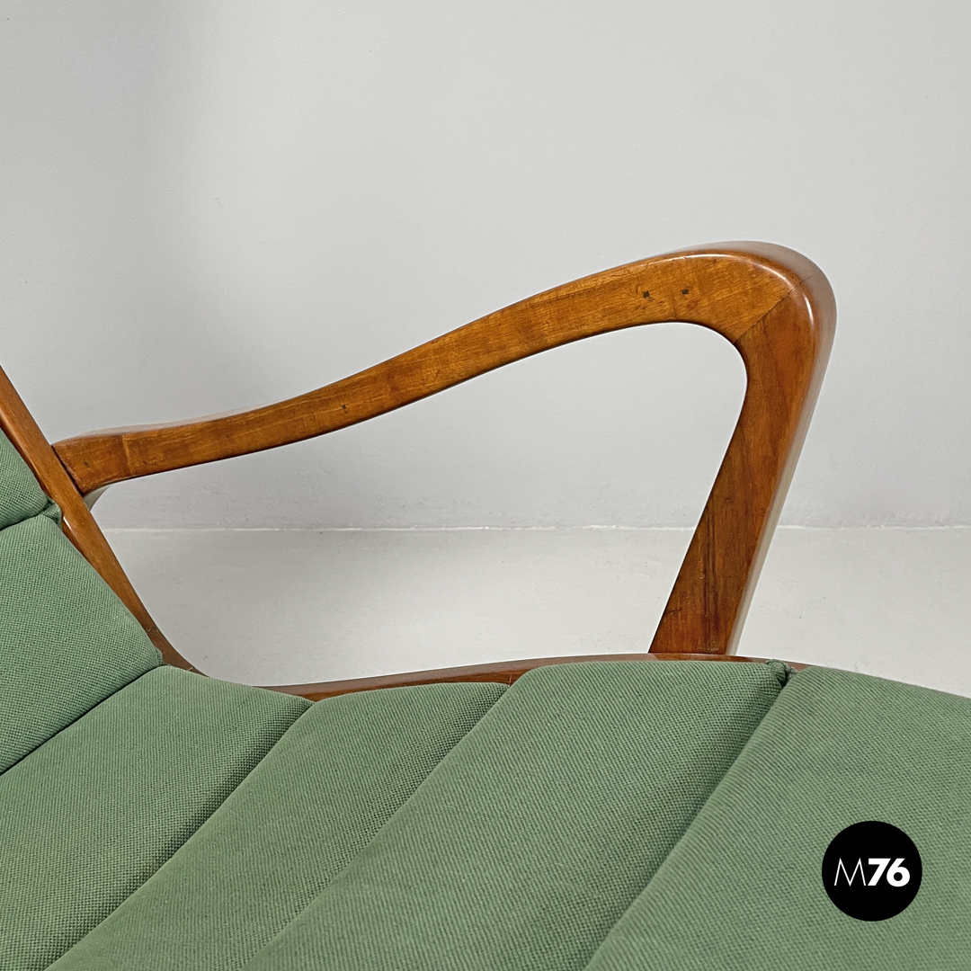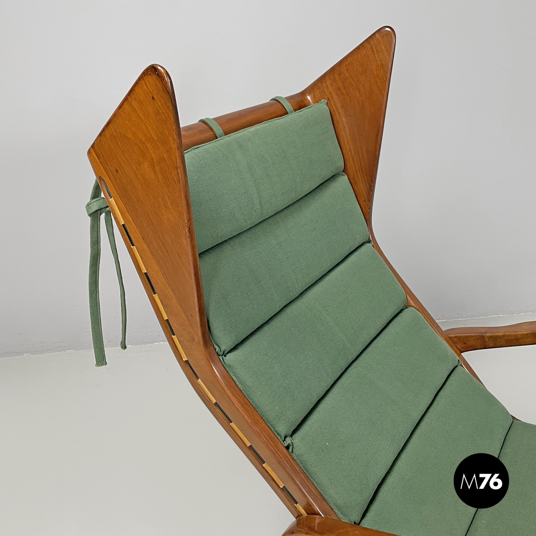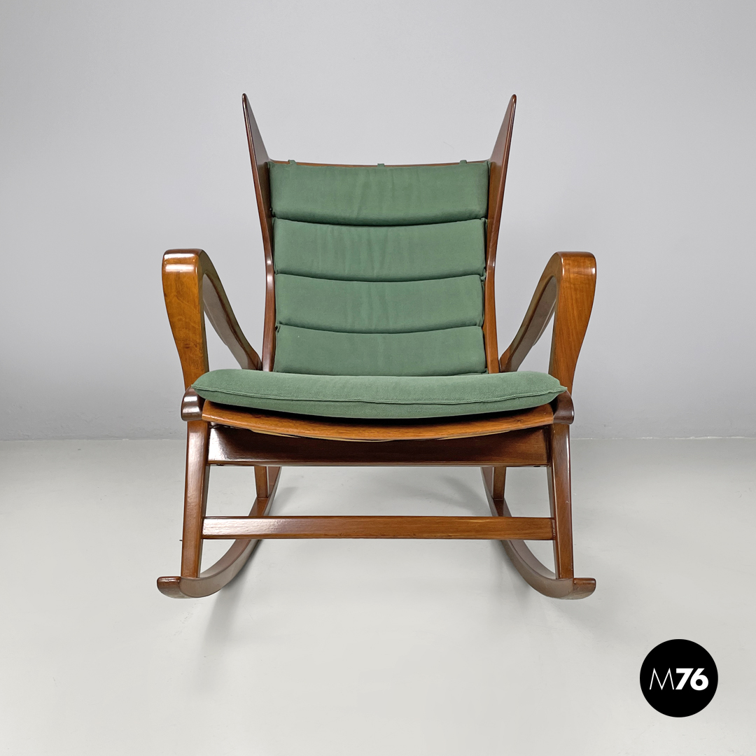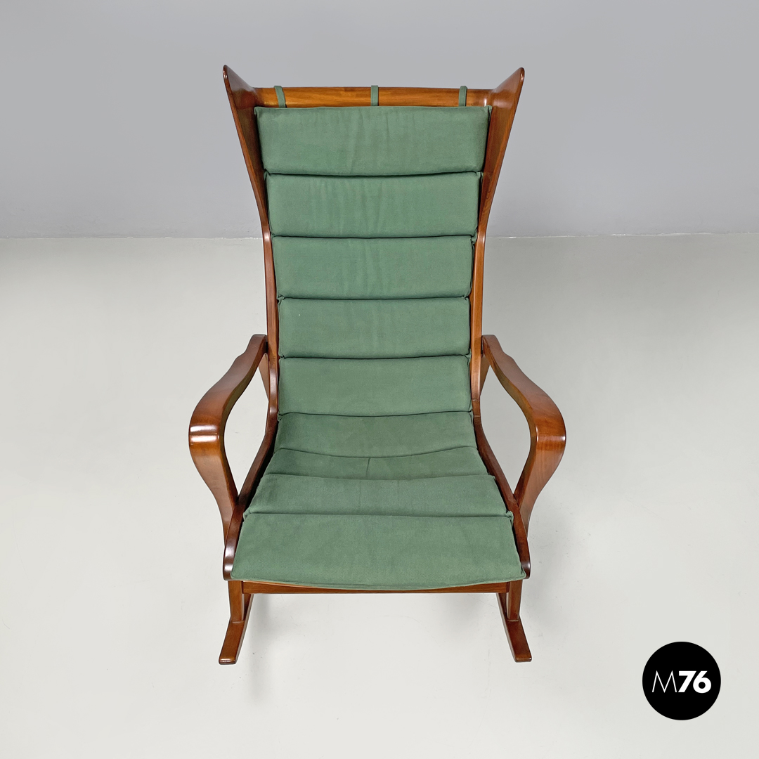 Poltrona a dondolo modello 572 in legno con braccioli. La struttura segue linee slanciate e curve, ai lati della parte alta si trovano due poggiatesta triangolari, l’appoggio a terra è dato da due listelli curvi che permettono il movimento ondulatorio. La seduta e lo schienale presentano un unico cuscino imbottito e rivestito in tessuto verde con cuciture orizzontali, sul retro è presente il telaio di appoggio composto da fasce di gomma gialla che si incastrano sui lati.