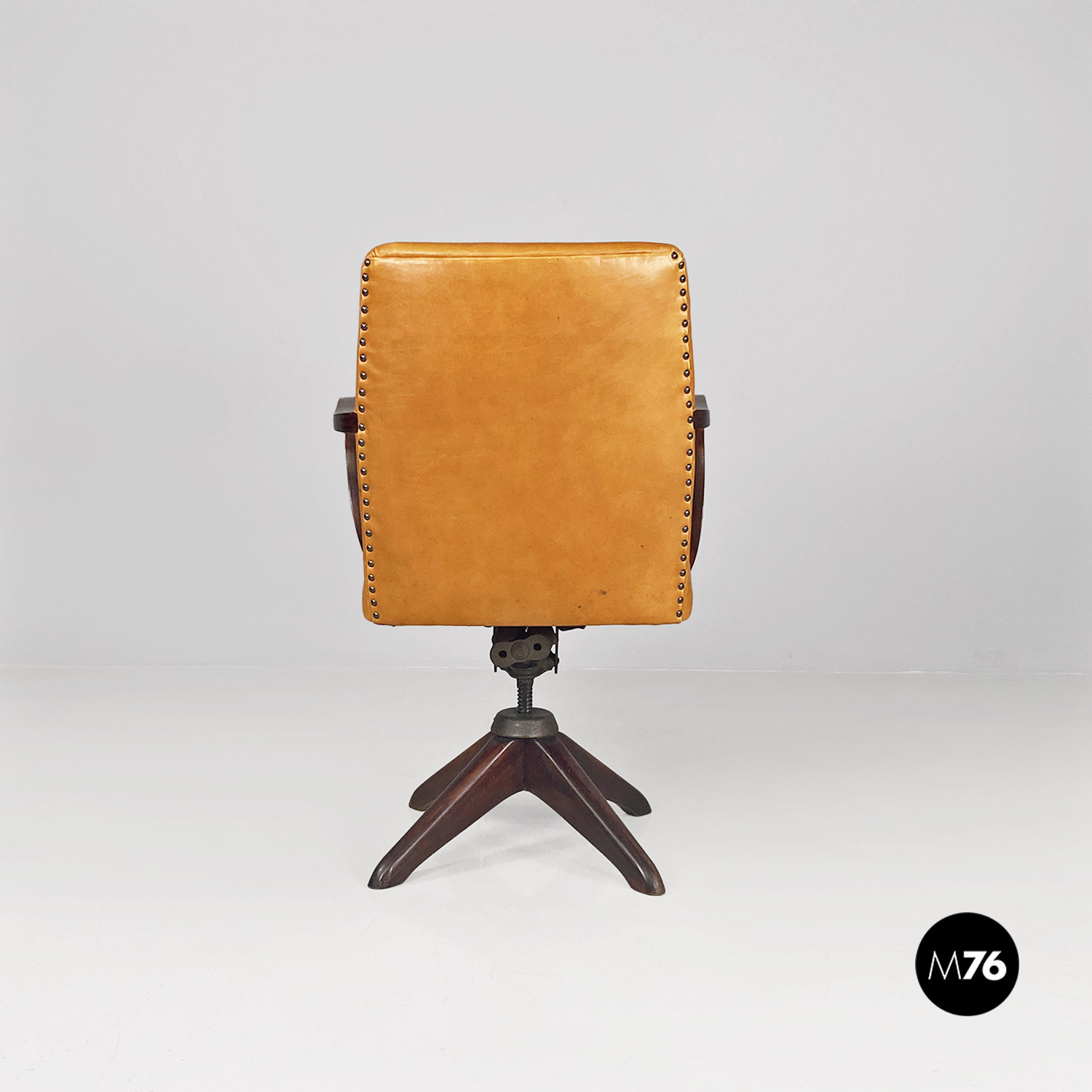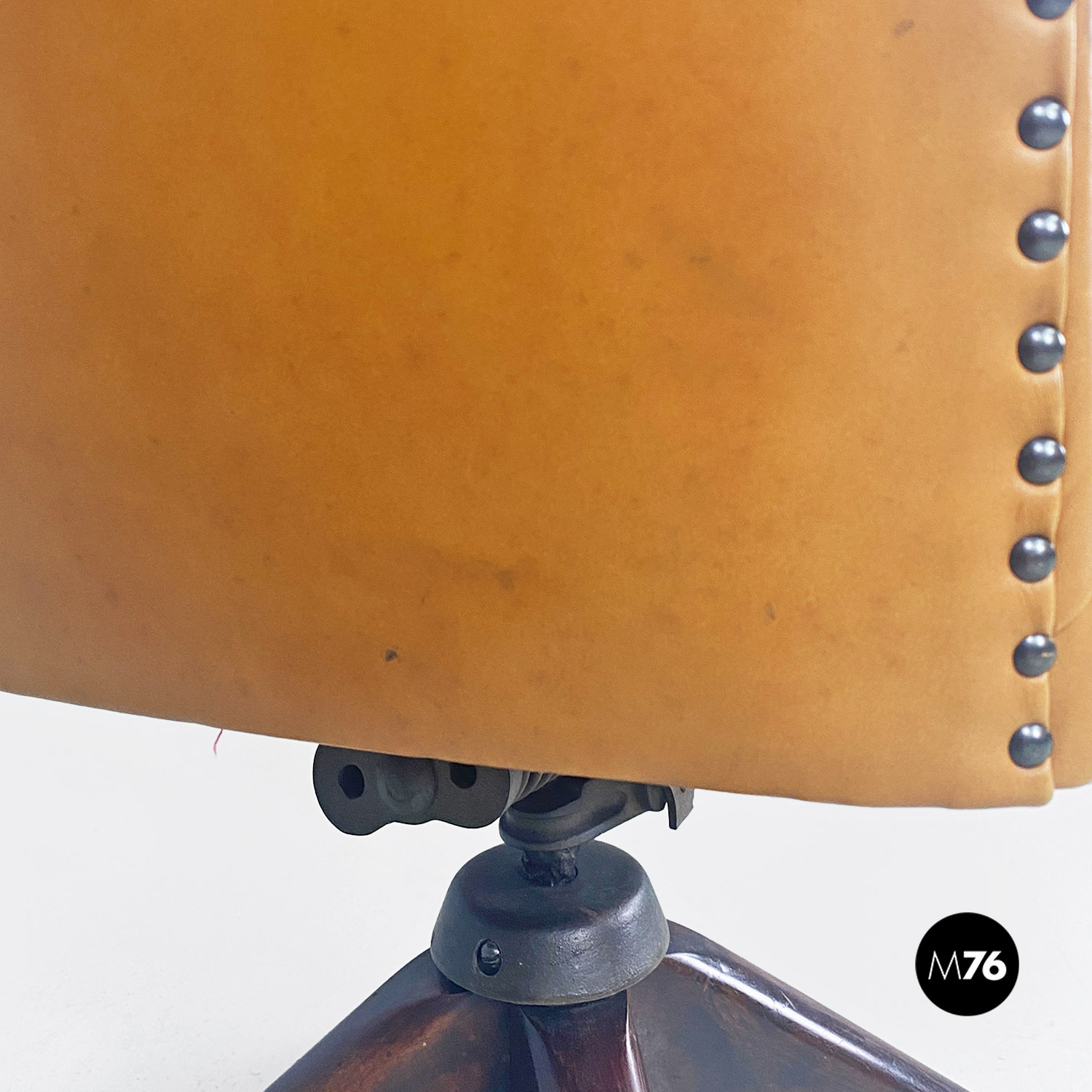 Poltrona da ufficio girevole con struttura in legno, seduta e schienale imbottiti e rivestiti in pelle marrone e rifiniti con borchie in ottone. I braccioli sono in legno curvato e la base, sempre in legno, a quattro razze sagomate.