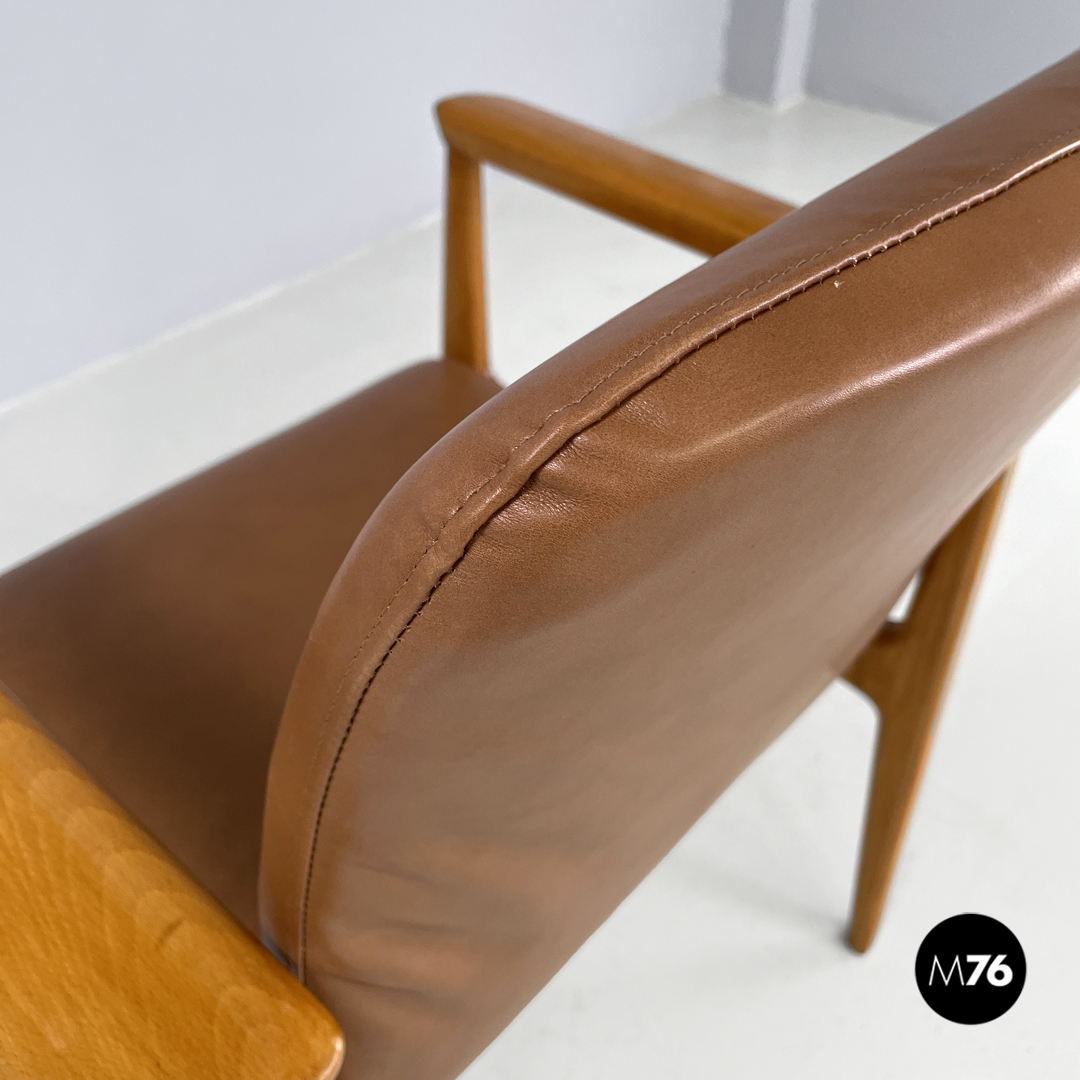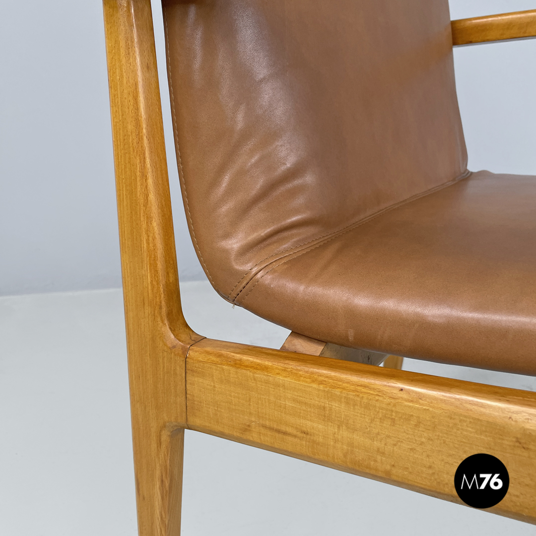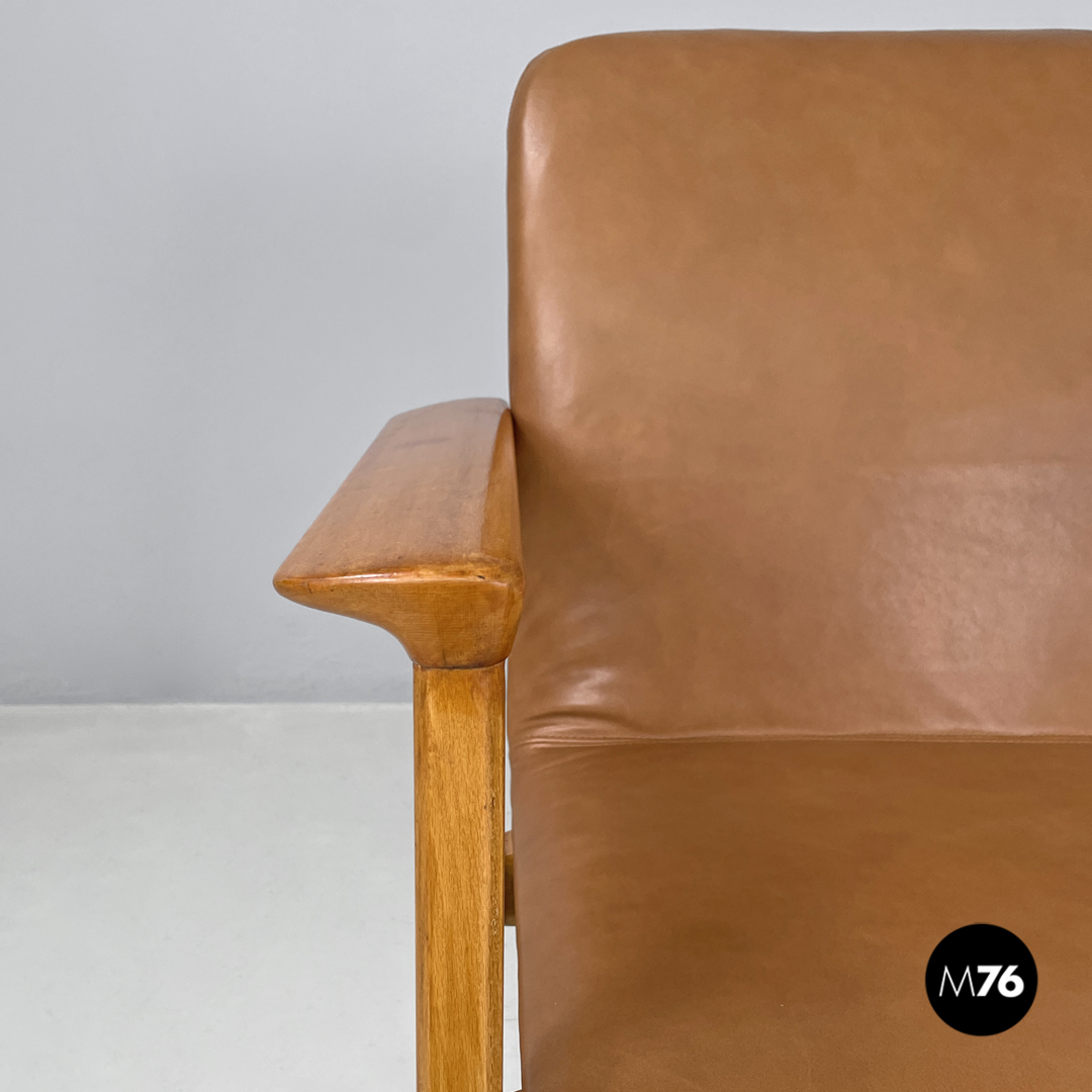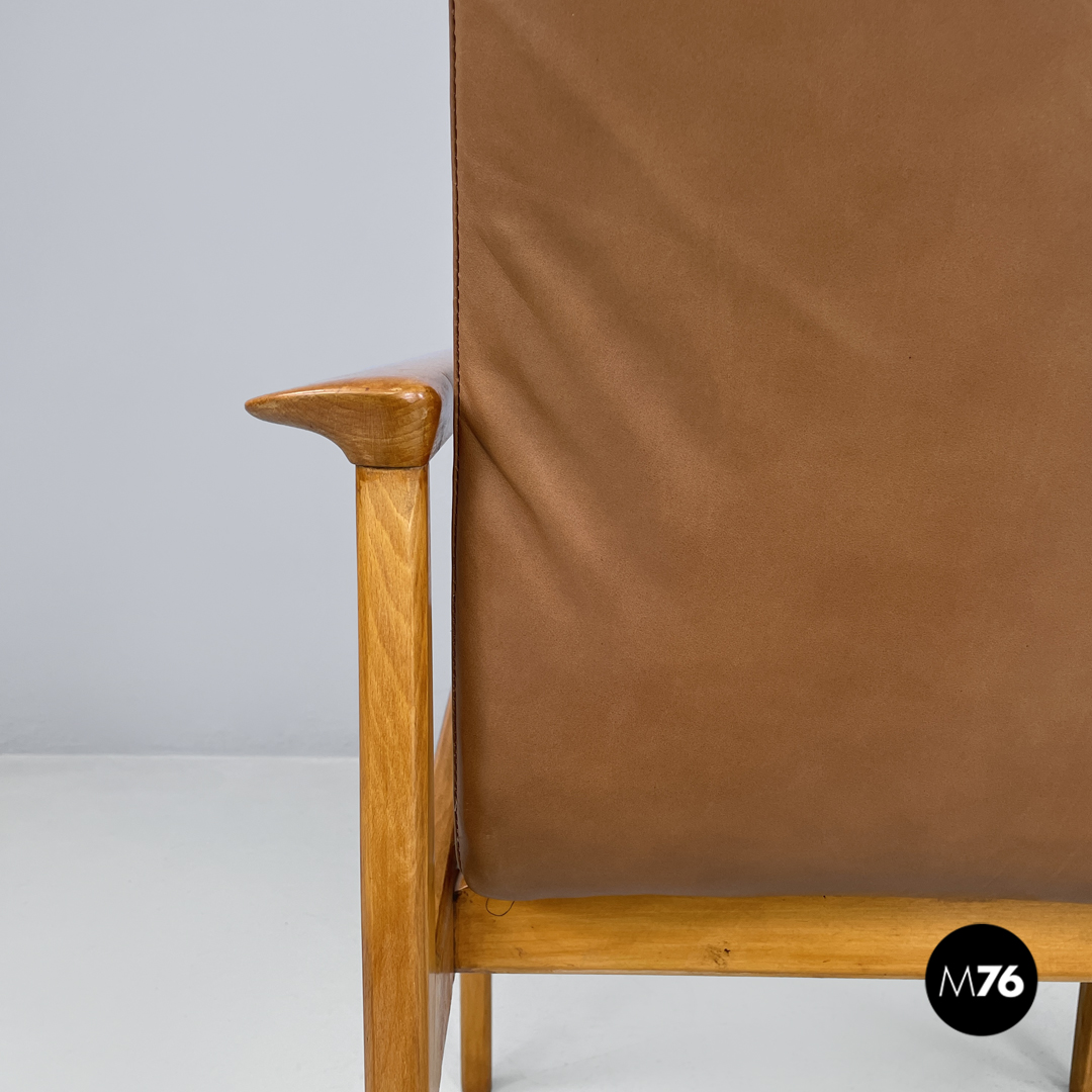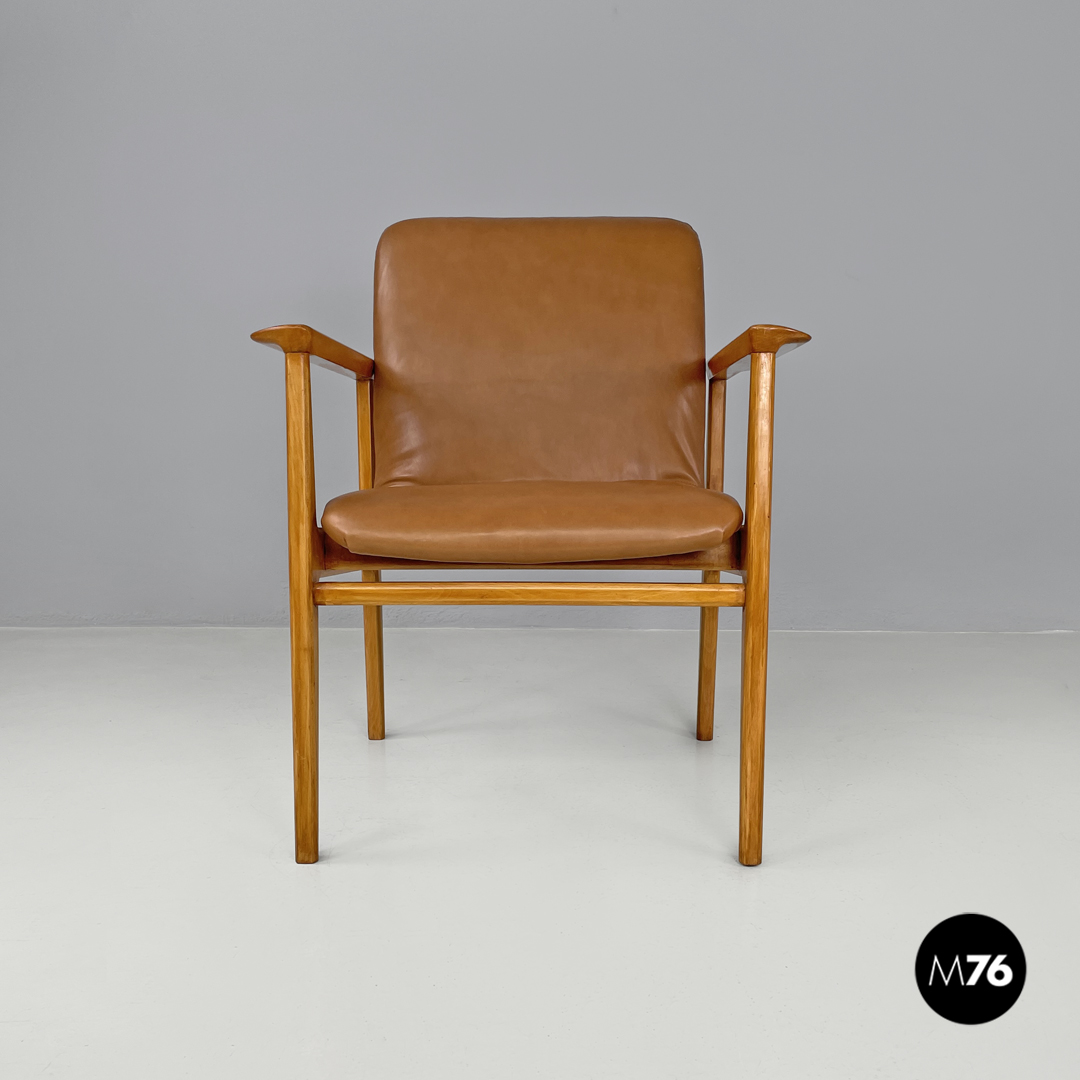 Poltrona con braccioli in legno. La seduta e lo schienale sono composti da un unico elemento con angoli stondati e interamente rivestito in pelle marrone. Le quattro gambe sono a sezione squadrata.