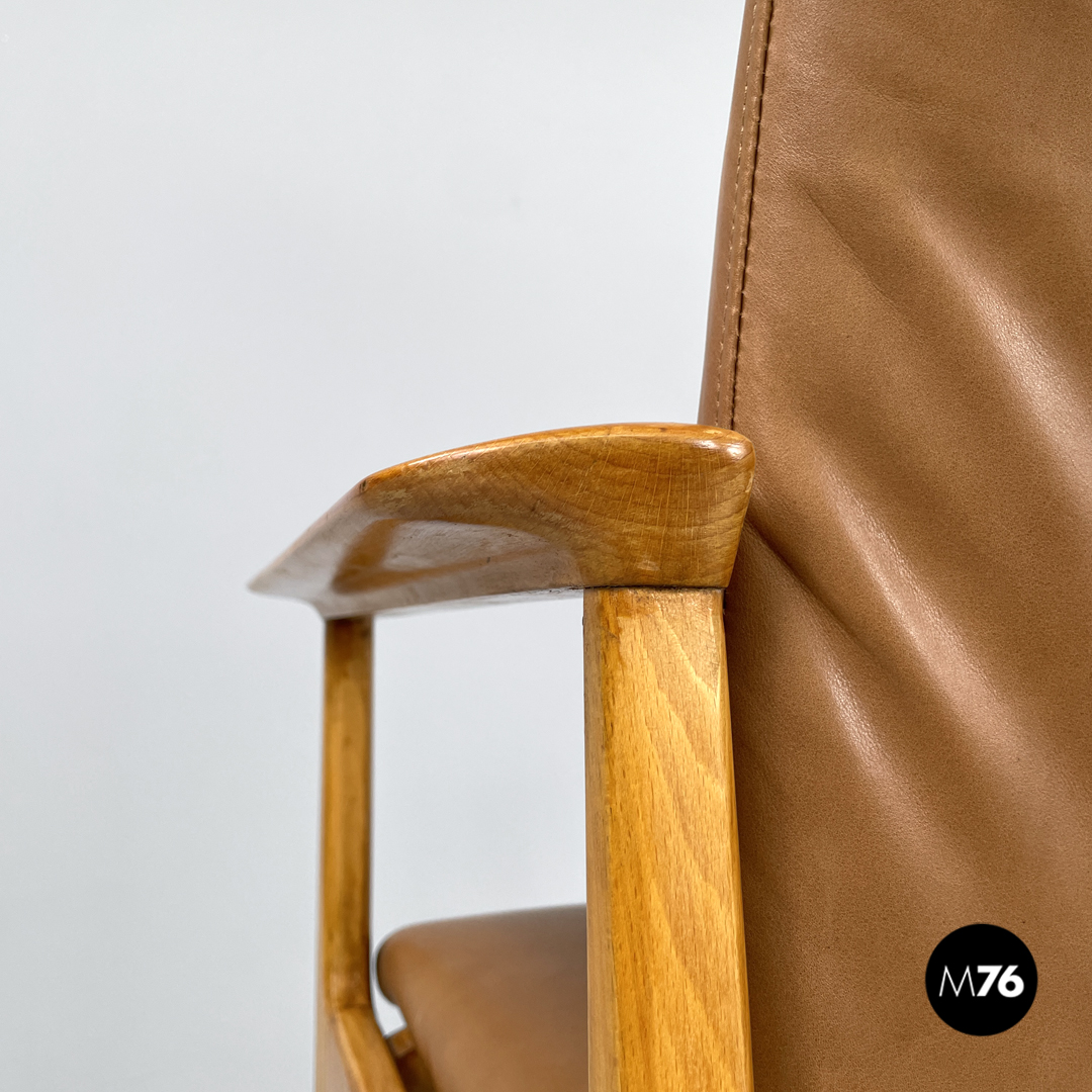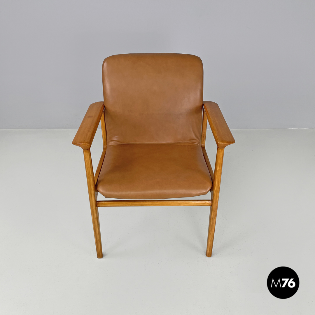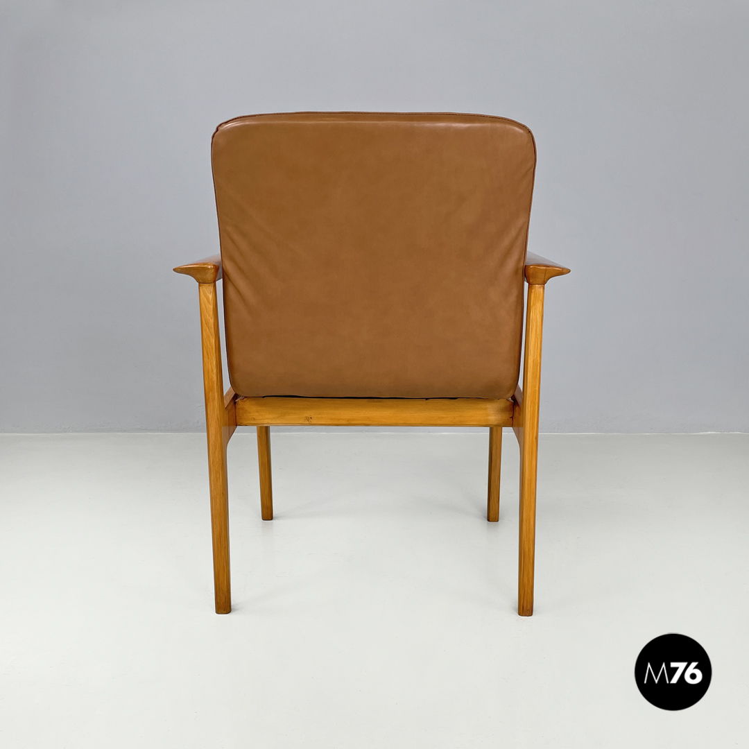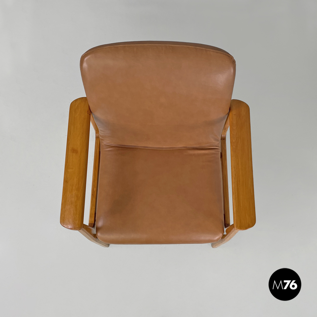 Poltrona con braccioli in legno. La seduta e lo schienale sono composti da un unico elemento con angoli stondati e interamente rivestito in pelle marrone. Le quattro gambe sono a sezione squadrata.