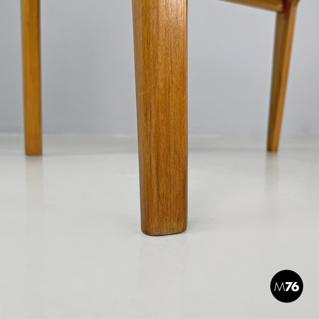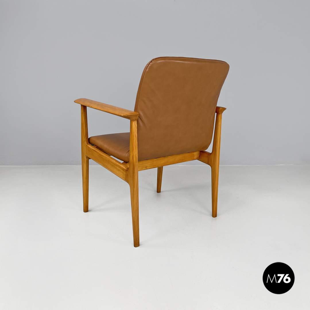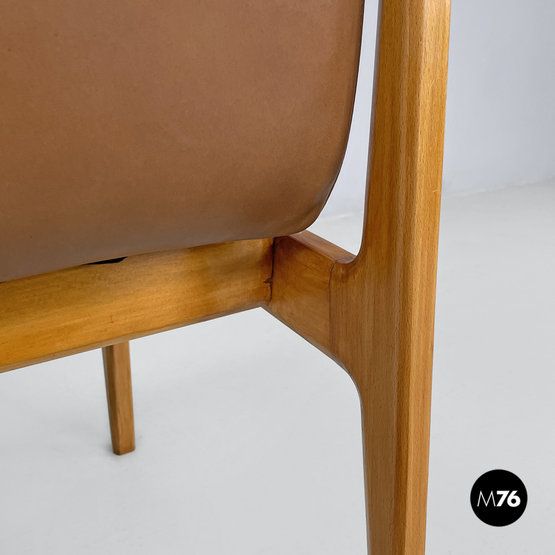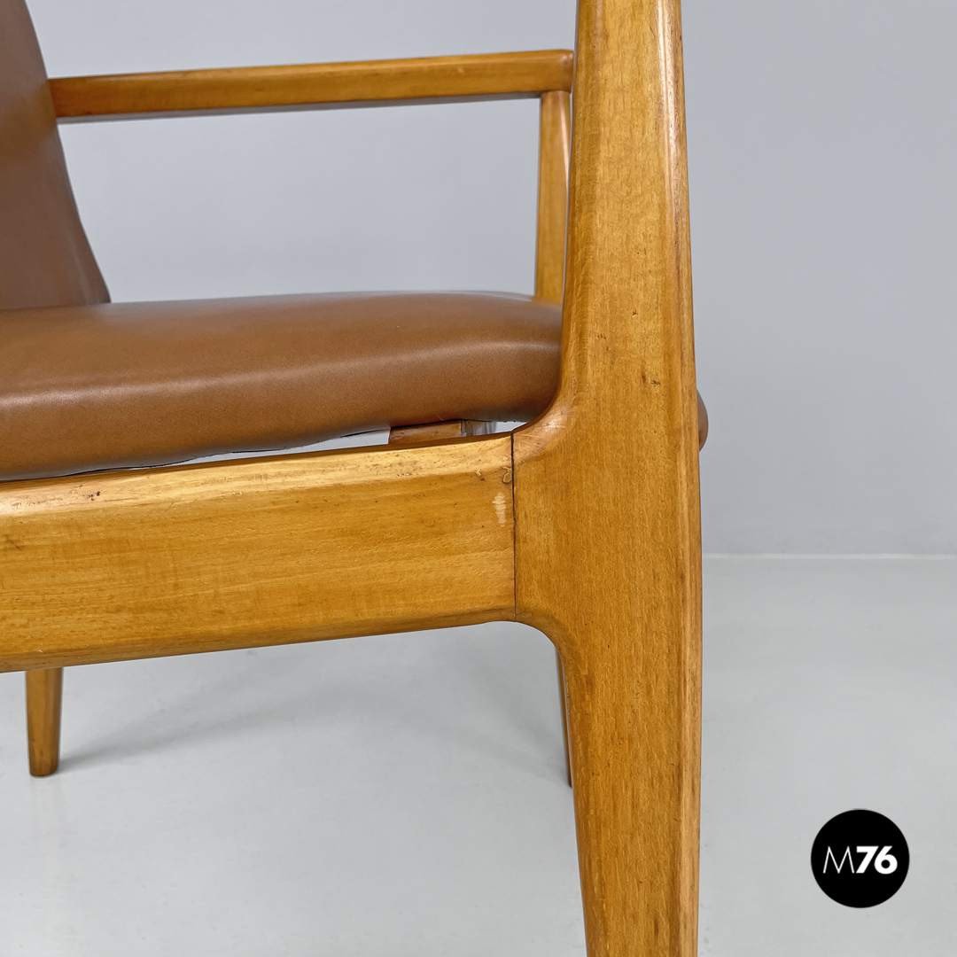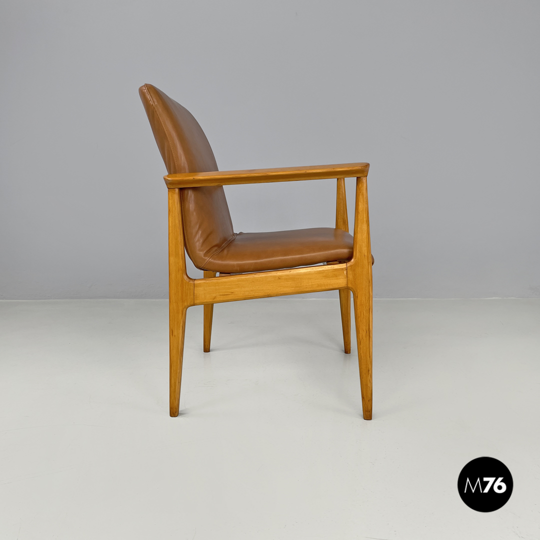 Poltrona con braccioli in legno. La seduta e lo schienale sono composti da un unico elemento con angoli stondati e interamente rivestito in pelle marrone. Le quattro gambe sono a sezione squadrata.
