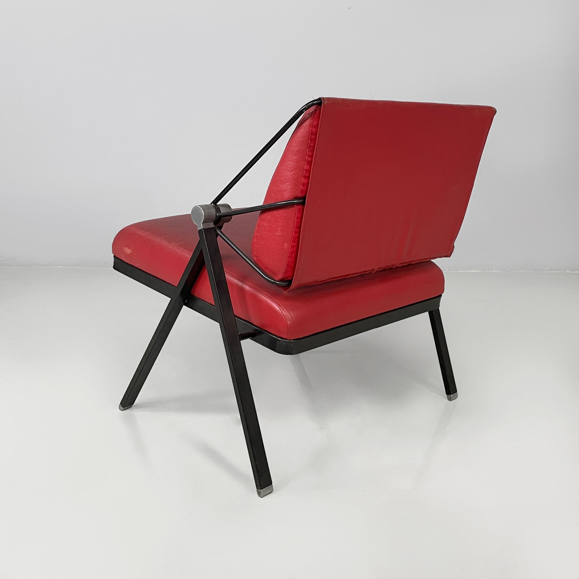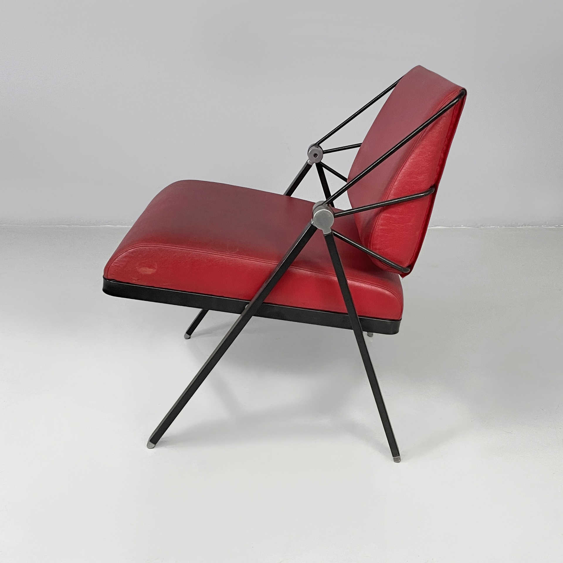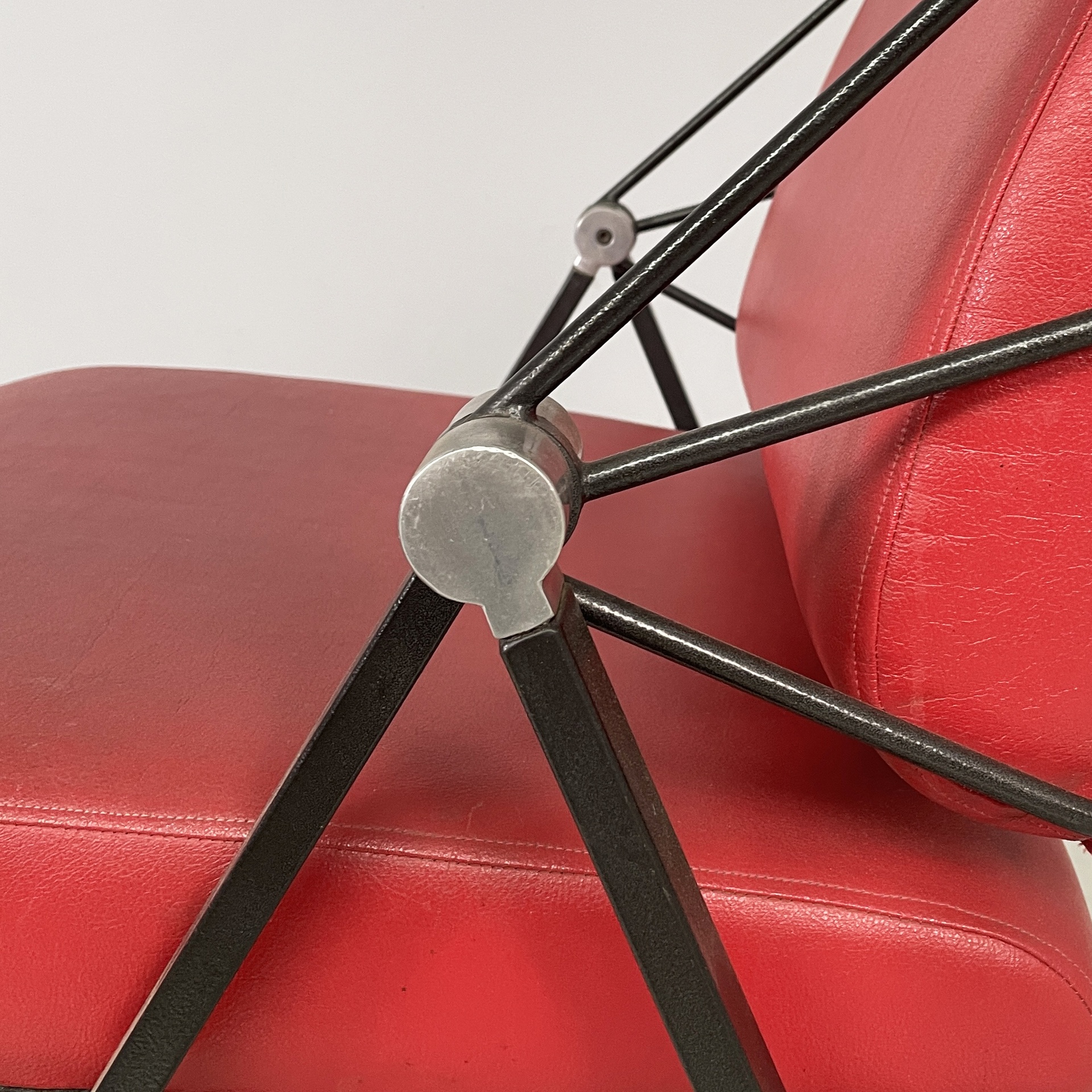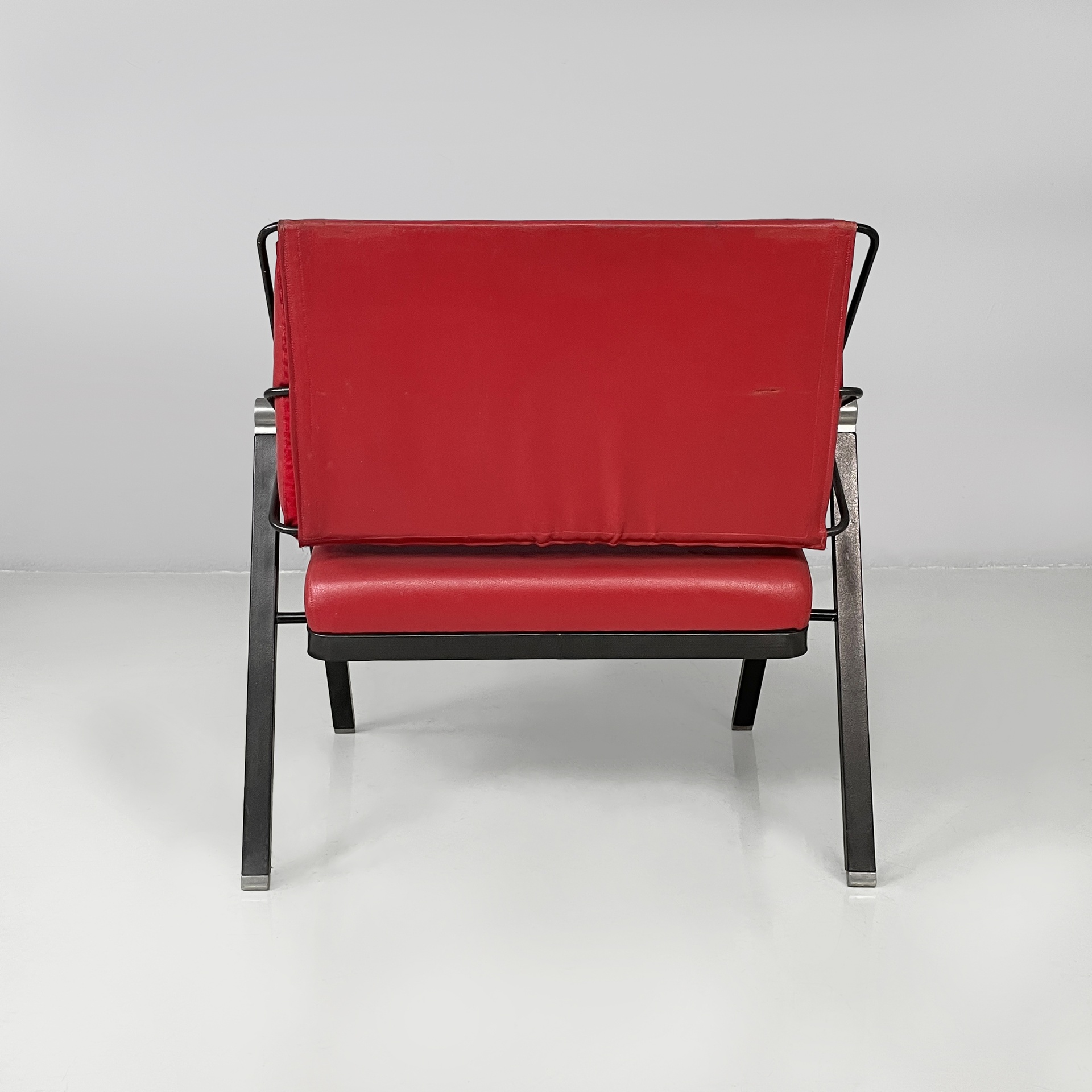 Poltrona con seduta e schienale squadrati, imbottiti e rivestiti in sky rosso. La struttura e le zampe sono in metallo e in metallo verniciato nero.