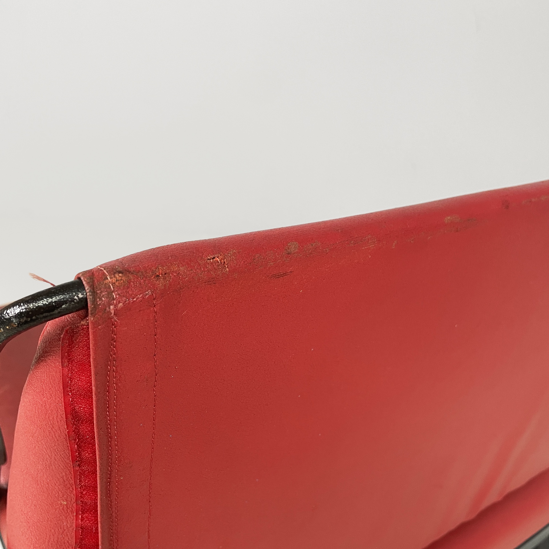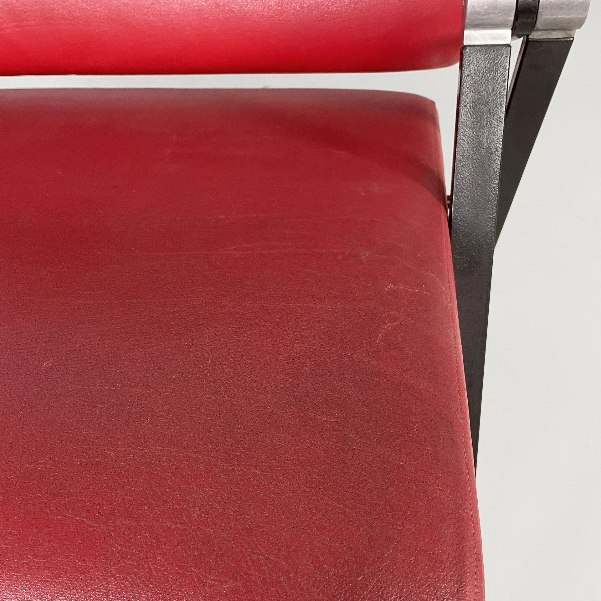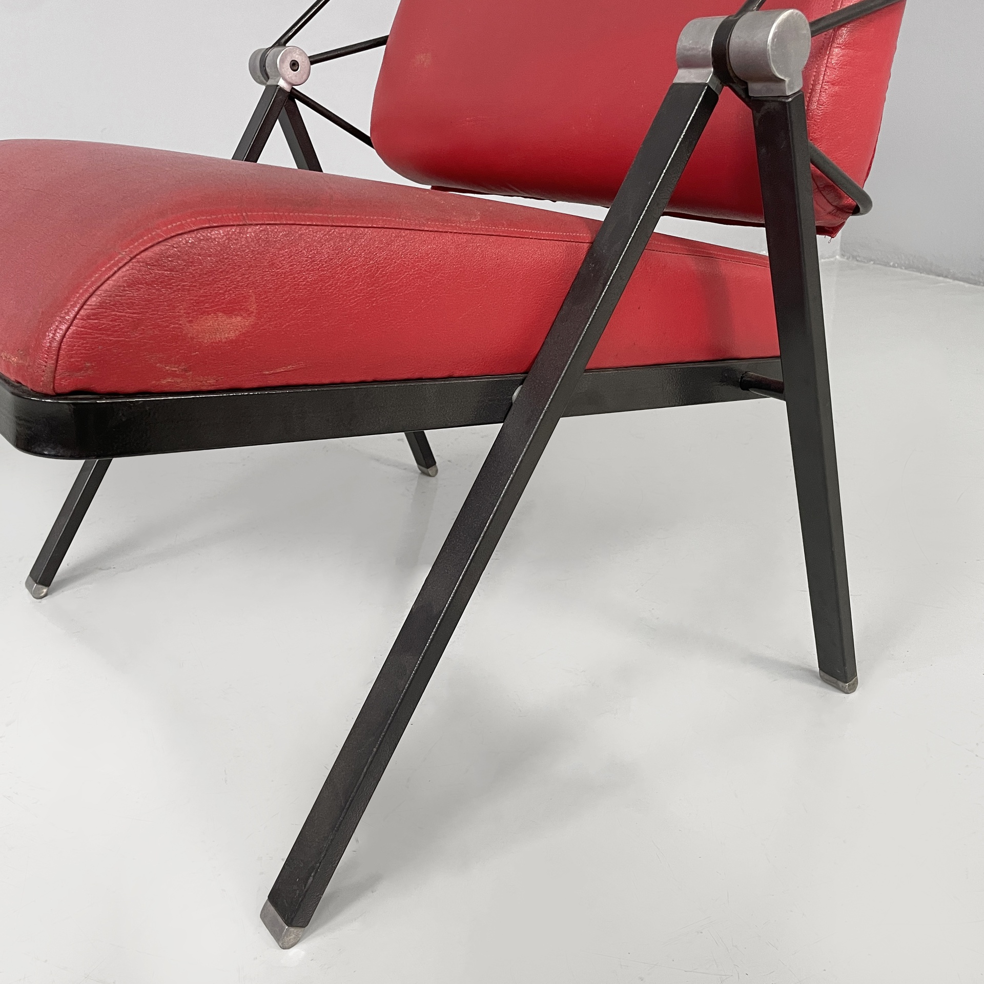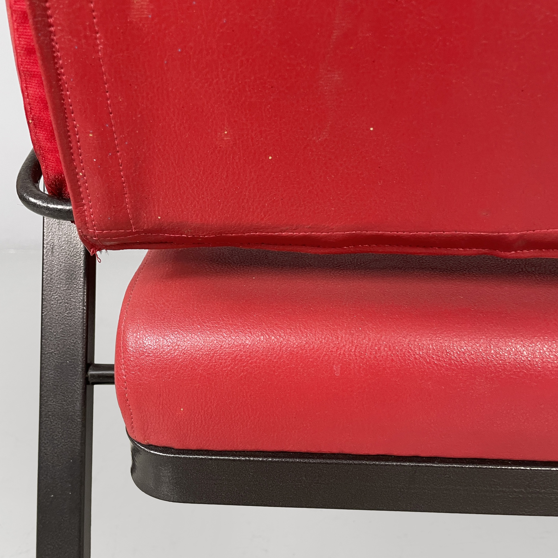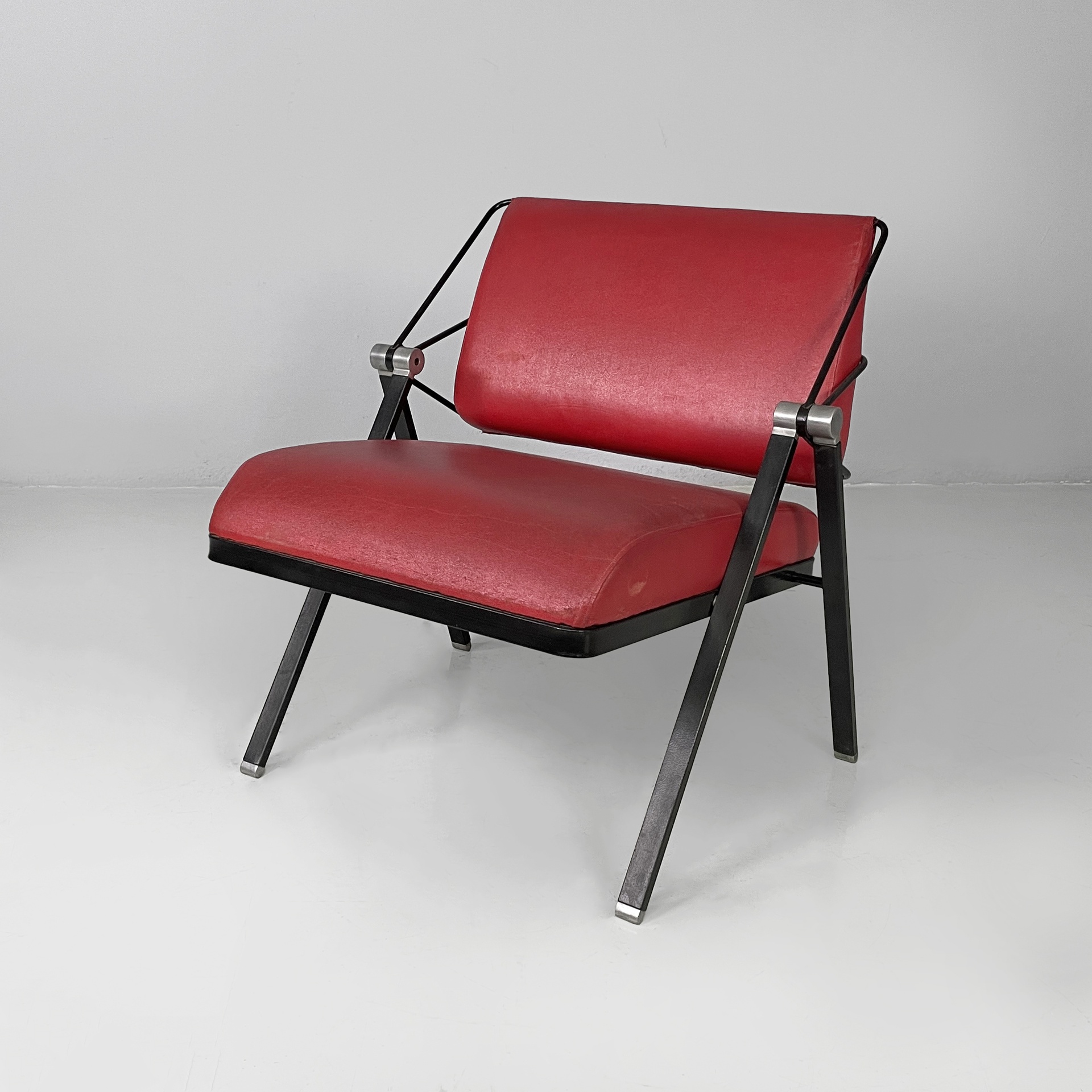 Poltrona con seduta e schienale squadrati, imbottiti e rivestiti in sky rosso. La struttura e le zampe sono in metallo e in metallo verniciato nero.