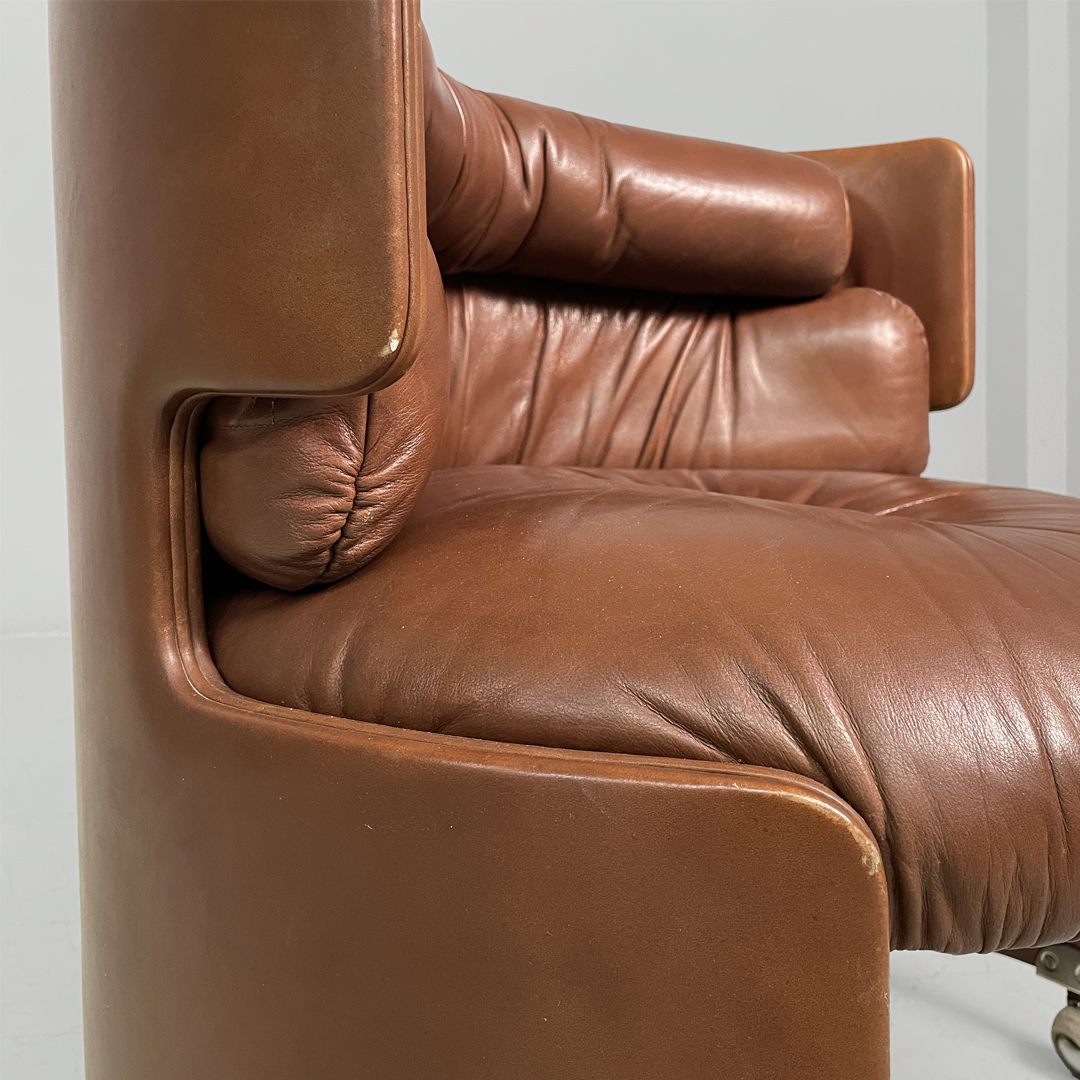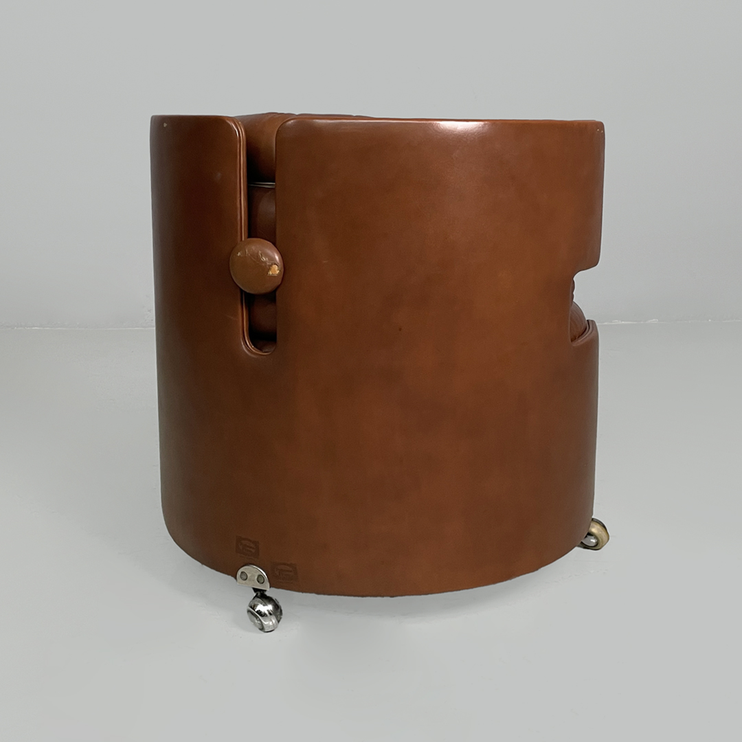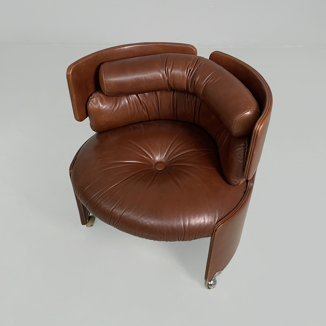 Poltrona interamente rivestita in pelle marrone con ruote. La struttura dalle linee morbide è in legno e la seduta è imbottita con una lavorazione capitonné leggera. Lo schienale imbottito è rimovibile. I braccioli sono arrotondati. La base è dotata di piccole ruote.