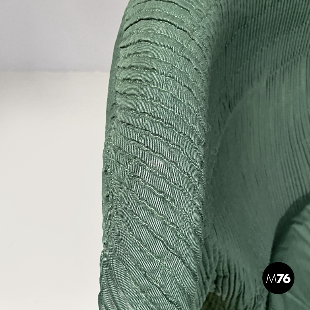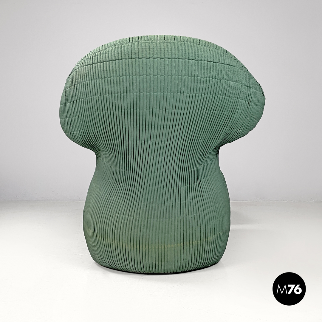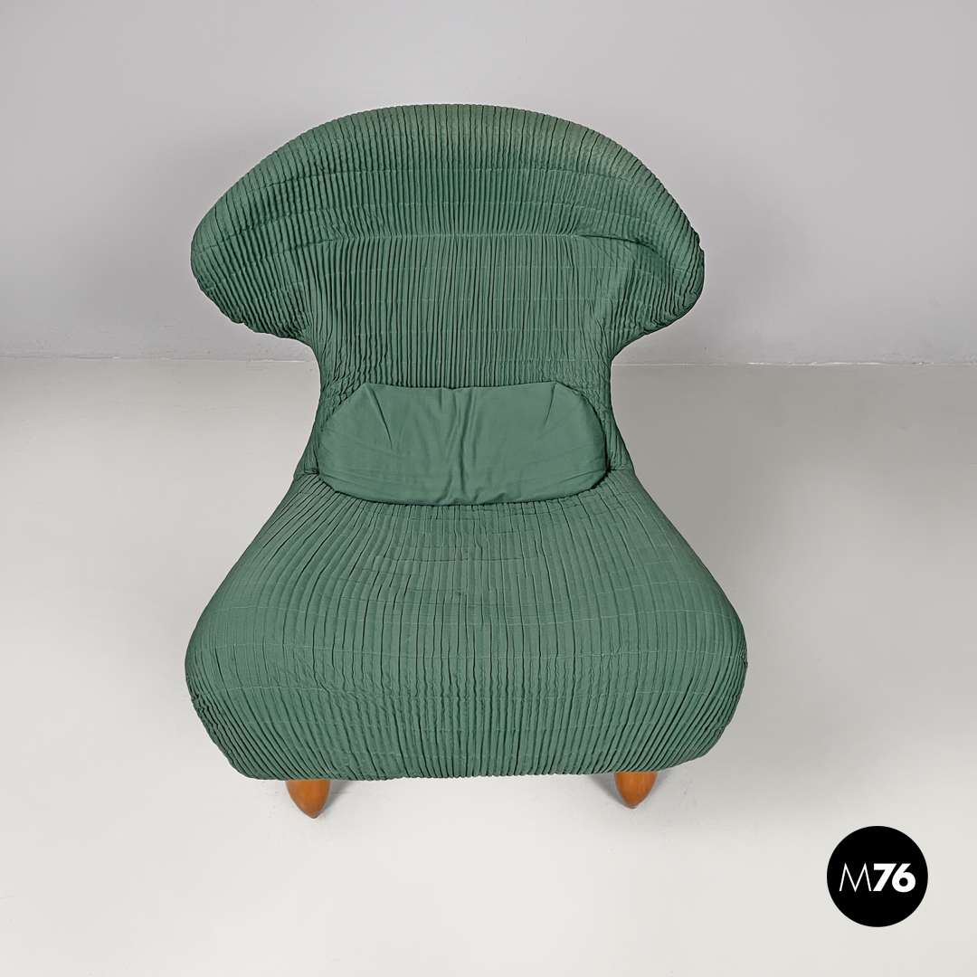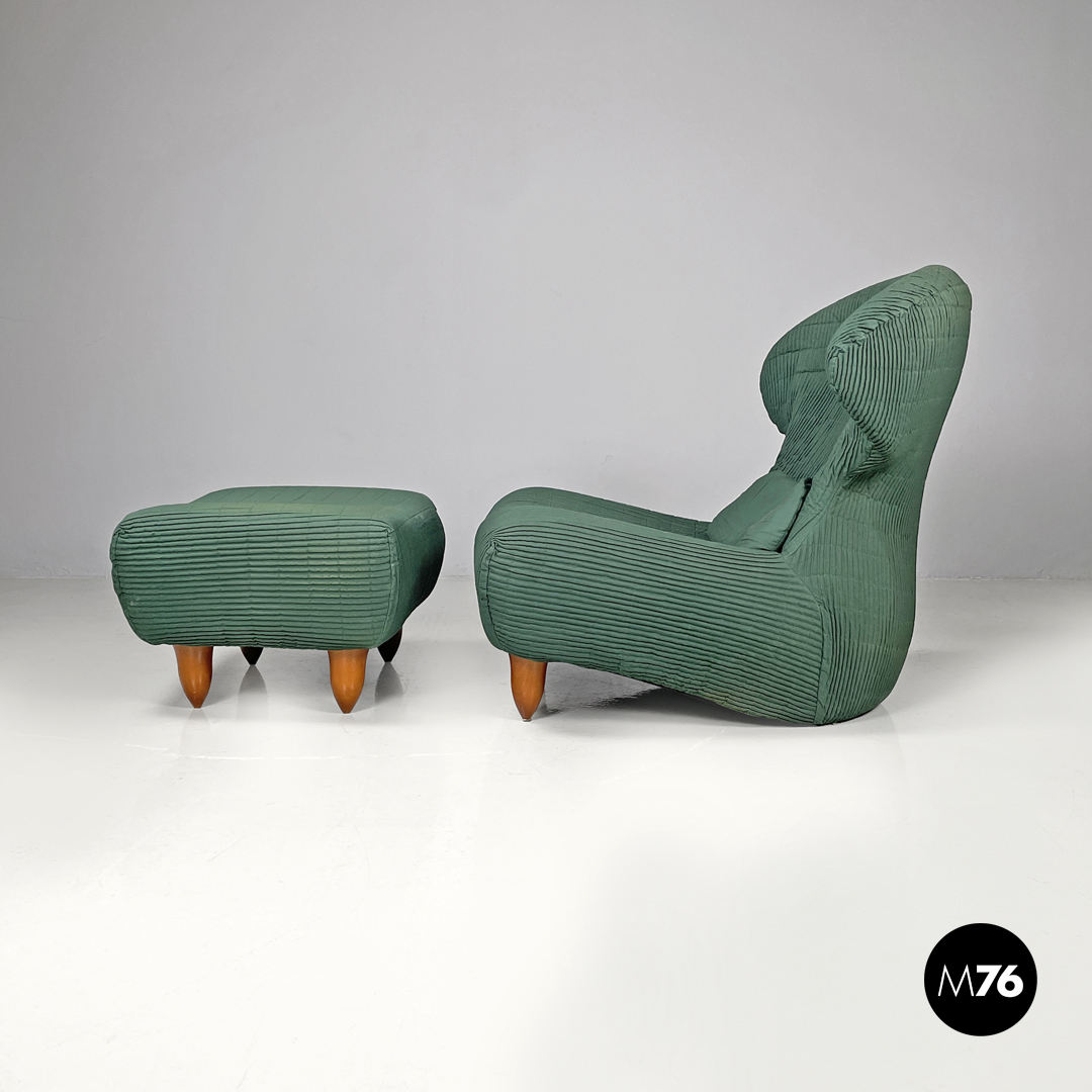 Set di poltrona e pouf modello Femina Body in tessuto verde con cuciture a vista che formano un pattern geometrico. Le due strutture presentano forme morbide, curve ed avvolgenti, lo schienale ha due poggia testa laterali, con un cuscino allungato sulla seduta. Le gambe sono in legno ed hanno una forma cilindrica che termina a punta, il pouf ha quattro gambe mentre la poltrona ne ha due frontali.