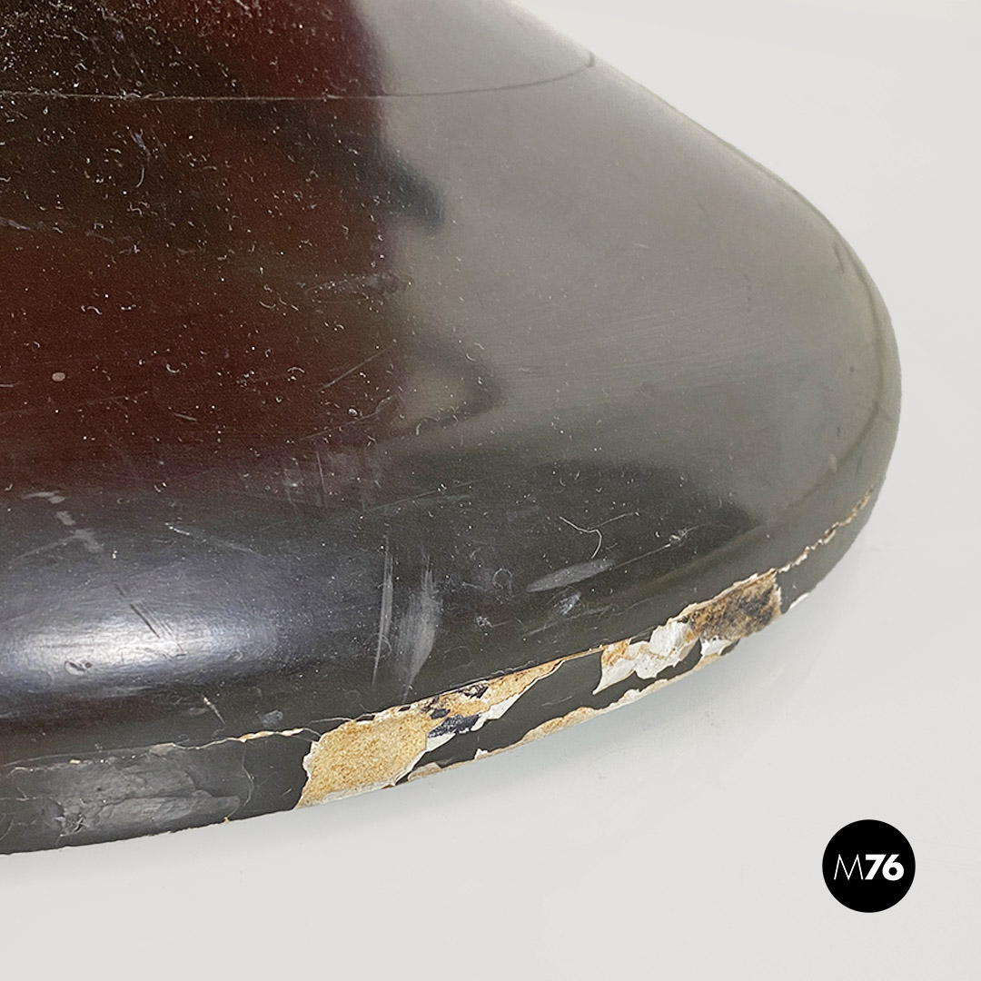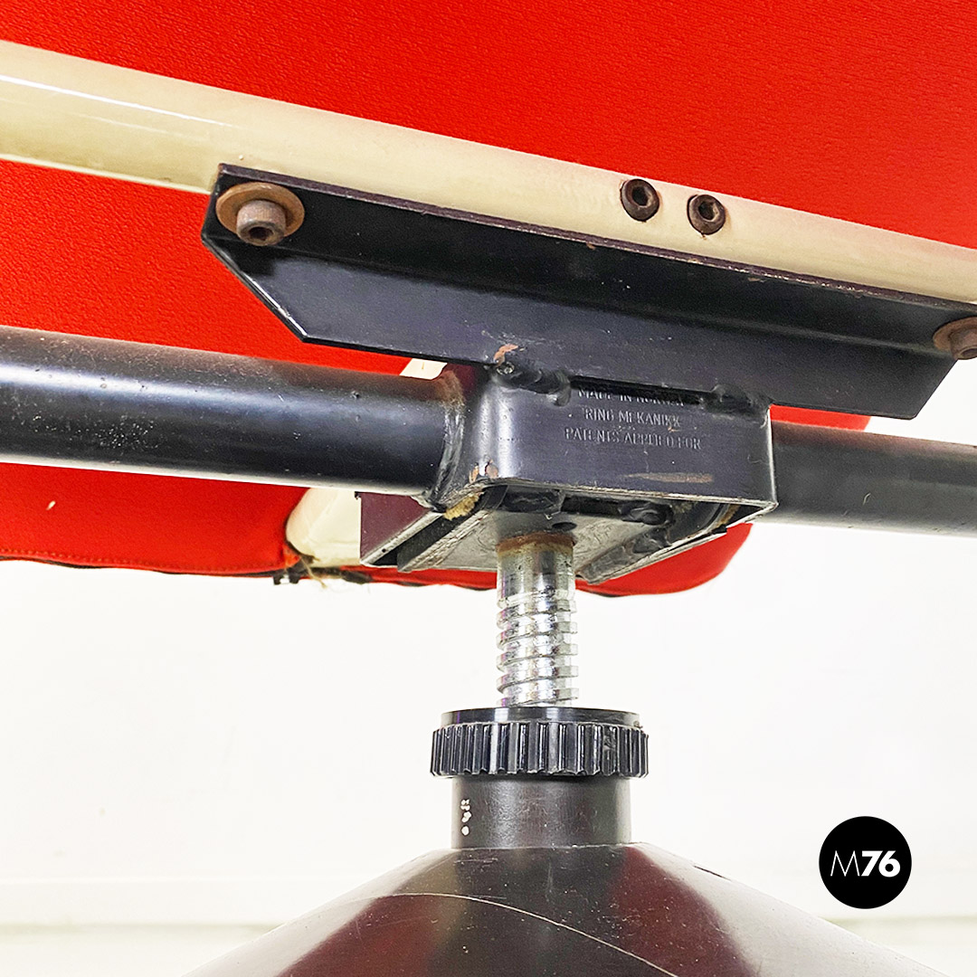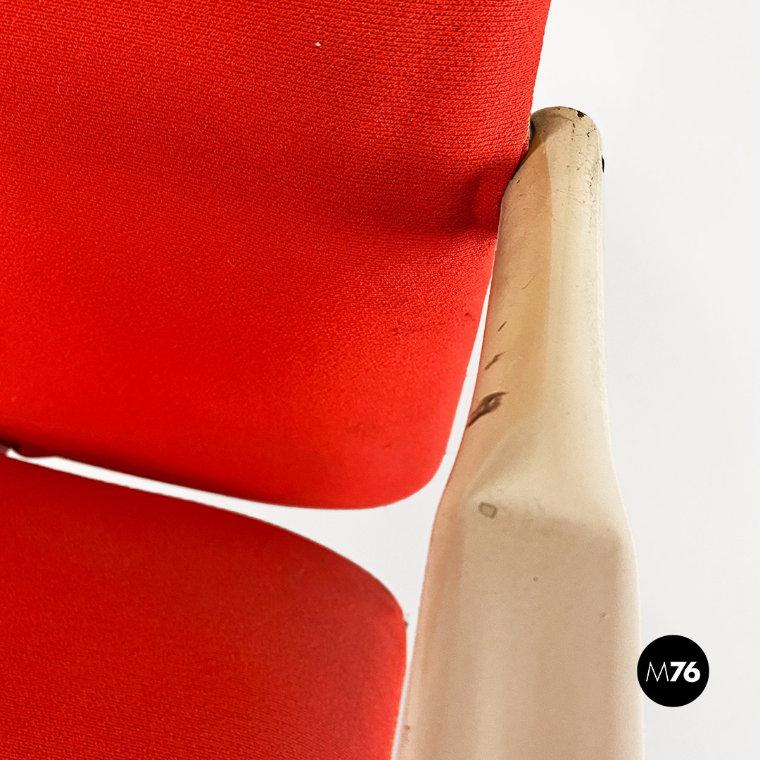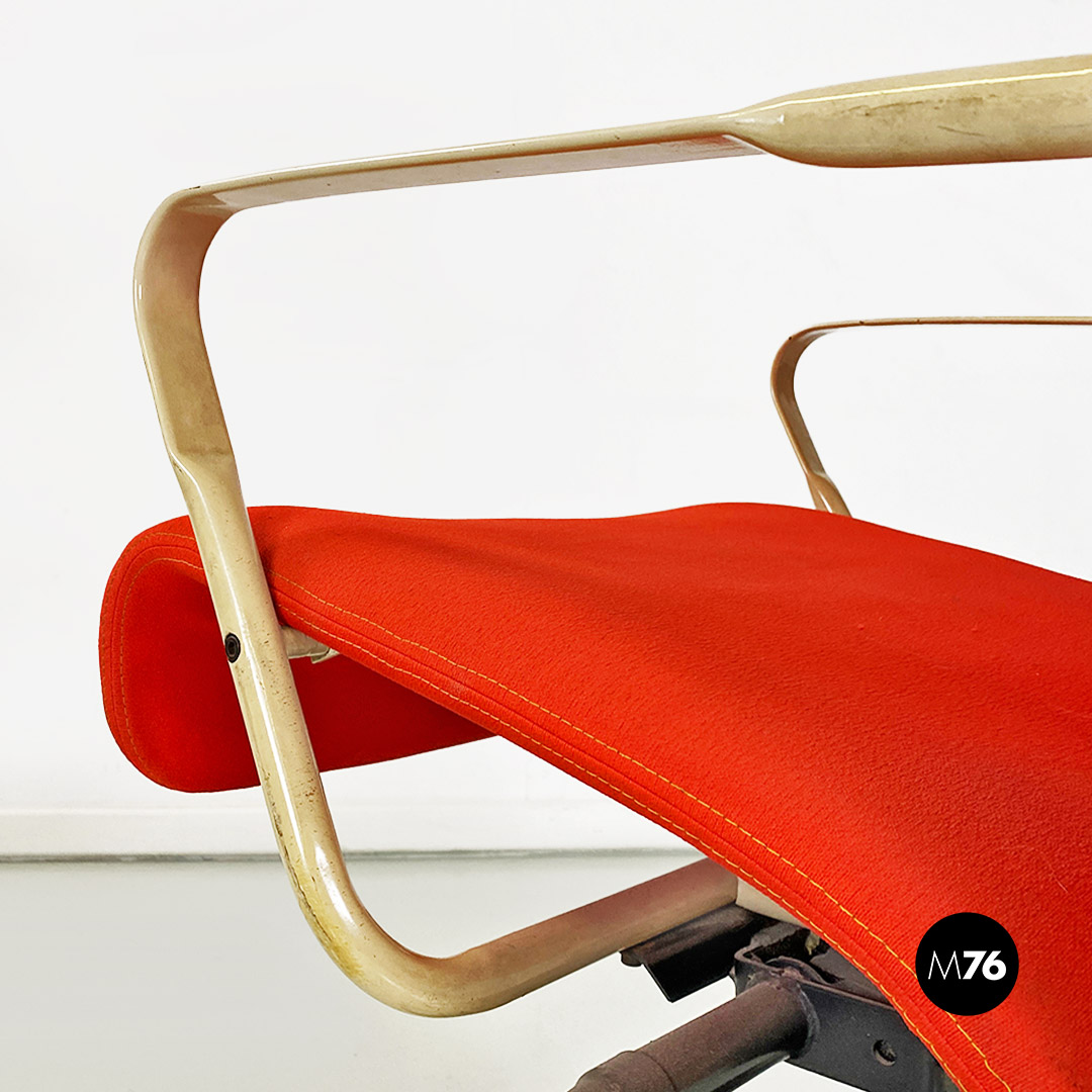 Poltrona con seduta curvata e imbottita, rivestita in tessuto originale rosso, così come lo schienale e con braccioli in metallo bianco in patina e base in legno con possibilità di regolare l’altezza.
