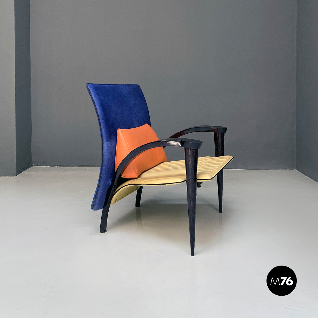 Poltrona con braccioli curvati, con struttura in legno massello con tinta scura, zampe anteriori coniche, seduta in pelle avorio con cuciture parallele, schienale in cavallino blu e cuscino in pelle arancio.