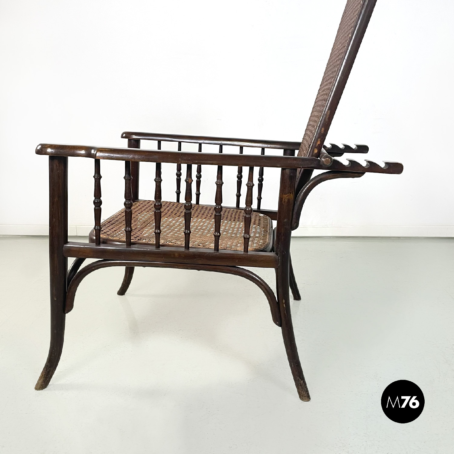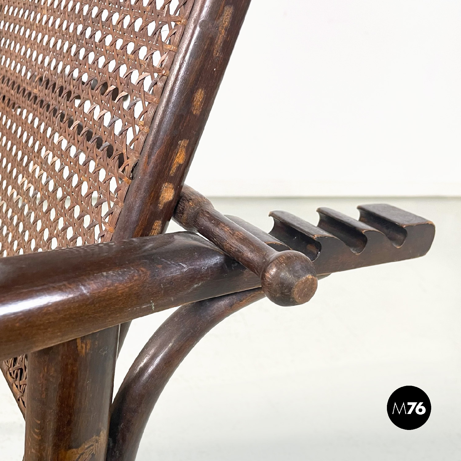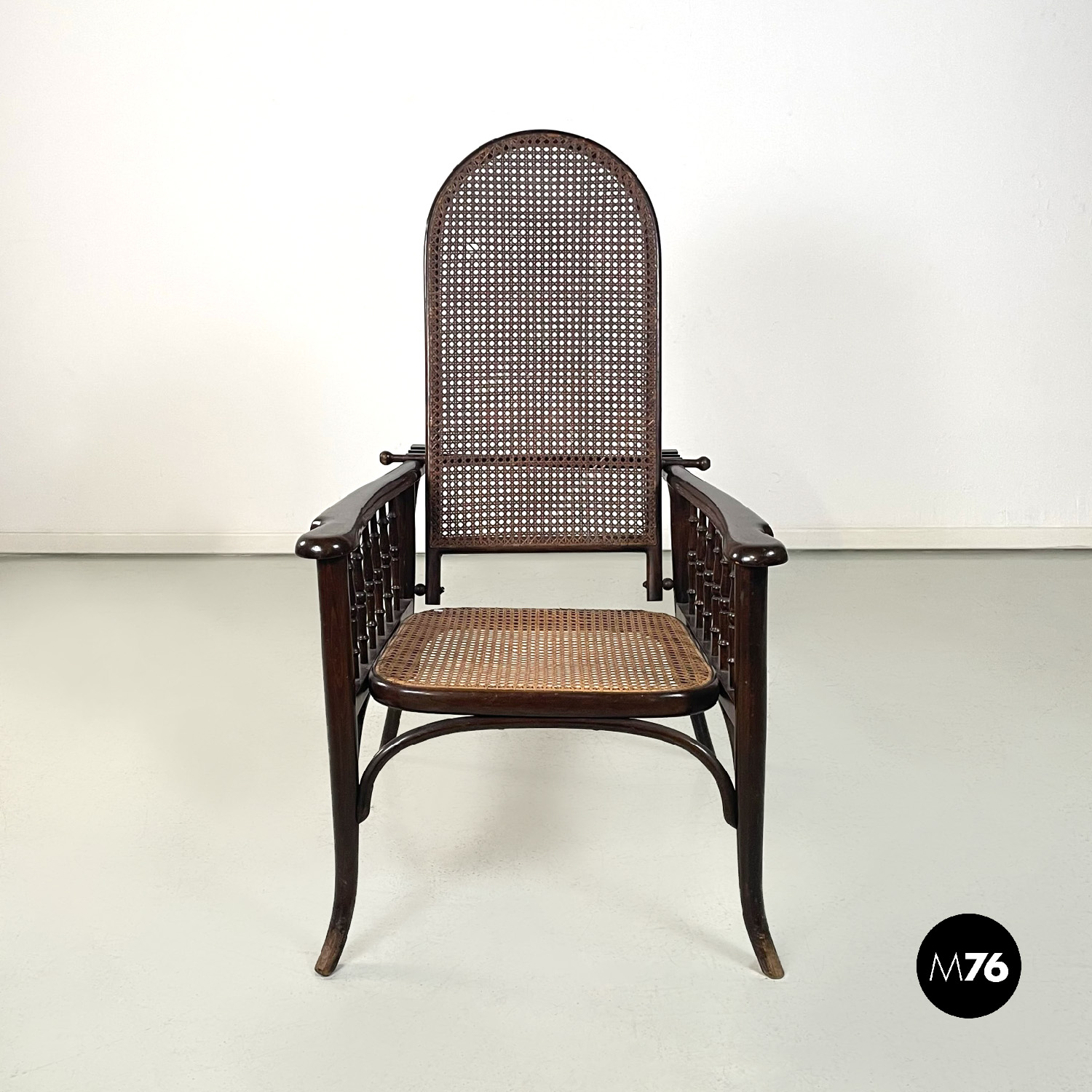 Poltrona in legno con seduta e schienale in paglia di Vienna scura. La struttura è pieghevole ed è possibile modificarne l’inclinazione tramite un bastone che si sposta e si incastra in varie fenditure nella parte posteriore dello schienale. I braccioli si allungano oltre la lunghezza della seduta e hanno ciascuno sei listelli decorati in legno.