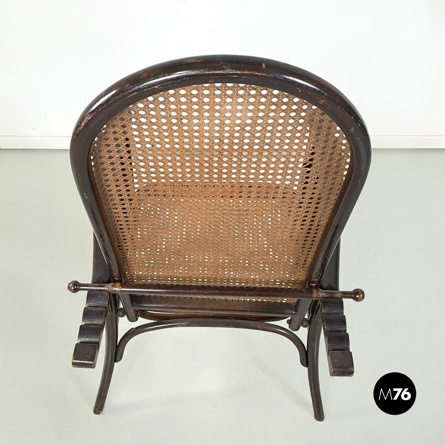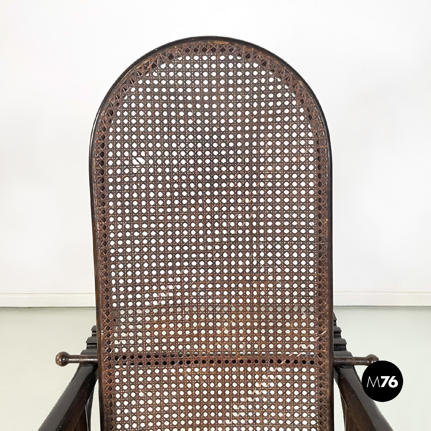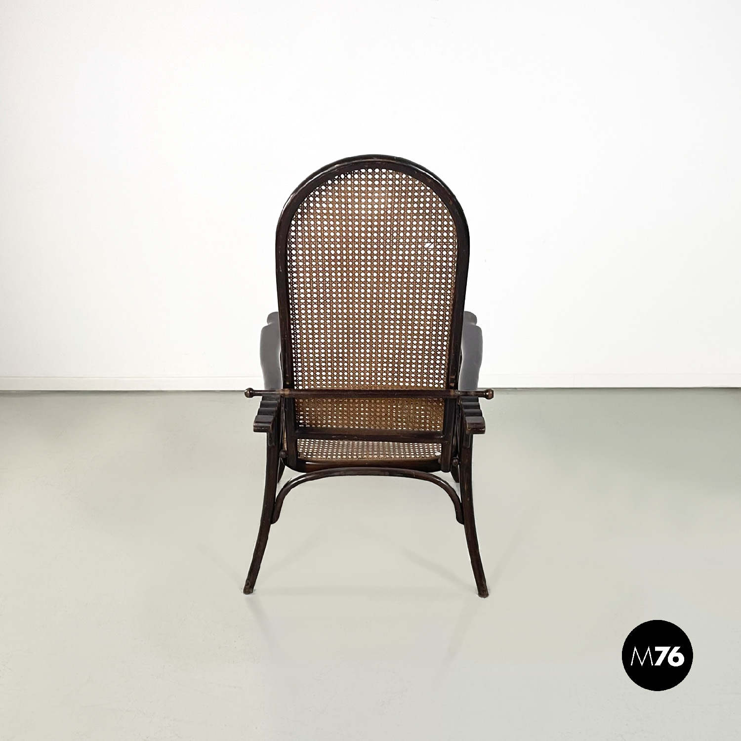 Poltrona in legno con seduta e schienale in paglia di Vienna scura. La struttura è pieghevole ed è possibile modificarne l’inclinazione tramite un bastone che si sposta e si incastra in varie fenditure nella parte posteriore dello schienale. I braccioli si allungano oltre la lunghezza della seduta e hanno ciascuno sei listelli decorati in legno.