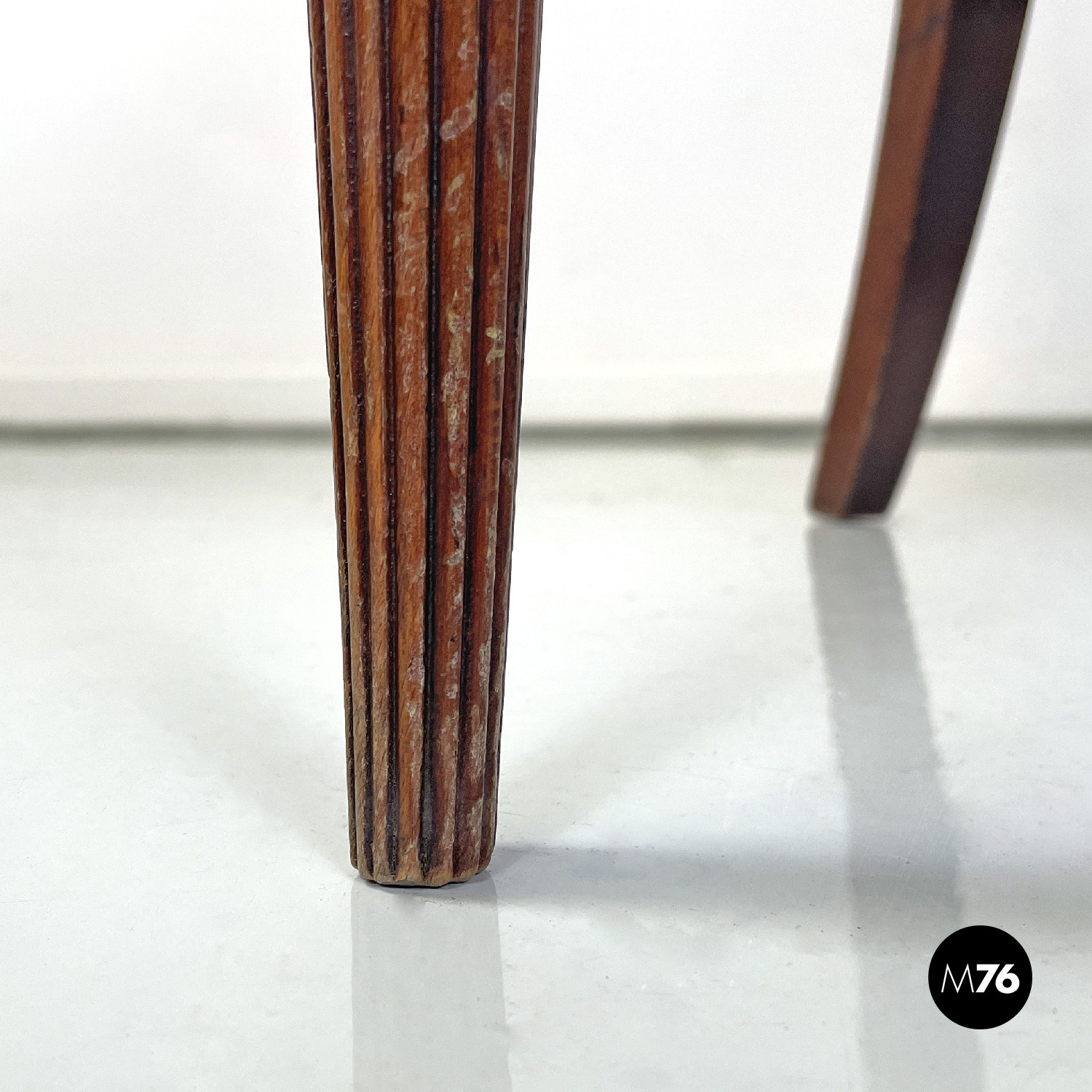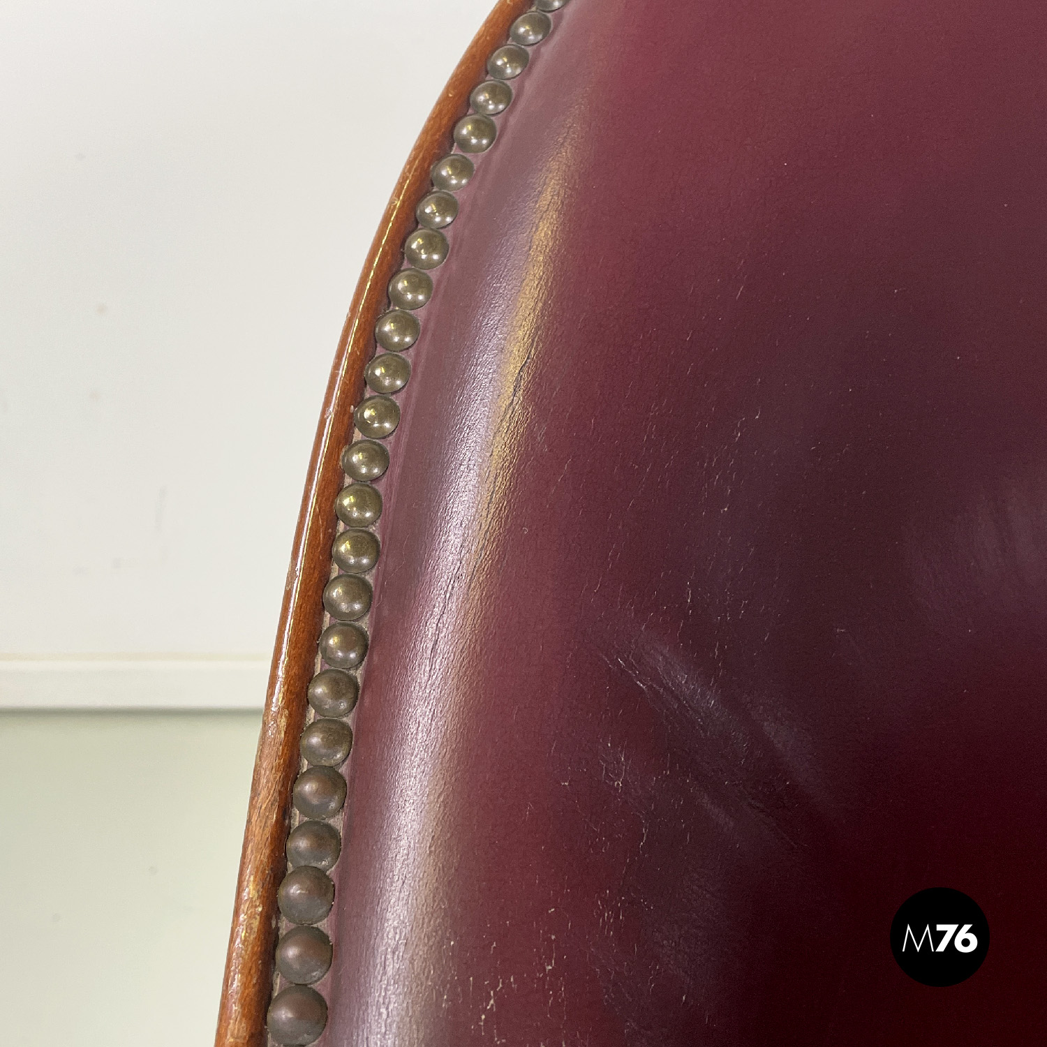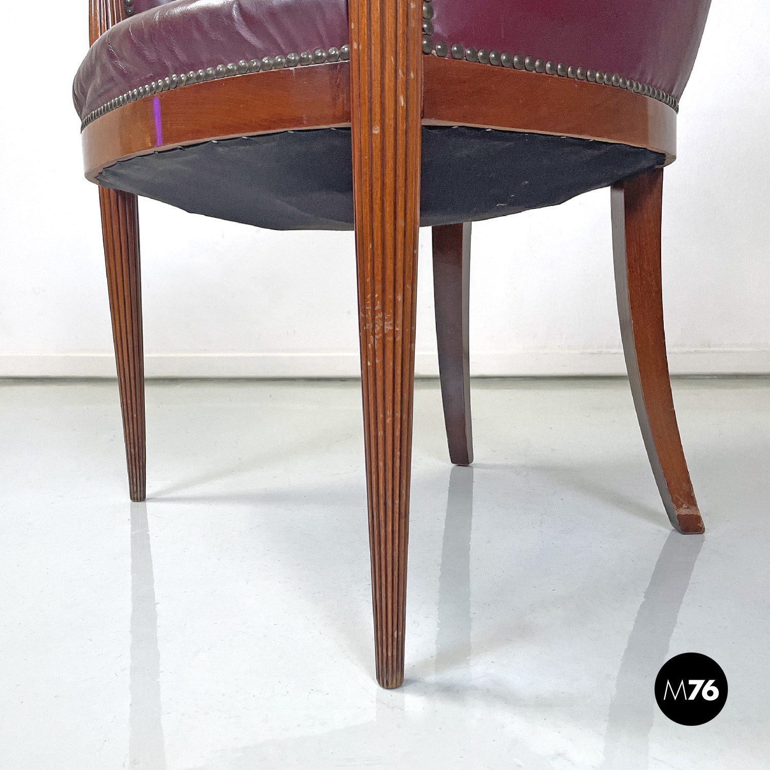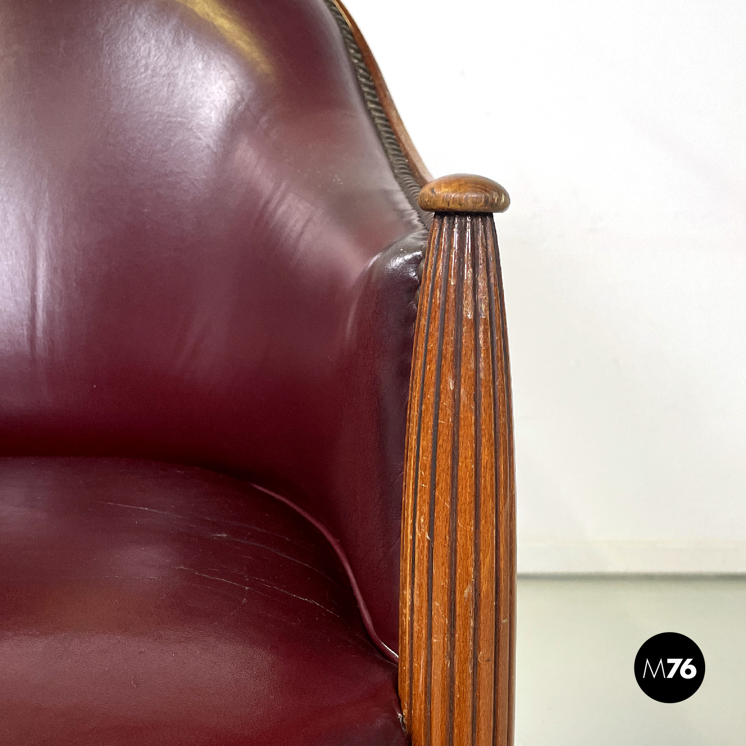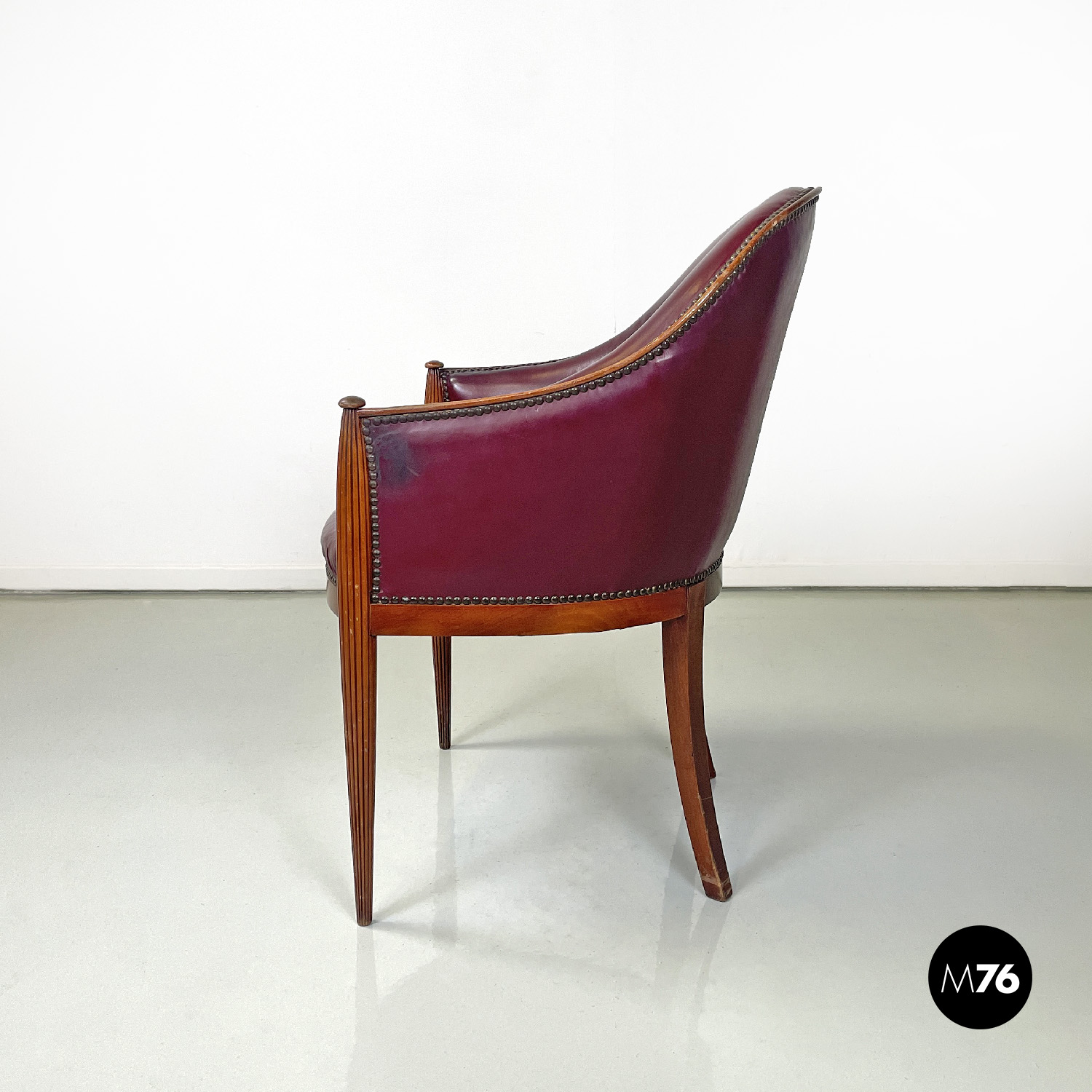 Poltrona a pozzetto in pelle color rosso vinaccia. La pelle si estende su tutta la superficie dello schienale e della seduta, anche nella parte esterna. I profili della poltrona presentano delle borchie in bronzo. Le due gambe anteriori partono dal bracciolo per arrivare a terra e sono a sezione tonda decorate con linee verticali, le due gambe posteriori sono lisce a sezione quadrata.