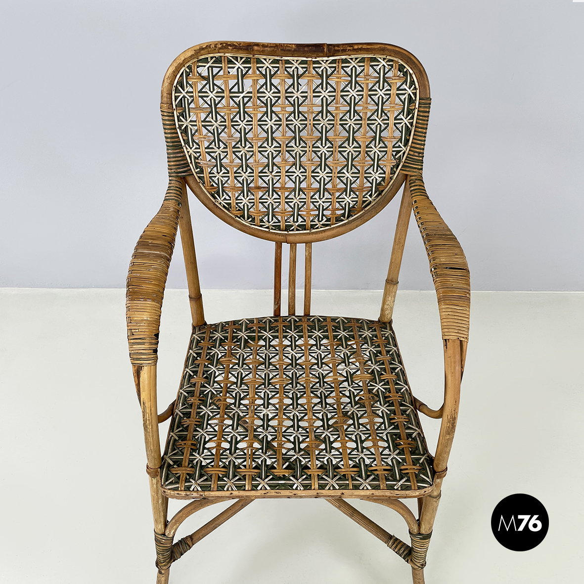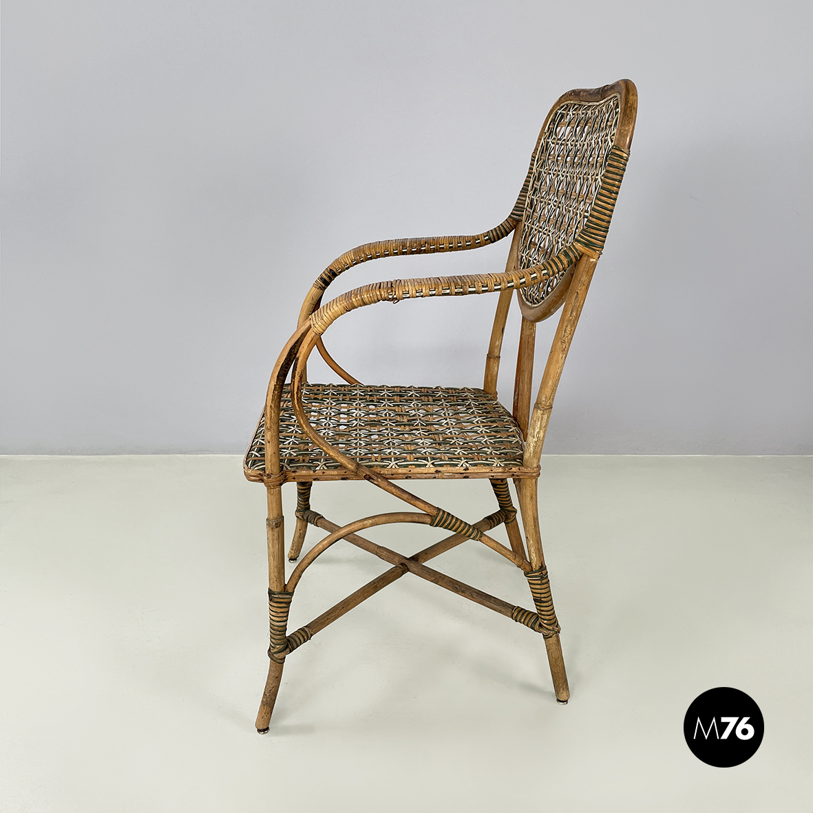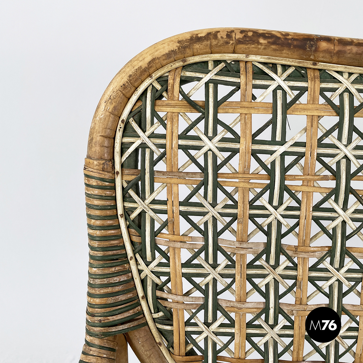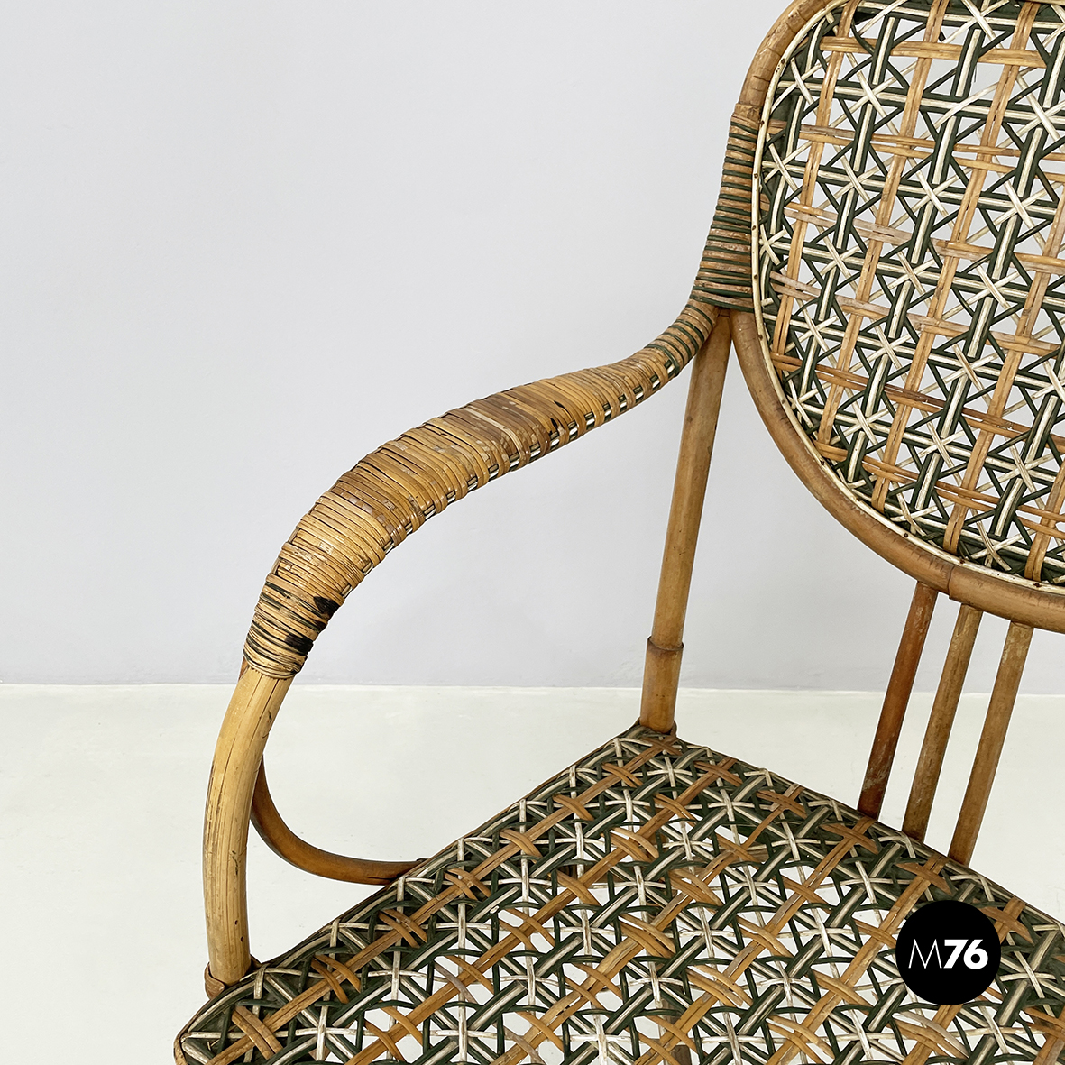 Poltrona da esterno interamente in rattan intrecciato. Lo schienale tondeggiante è in rattan con intrecci in vimini marrone, bianco e verde con pattern a stelle. I braccioli curvati presentano un intreccio in vimini. La seduta presenta lo stesso pattern e colori. Le zampe curvate in rattan sono rifinite con parti in vimini verde e marrone. Questa sedia con braccioli è perfetta per il giardino.