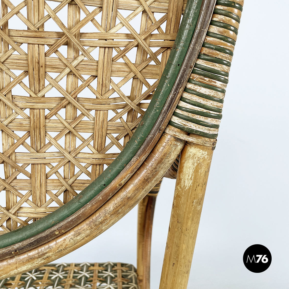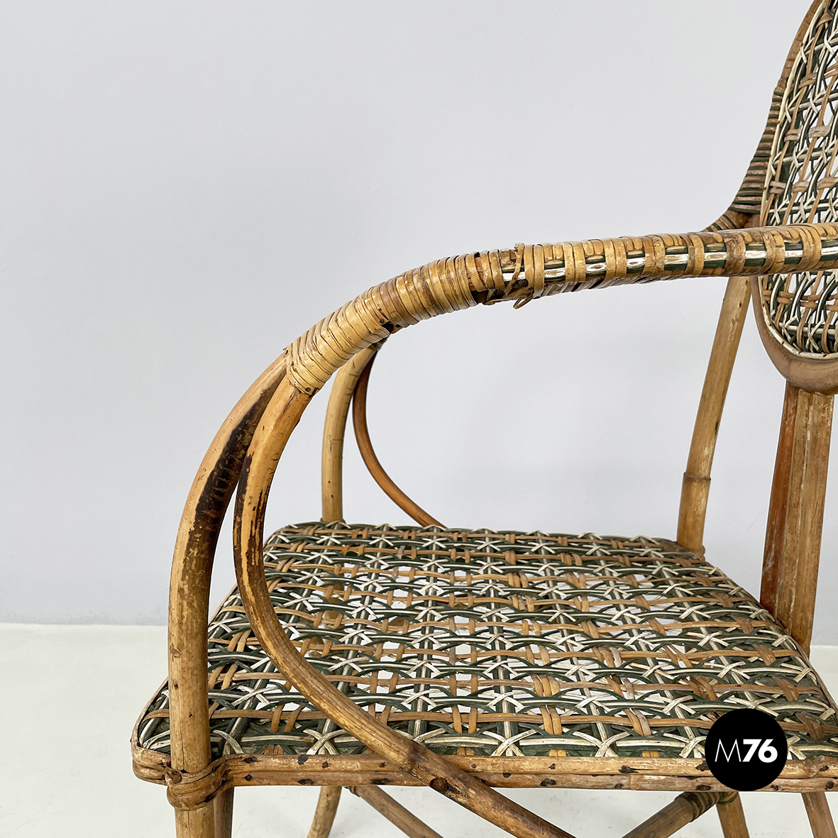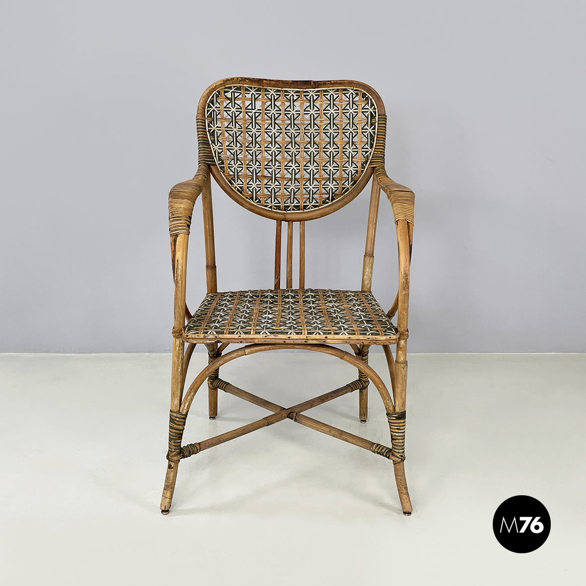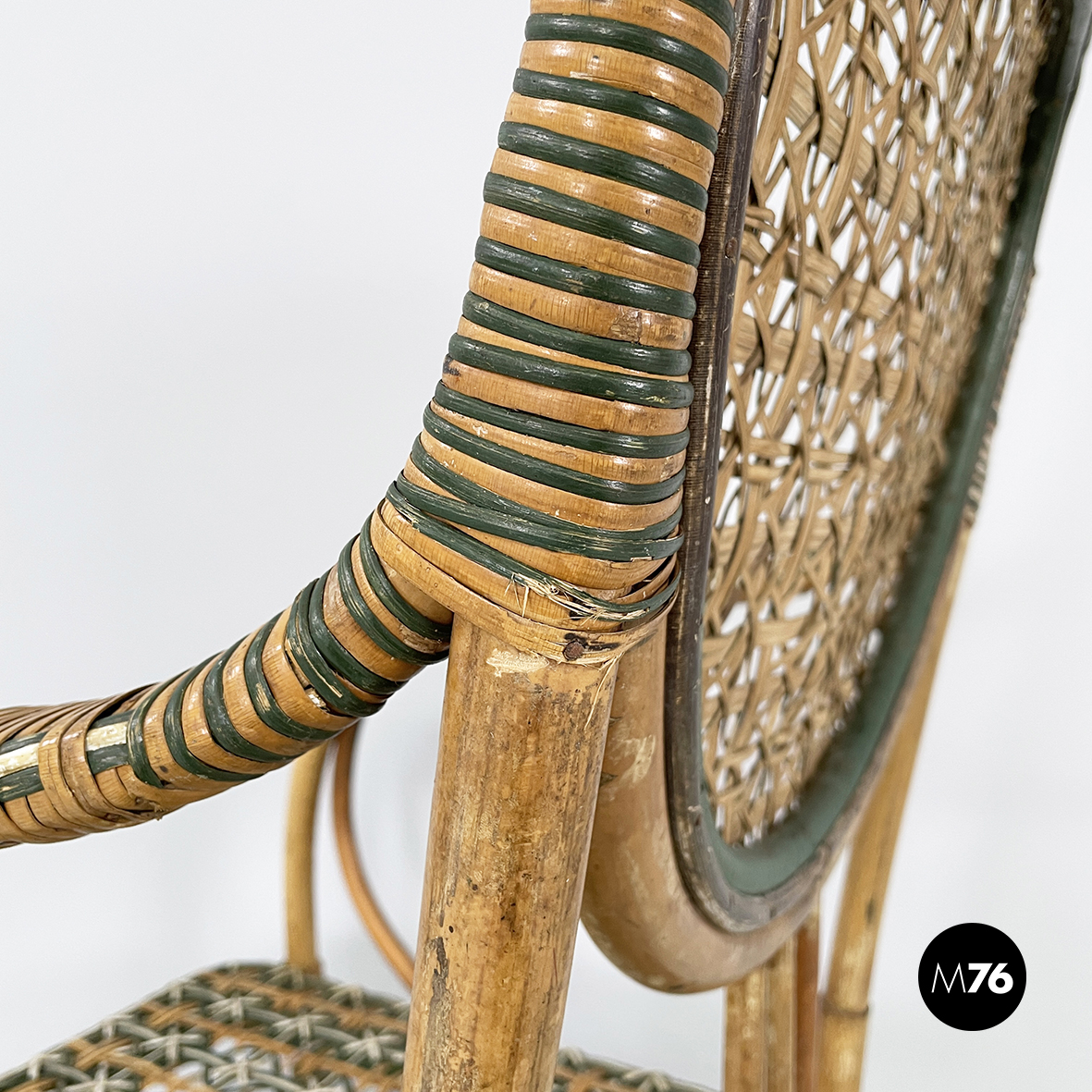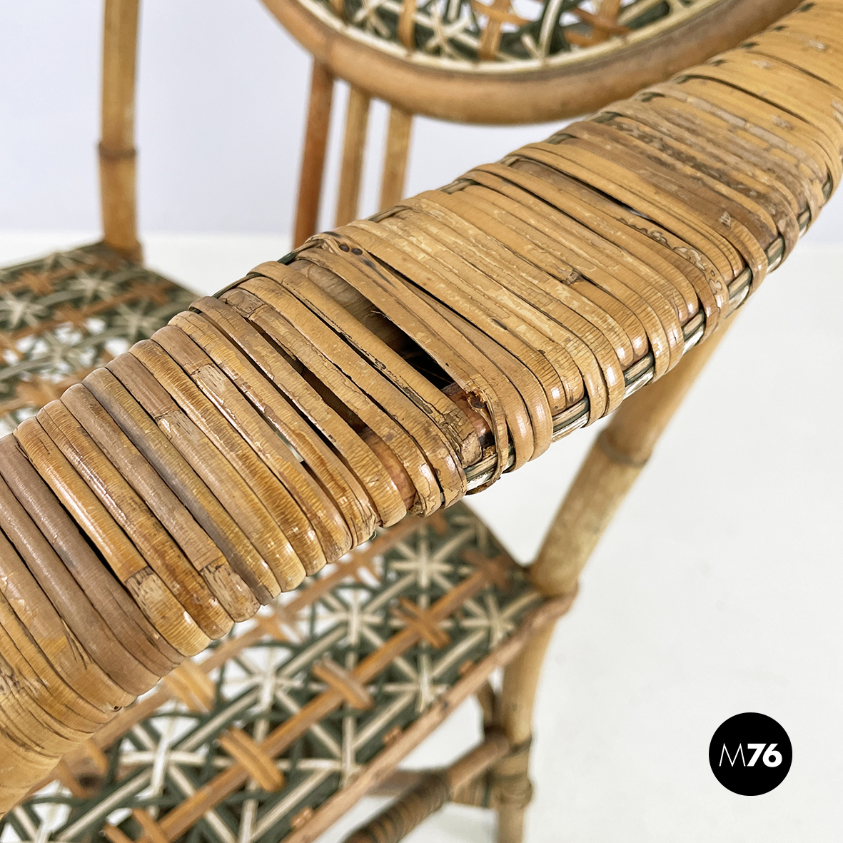 Poltrona da esterno interamente in rattan intrecciato. Lo schienale tondeggiante è in rattan con intrecci in vimini marrone, bianco e verde con pattern a stelle. I braccioli curvati presentano un intreccio in vimini. La seduta presenta lo stesso pattern e colori. Le zampe curvate in rattan sono rifinite con parti in vimini verde e marrone. Questa sedia con braccioli è perfetta per il giardino.