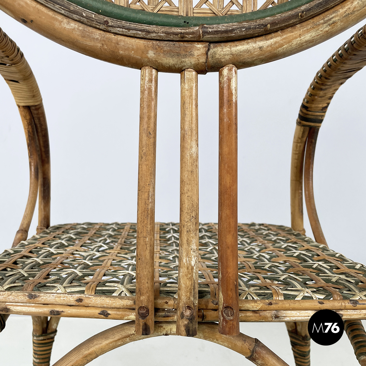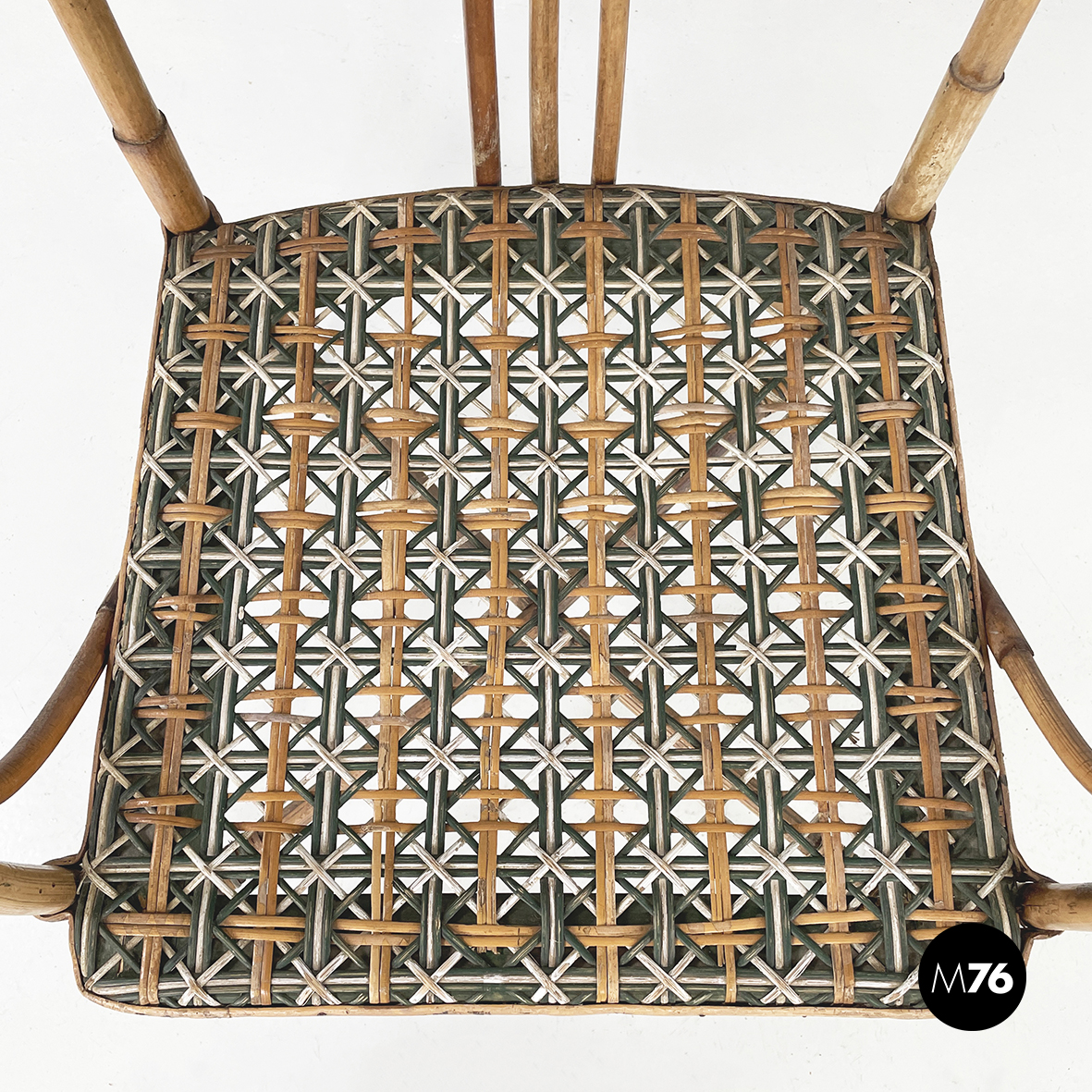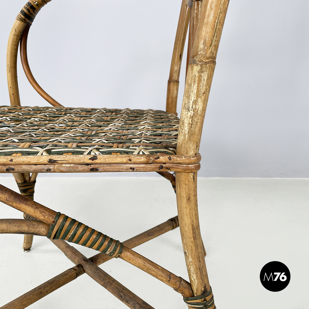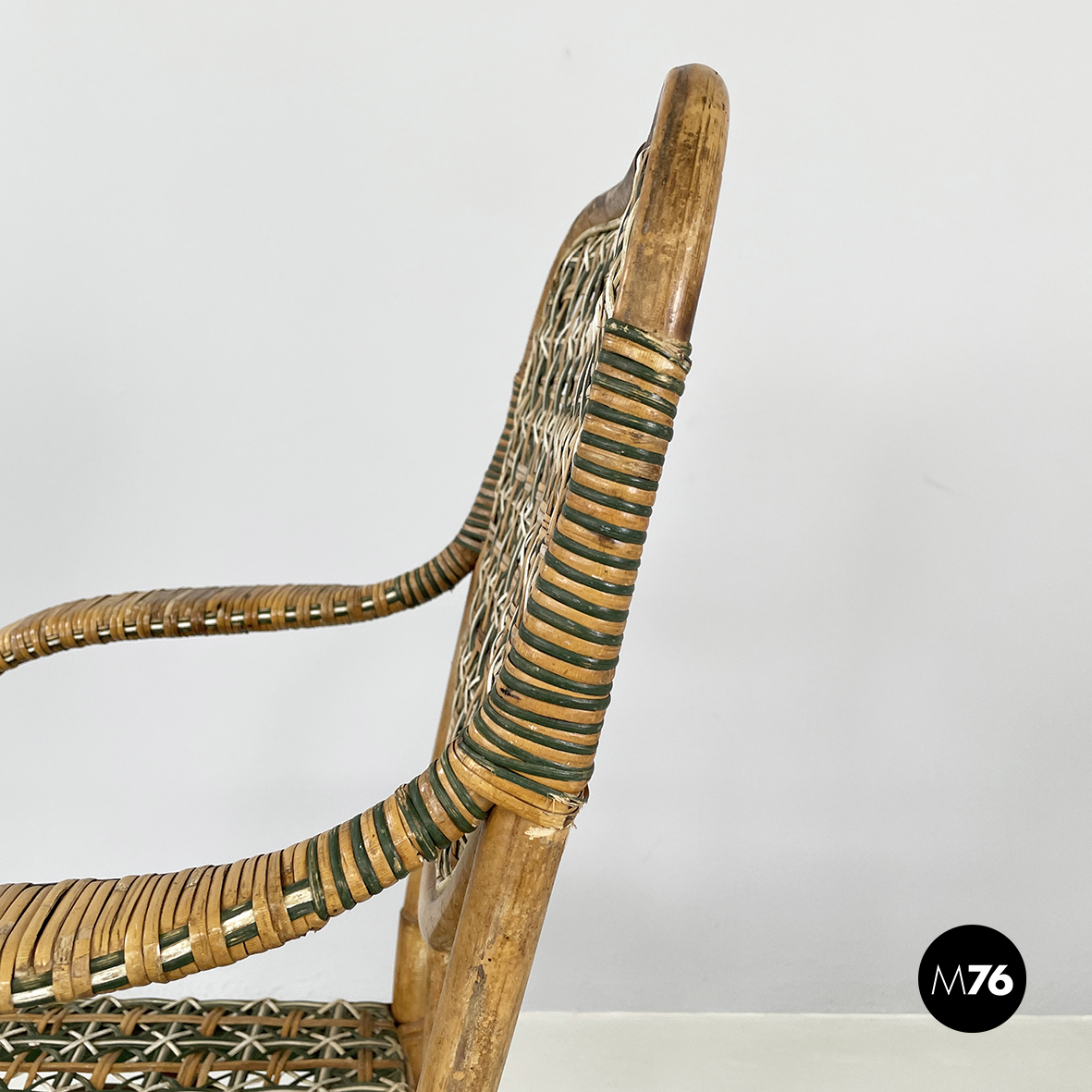 Poltrona da esterno interamente in rattan intrecciato. Lo schienale tondeggiante è in rattan con intrecci in vimini marrone, bianco e verde con pattern a stelle. I braccioli curvati presentano un intreccio in vimini. La seduta presenta lo stesso pattern e colori. Le zampe curvate in rattan sono rifinite con parti in vimini verde e marrone. Questa sedia con braccioli è perfetta per il giardino.