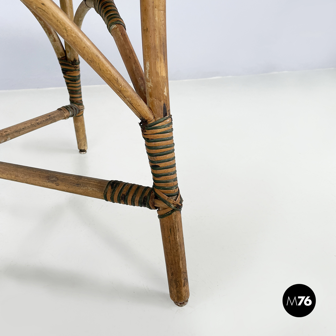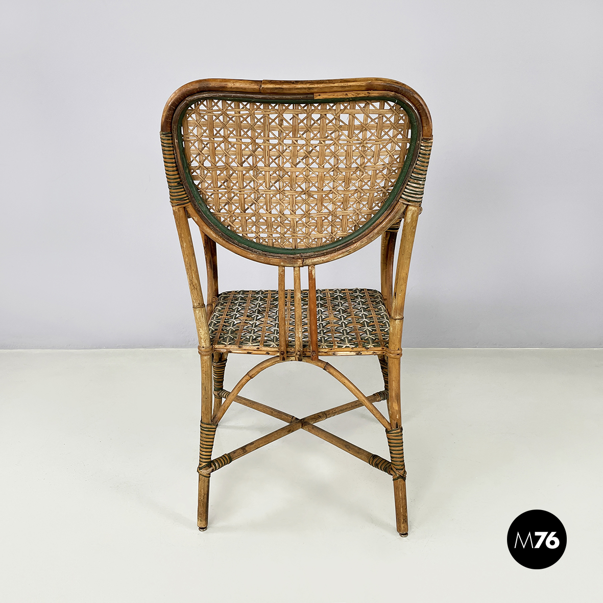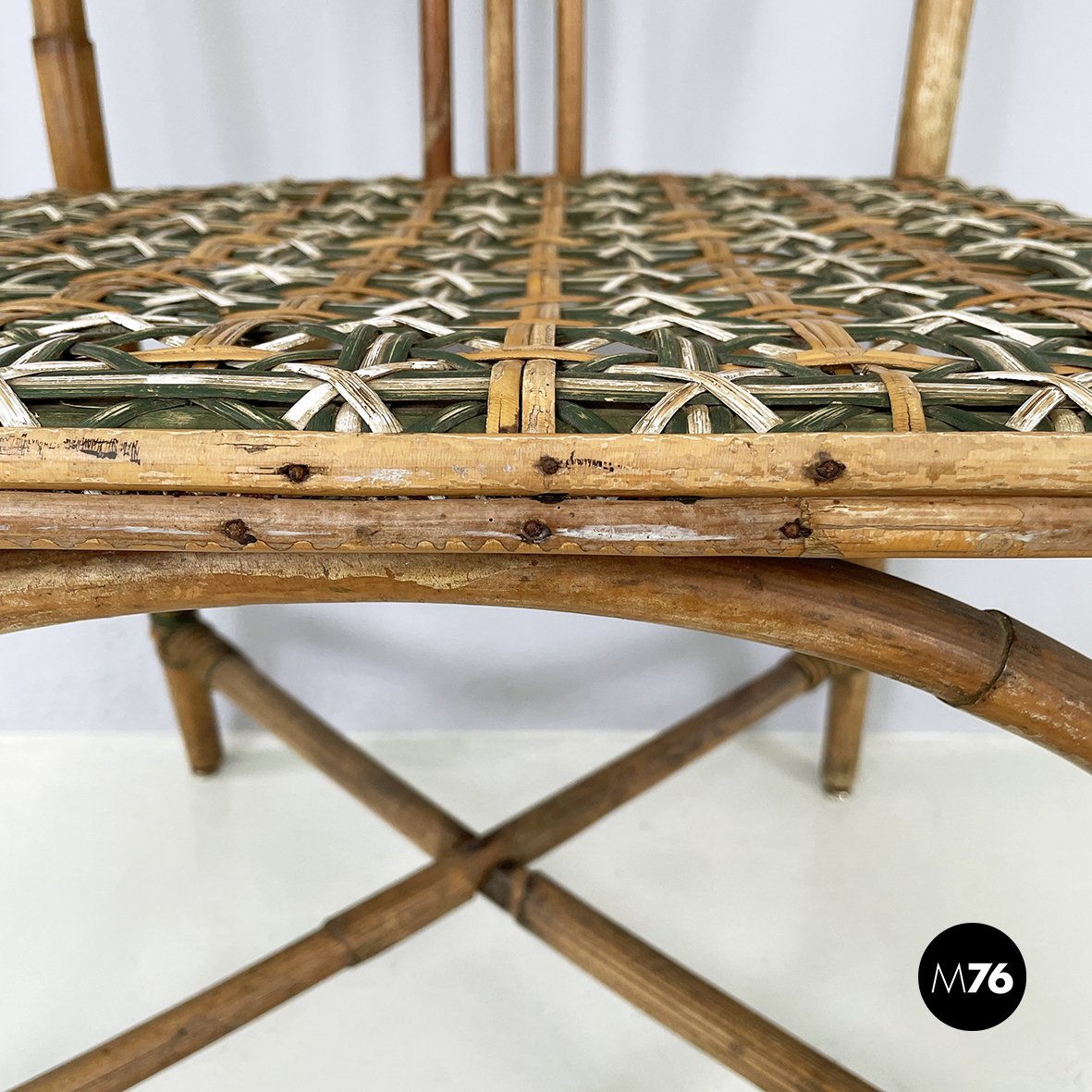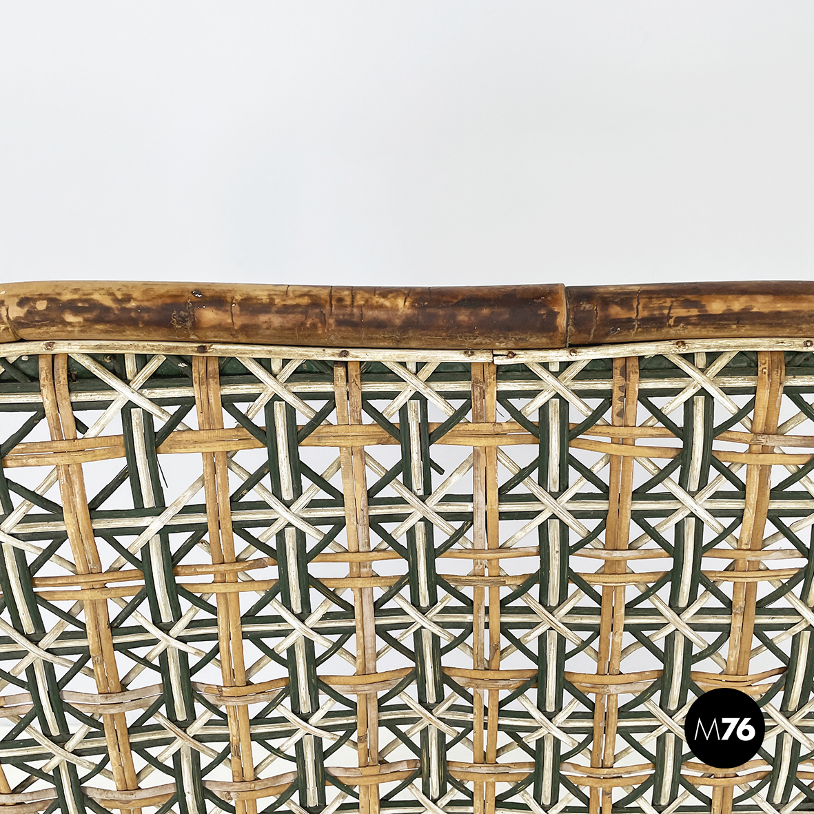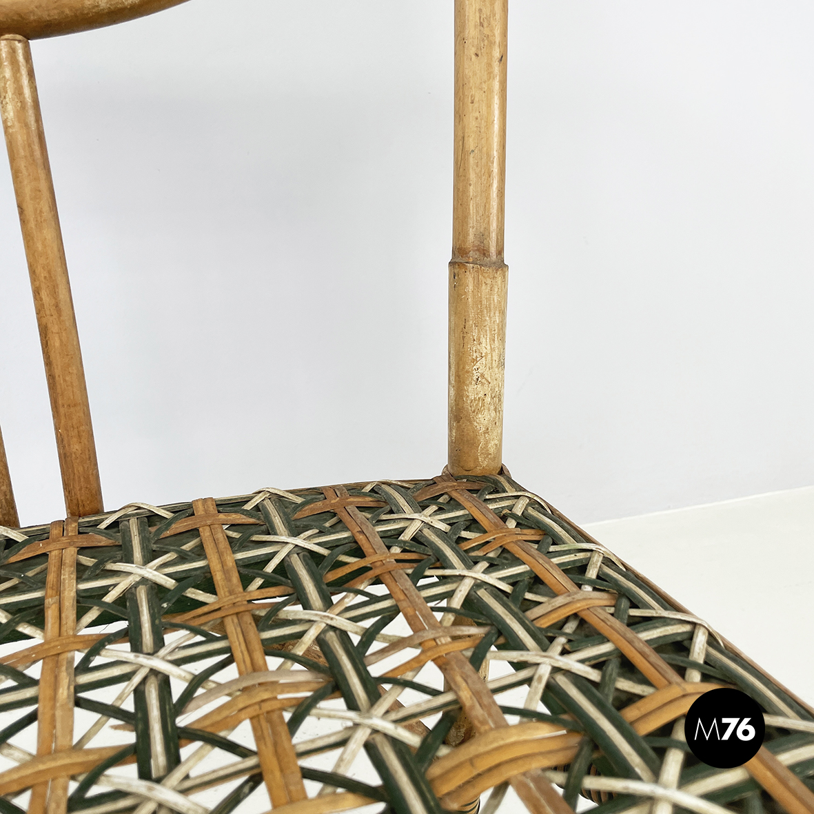 Poltrona da esterno interamente in rattan intrecciato. Lo schienale tondeggiante è in rattan con intrecci in vimini marrone, bianco e verde con pattern a stelle. I braccioli curvati presentano un intreccio in vimini. La seduta presenta lo stesso pattern e colori. Le zampe curvate in rattan sono rifinite con parti in vimini verde e marrone. Questa sedia con braccioli è perfetta per il giardino.
