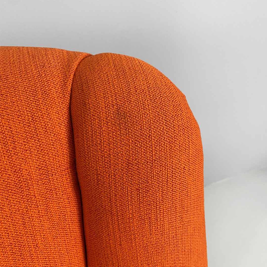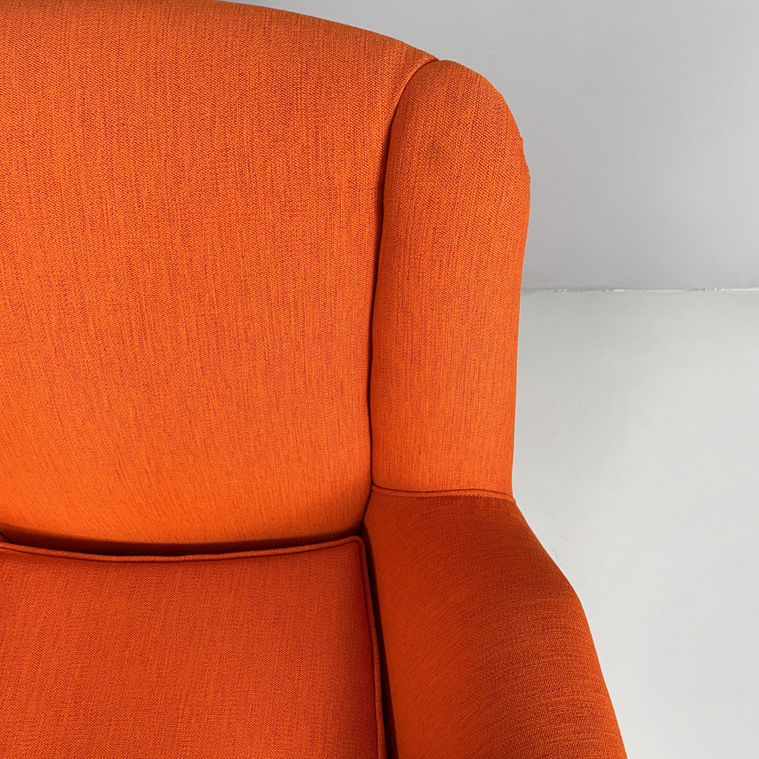 Poltrona con seduta, schienale e braccioli imbottiti e rivestiti in tessuto arancione. Le zampe a sezione tonda sono in legno scuro.
