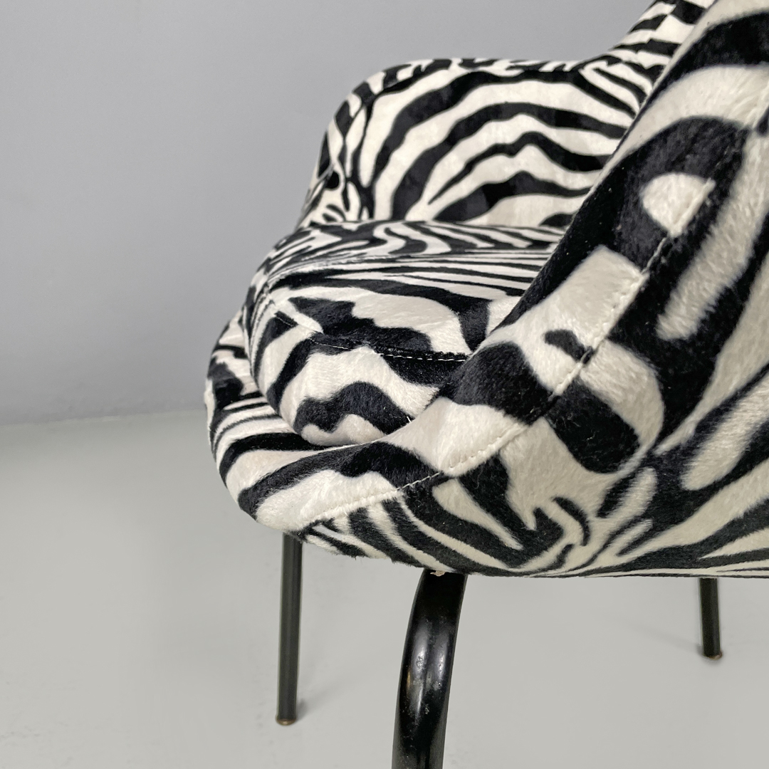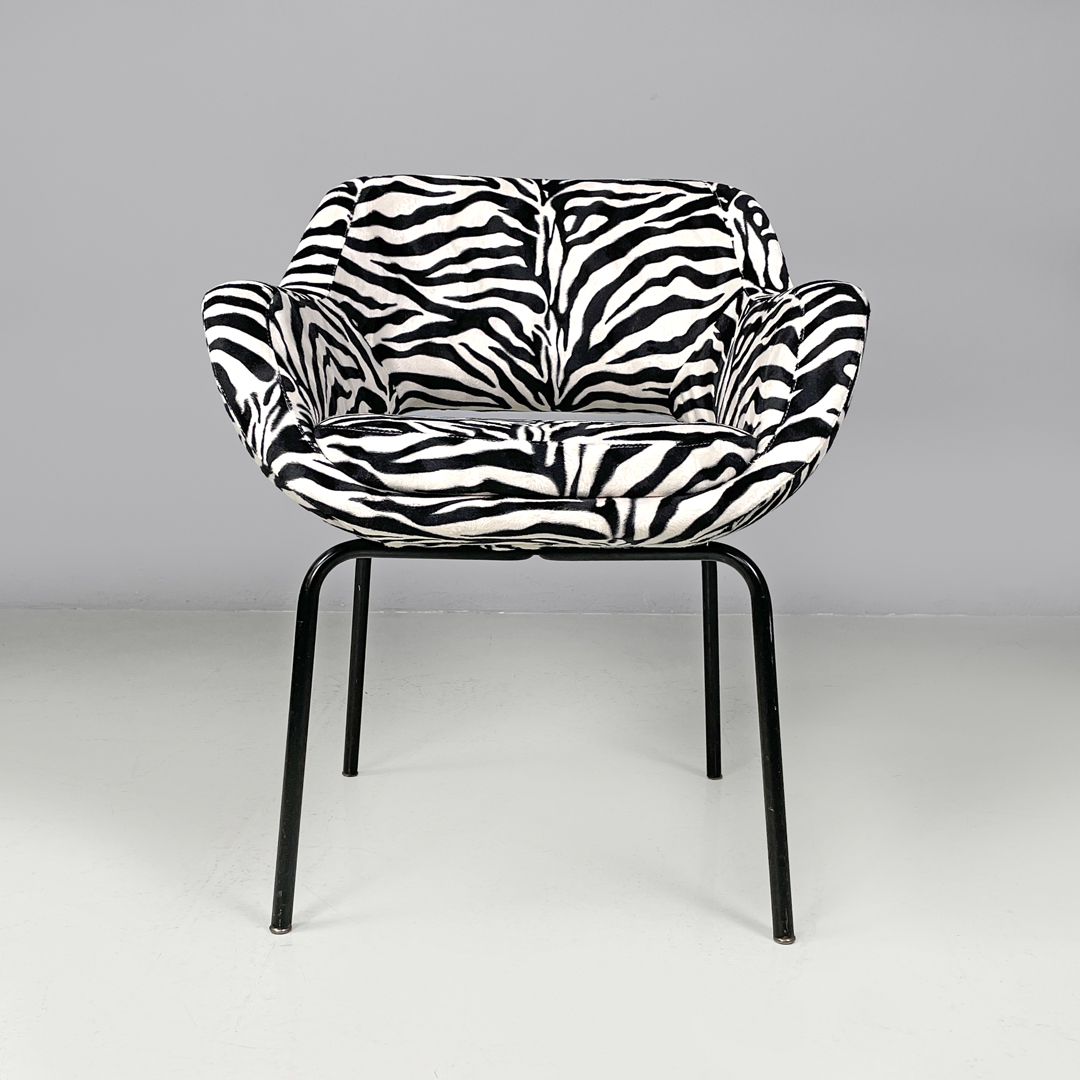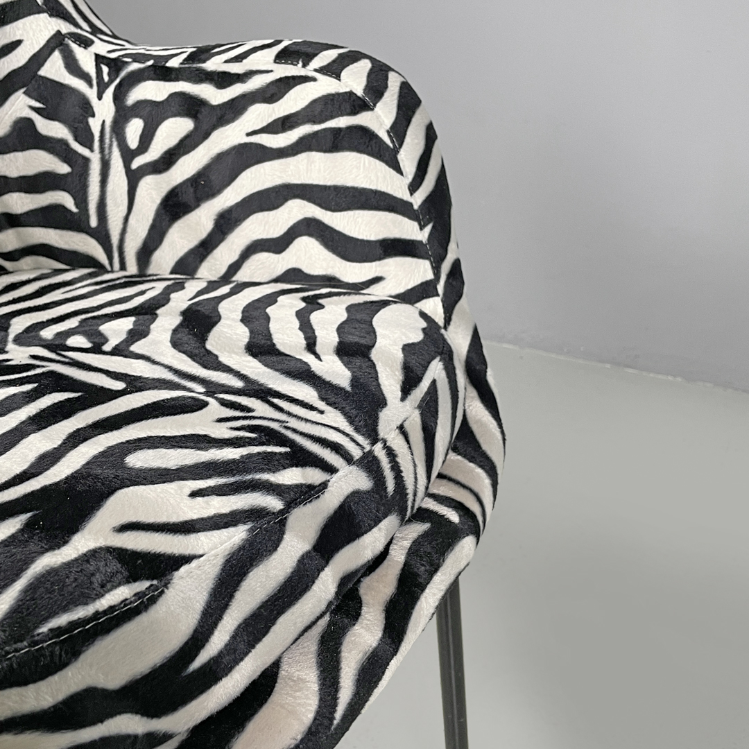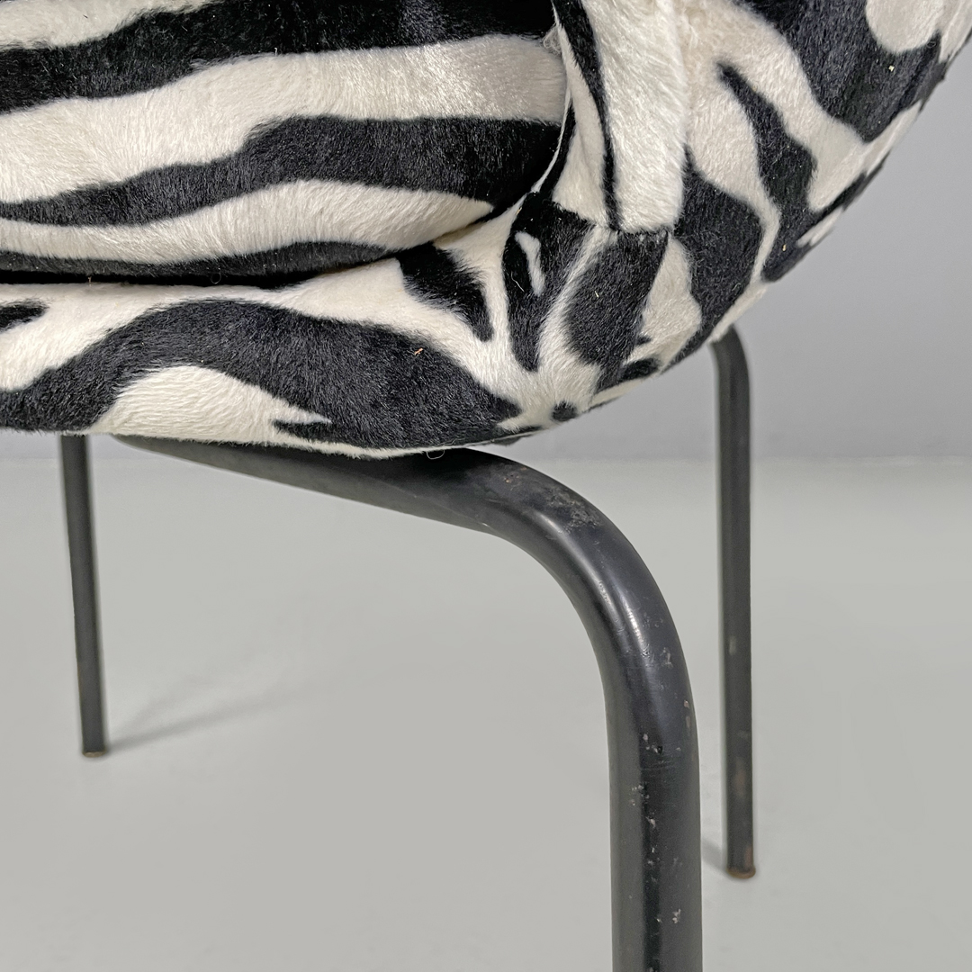 Poltrona a pozzetto con braccioli. La seduta e lo schienale sono imbottiti e rivestiti in tessuto zebrato bianco e nero. Le zampe a sezione tonda sono in metallo verniciato nero con piedini tondi in metallo.