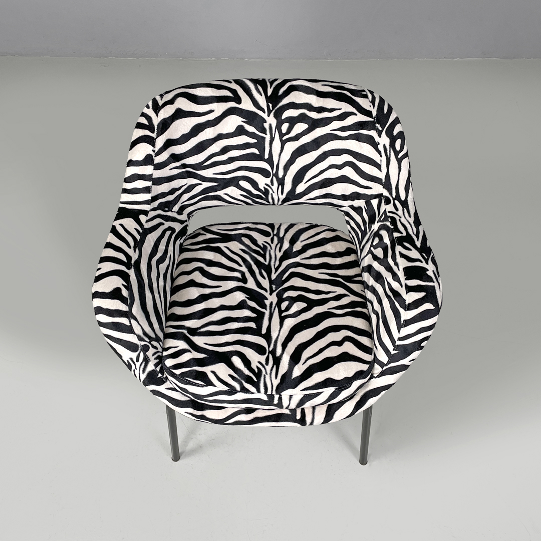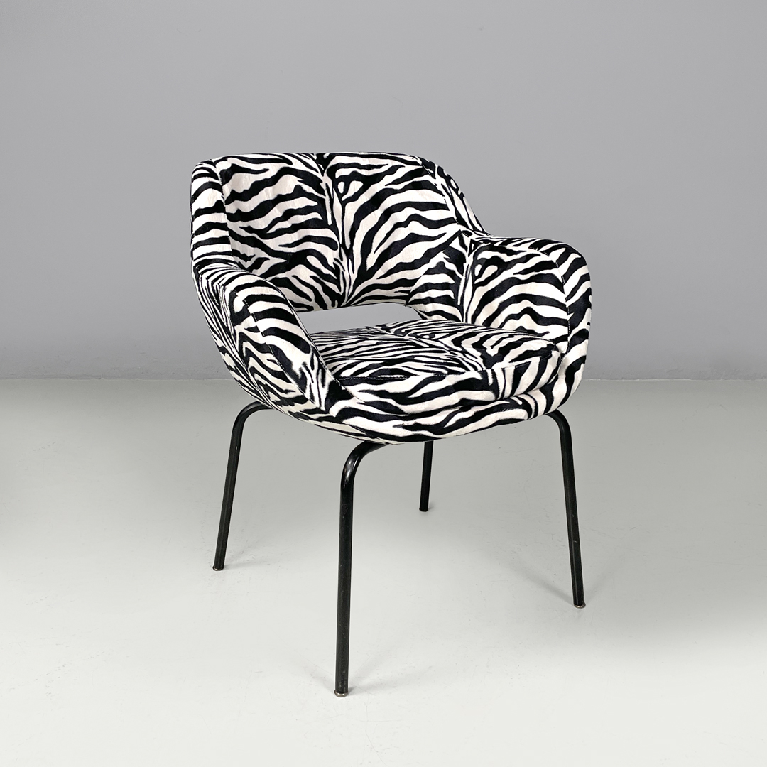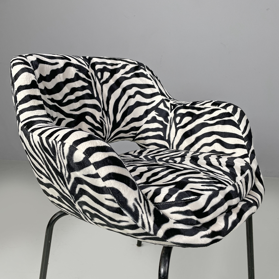 Poltrona a pozzetto con braccioli. La seduta e lo schienale sono imbottiti e rivestiti in tessuto zebrato bianco e nero. Le zampe a sezione tonda sono in metallo verniciato nero con piedini tondi in metallo.