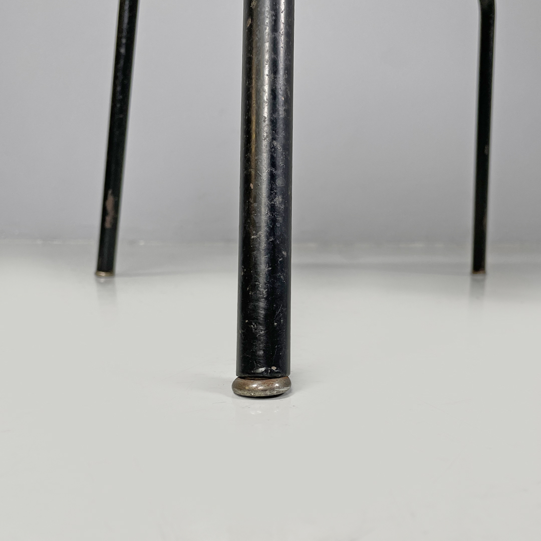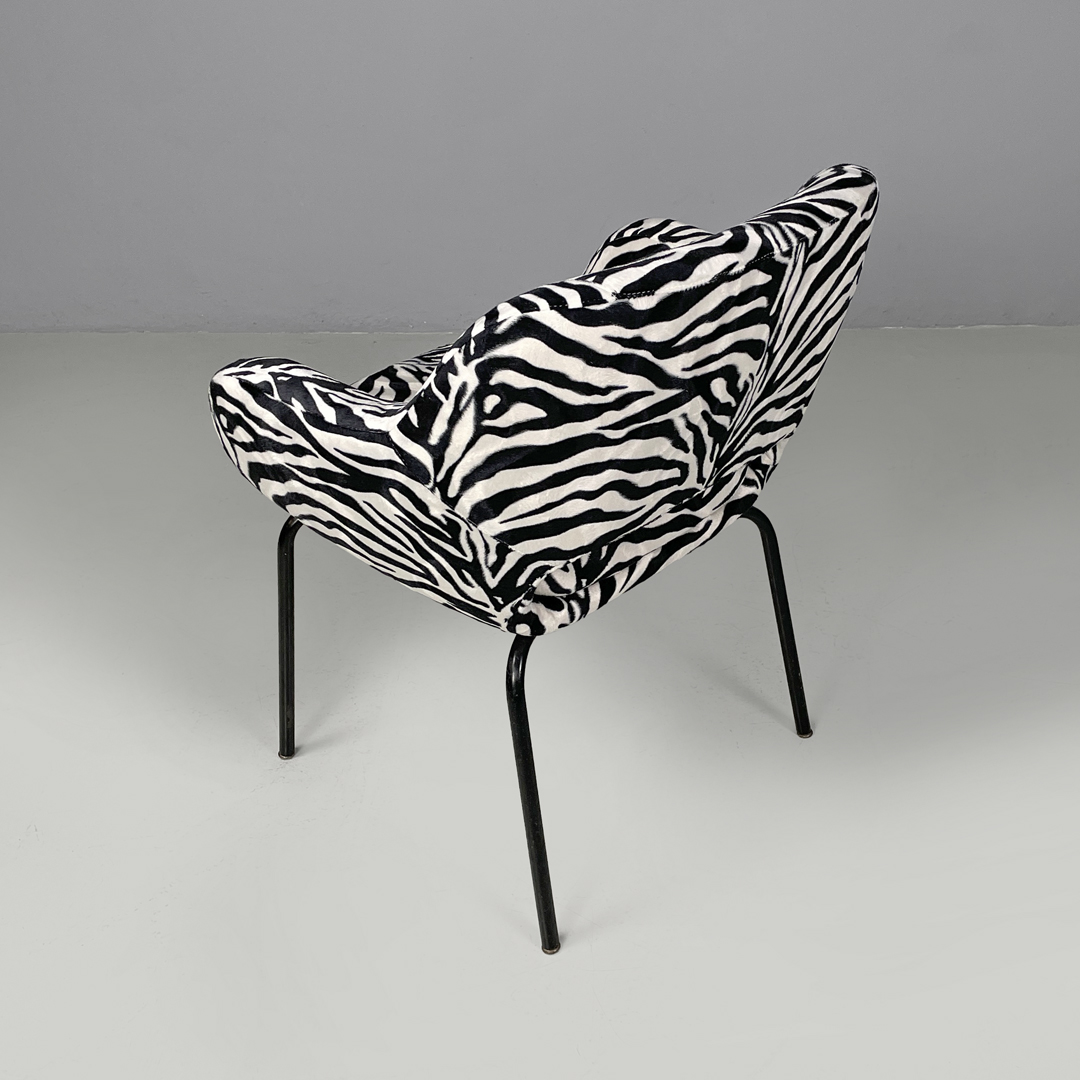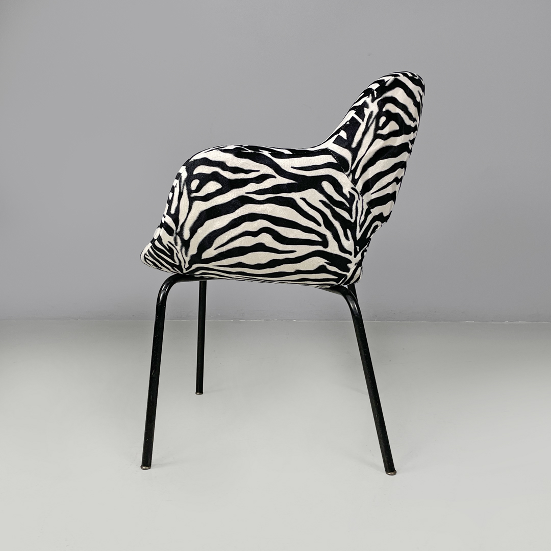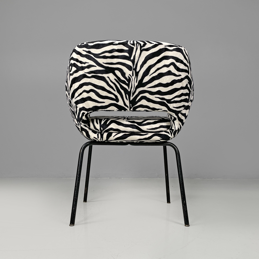 Poltrona a pozzetto con braccioli. La seduta e lo schienale sono imbottiti e rivestiti in tessuto zebrato bianco e nero. Le zampe a sezione tonda sono in metallo verniciato nero con piedini tondi in metallo.