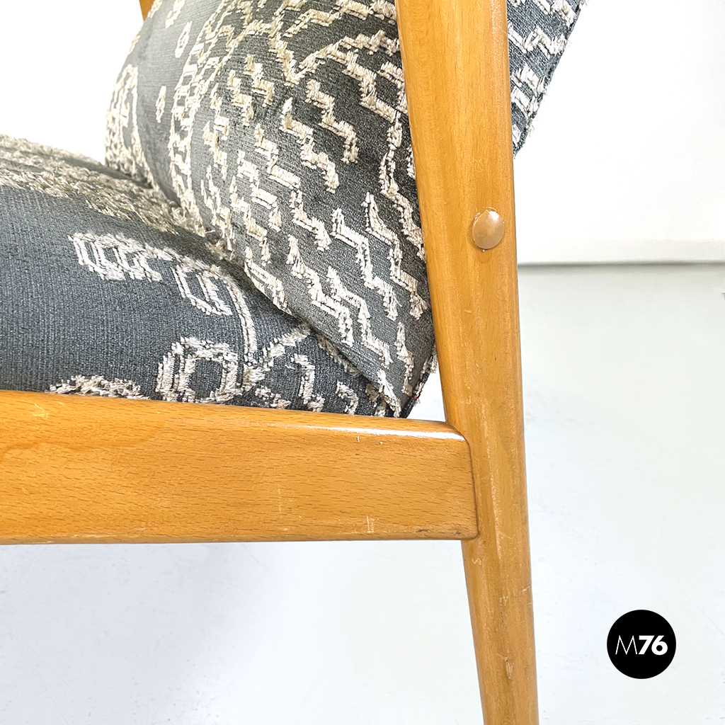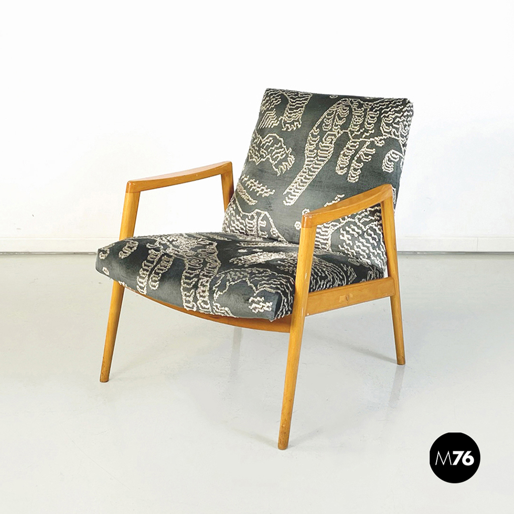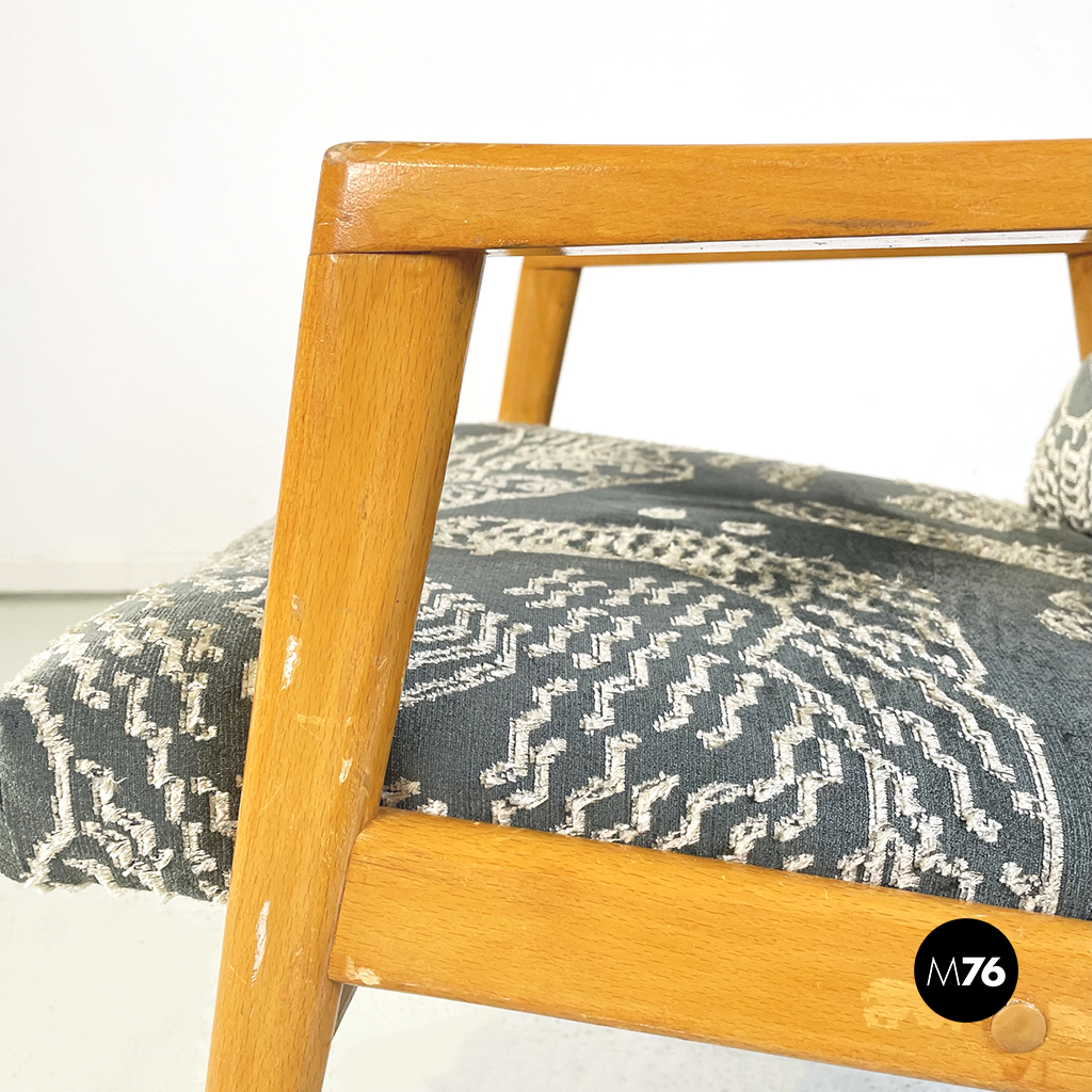 Poltrona con seduta e schienale imbottiti e rivestiti in tessuto verde-grigio con disegno bianco. La struttura della poltroncina è in legno massello con braccioli sagomati.