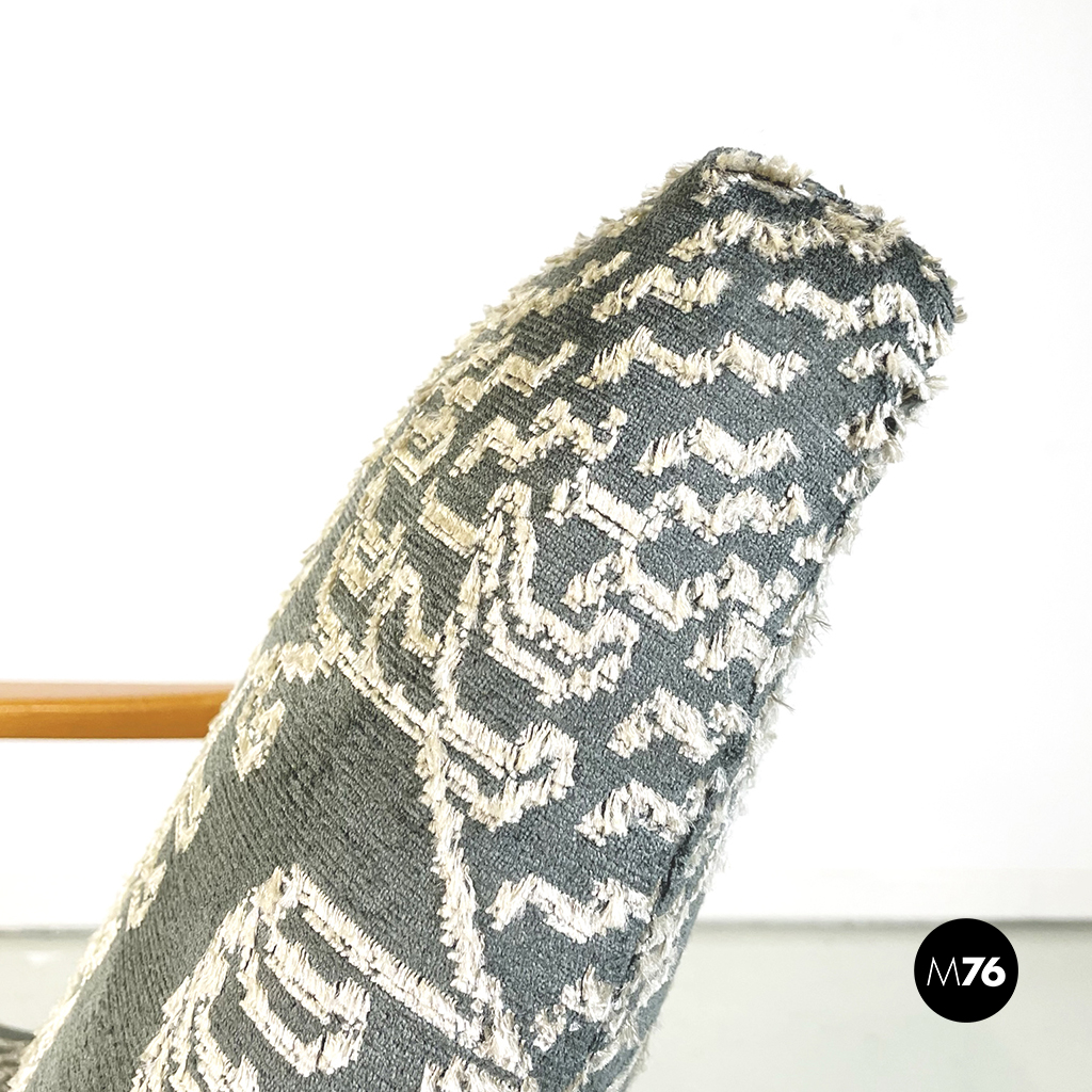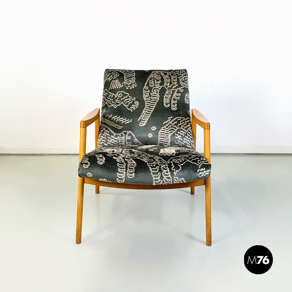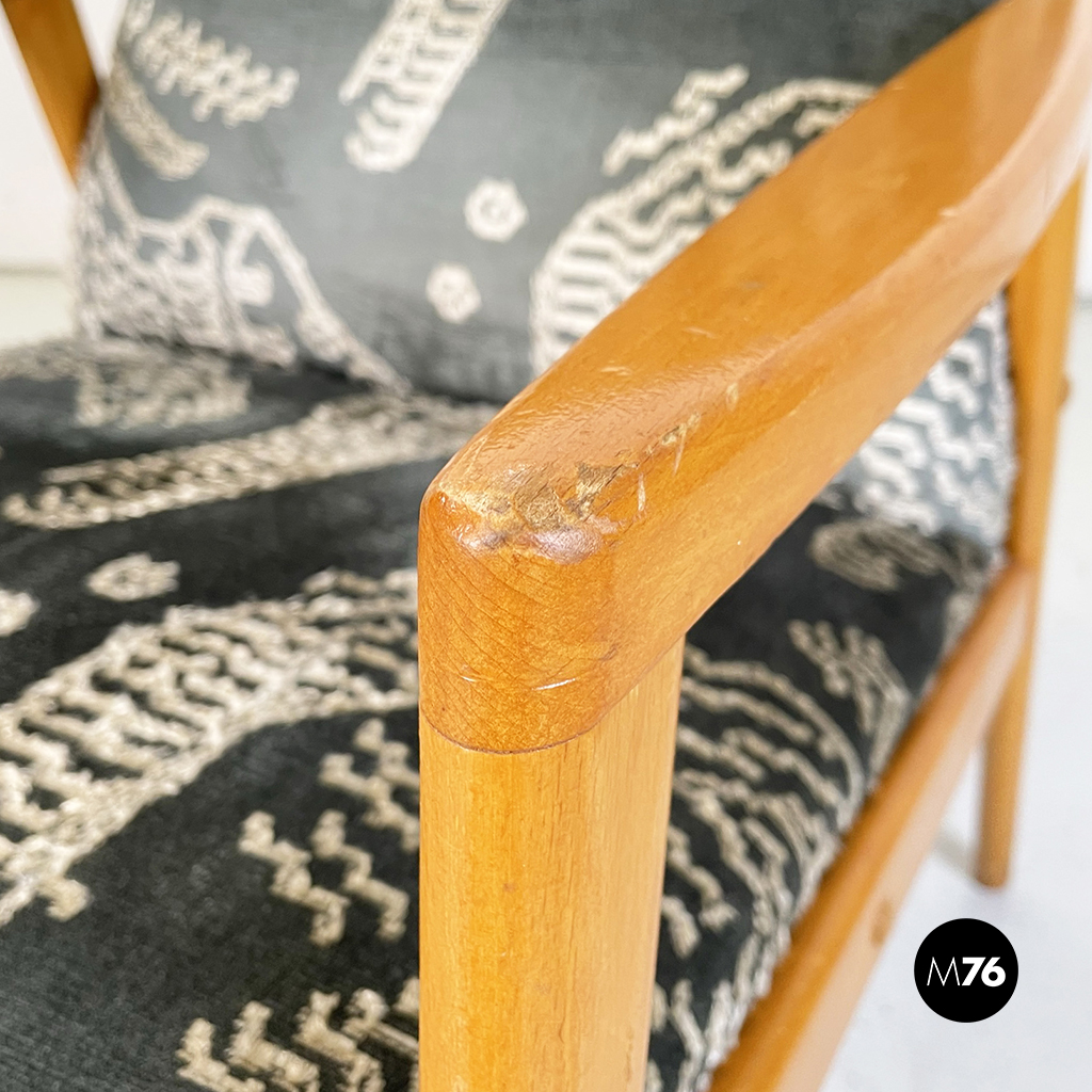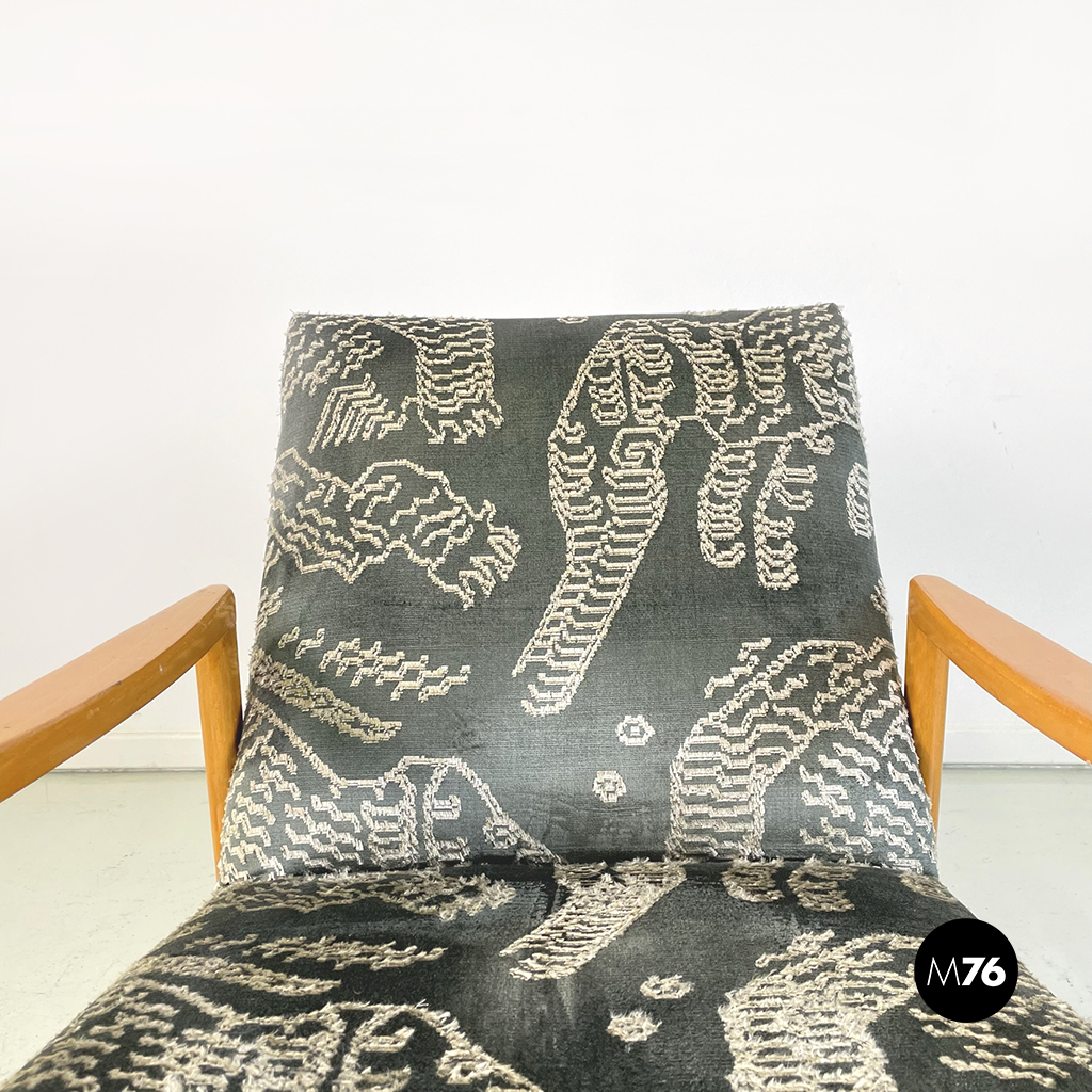 Poltrona con seduta e schienale imbottiti e rivestiti in tessuto verde-grigio con disegno bianco. La struttura della poltroncina è in legno massello con braccioli sagomati.