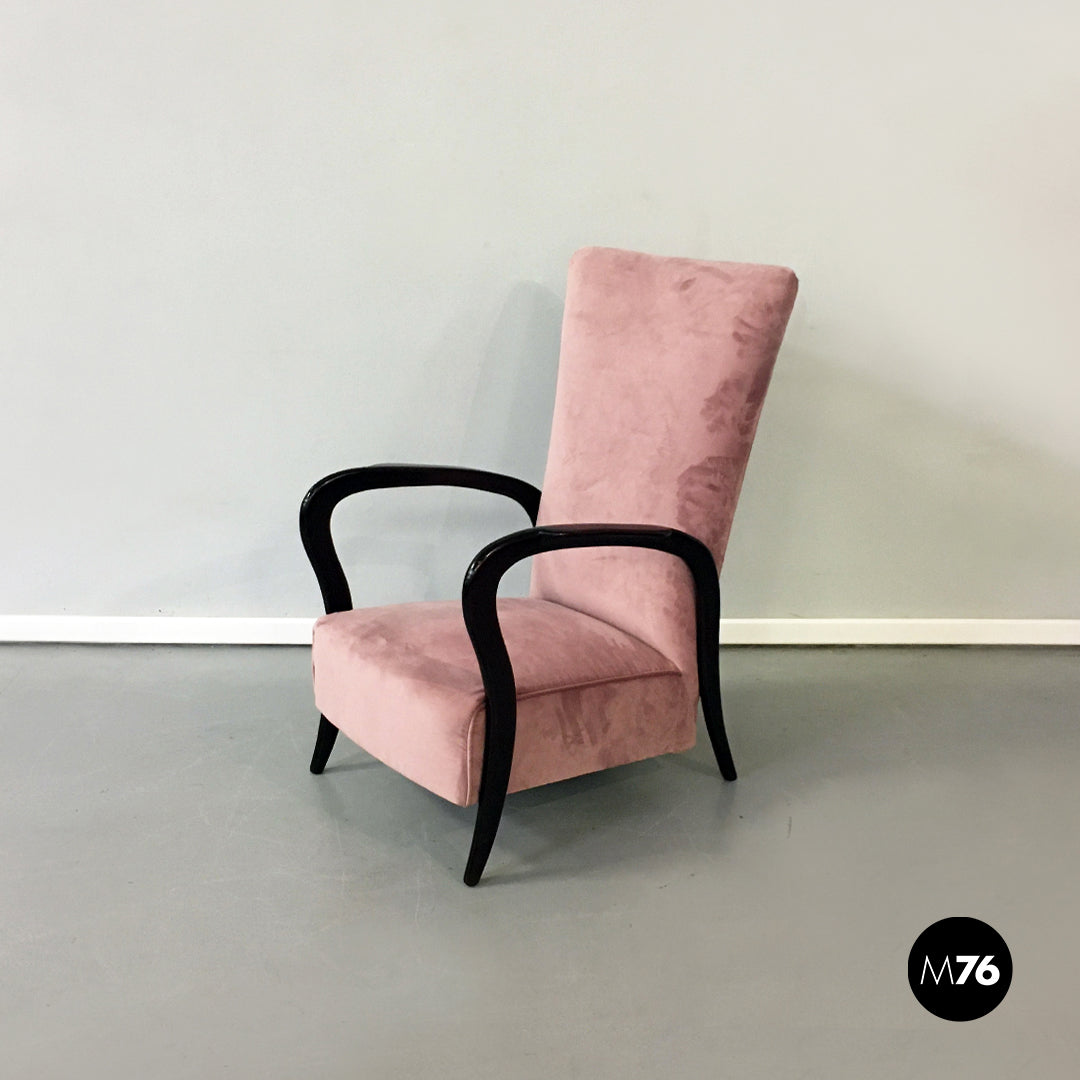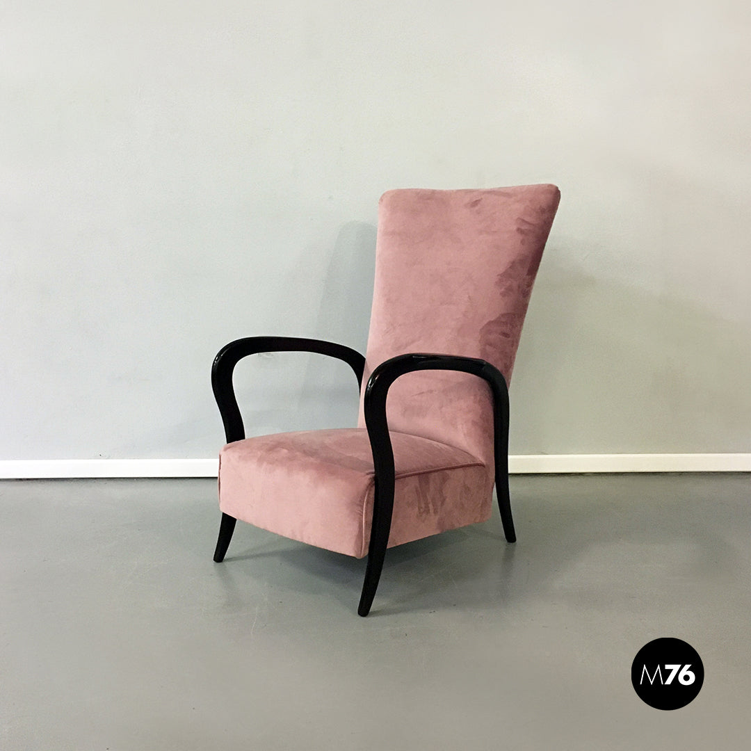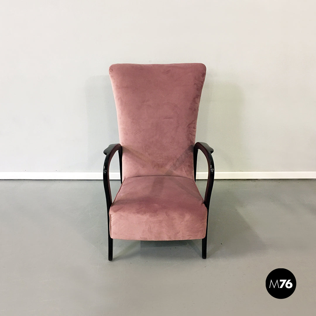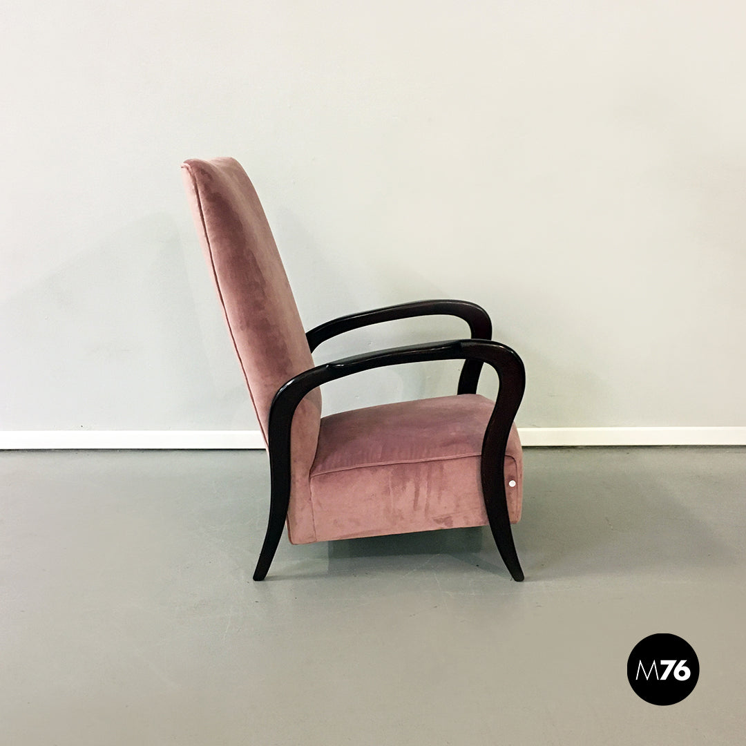 Poltrona con struttura in legno massello, seduta e schienale imbottiti e tappezzati a nuovo in velluto rosa e con braccioli curvati, in tinta scura.