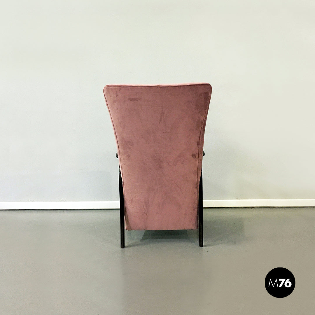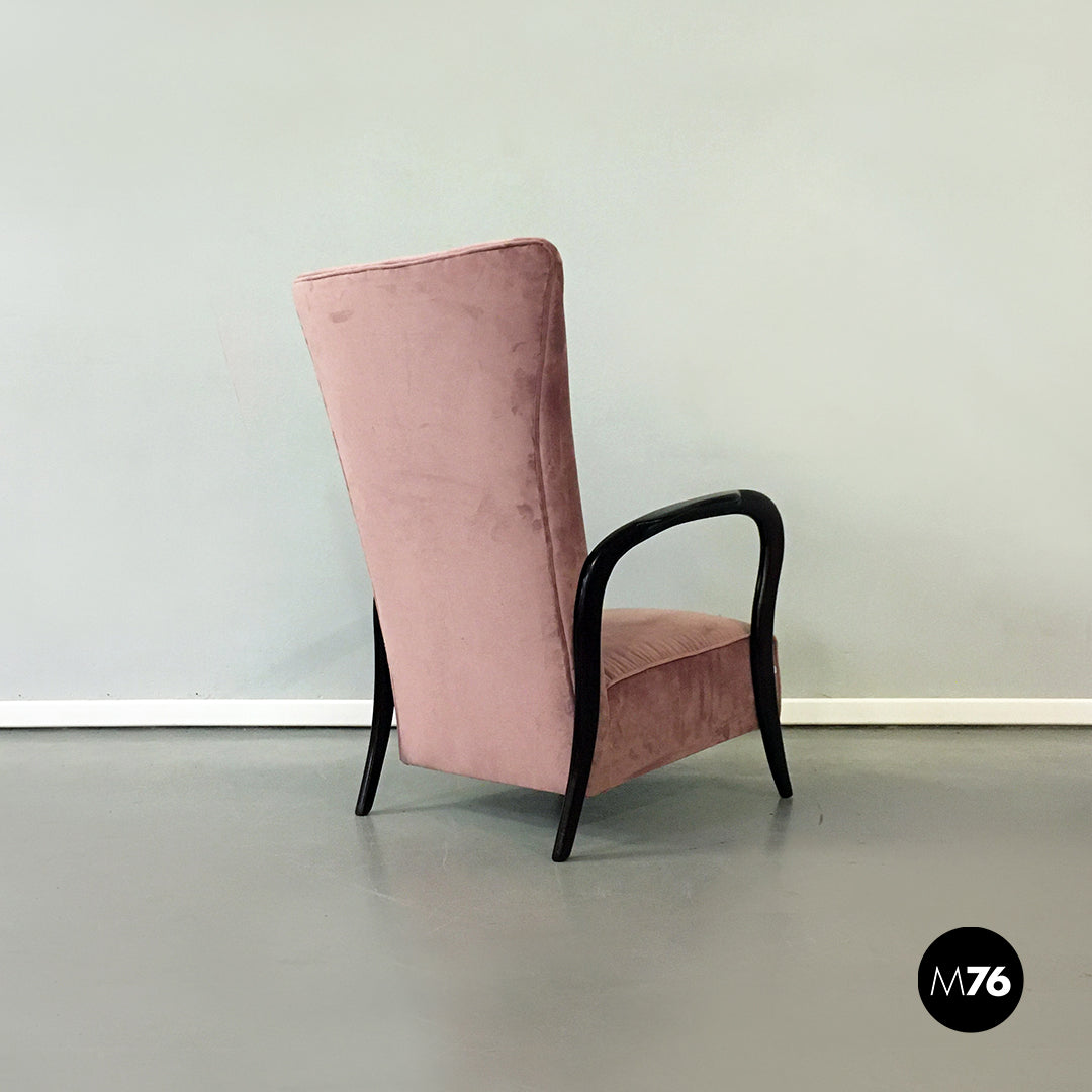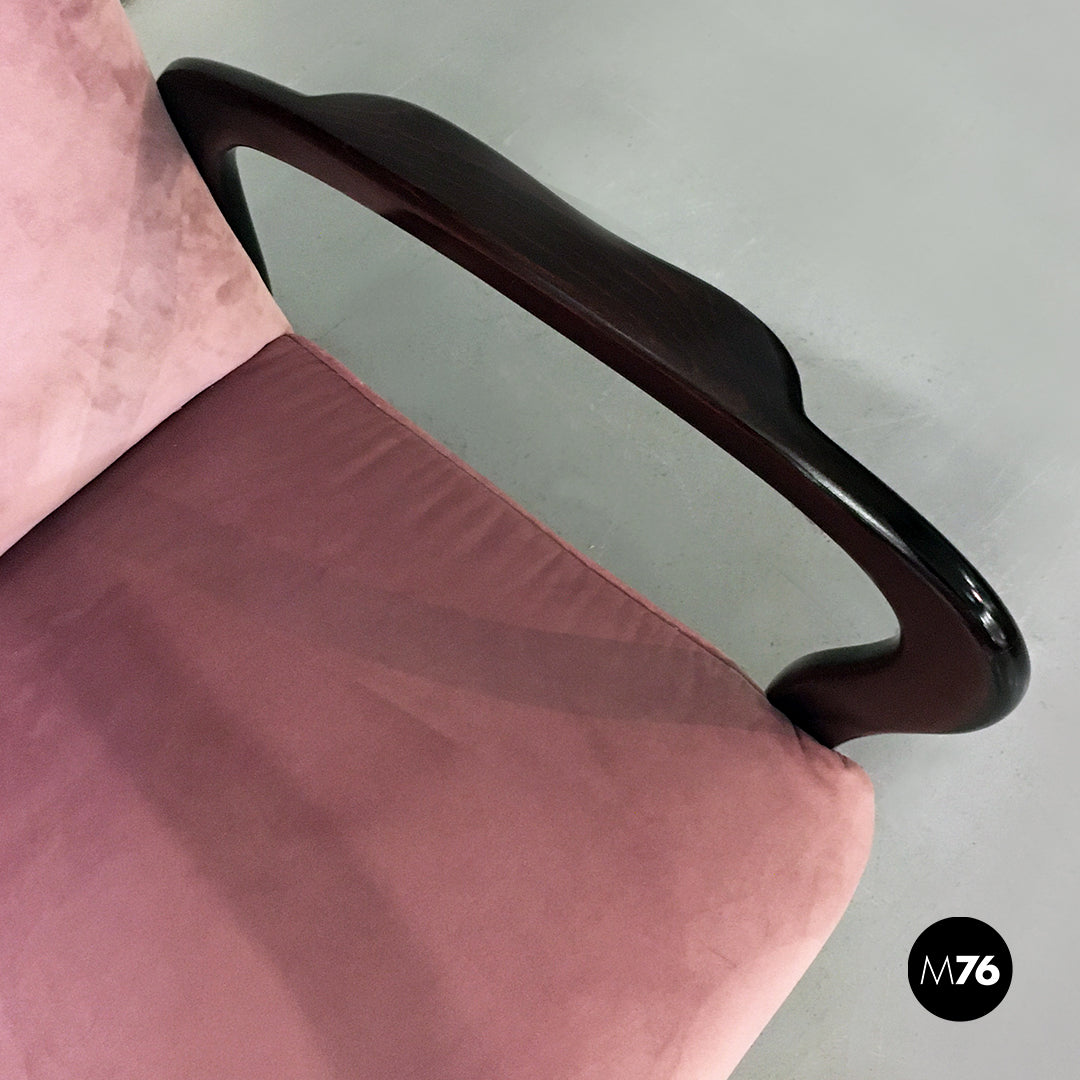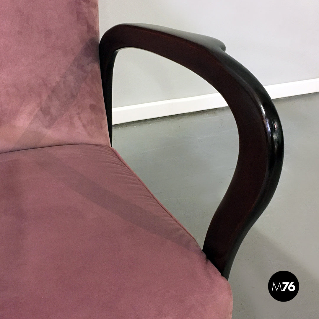 Poltrona con struttura in legno massello, seduta e schienale imbottiti e tappezzati a nuovo in velluto rosa e con braccioli curvati, in tinta scura.