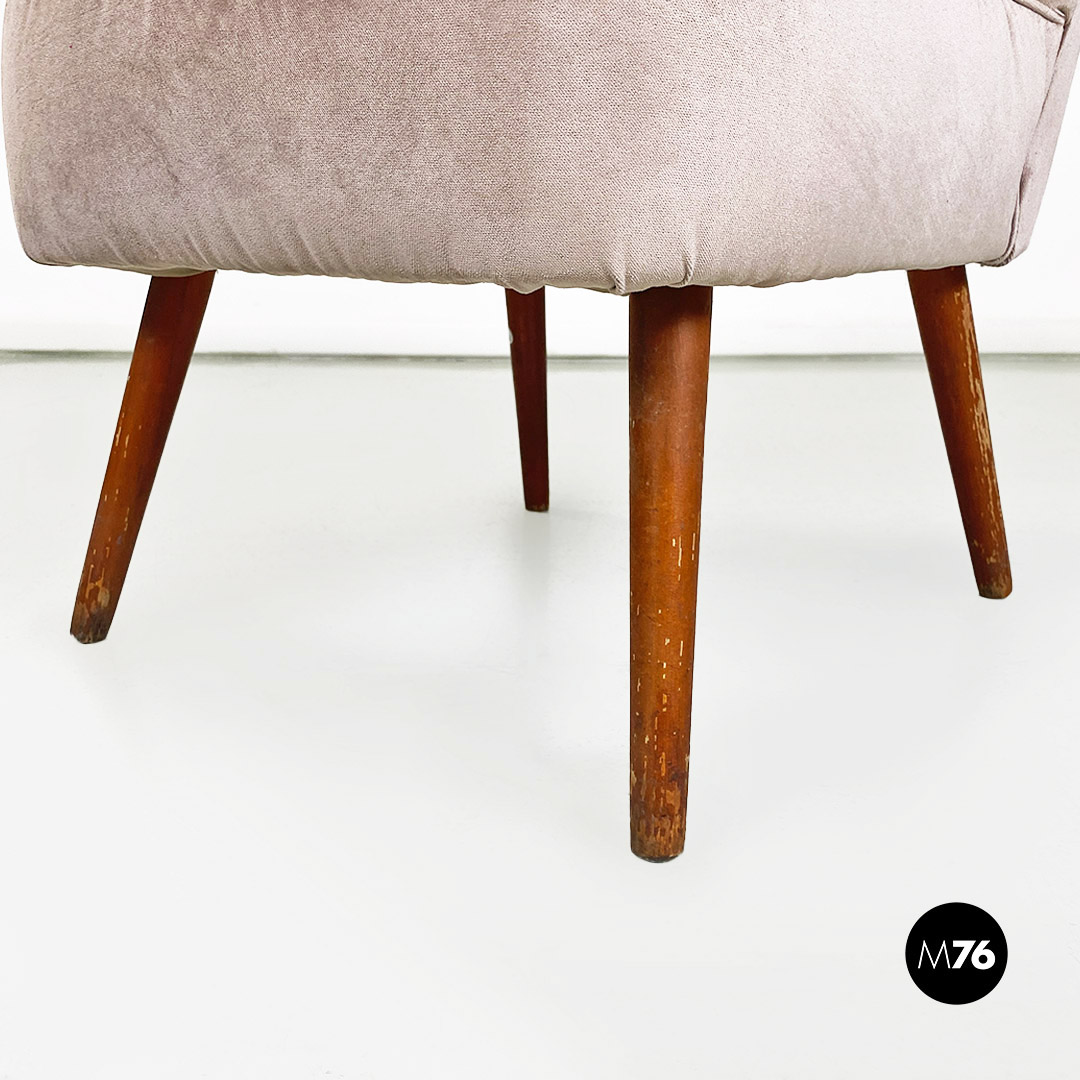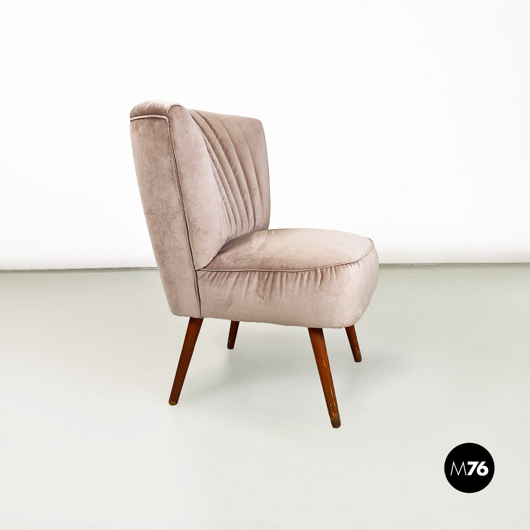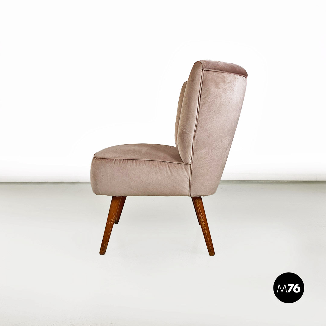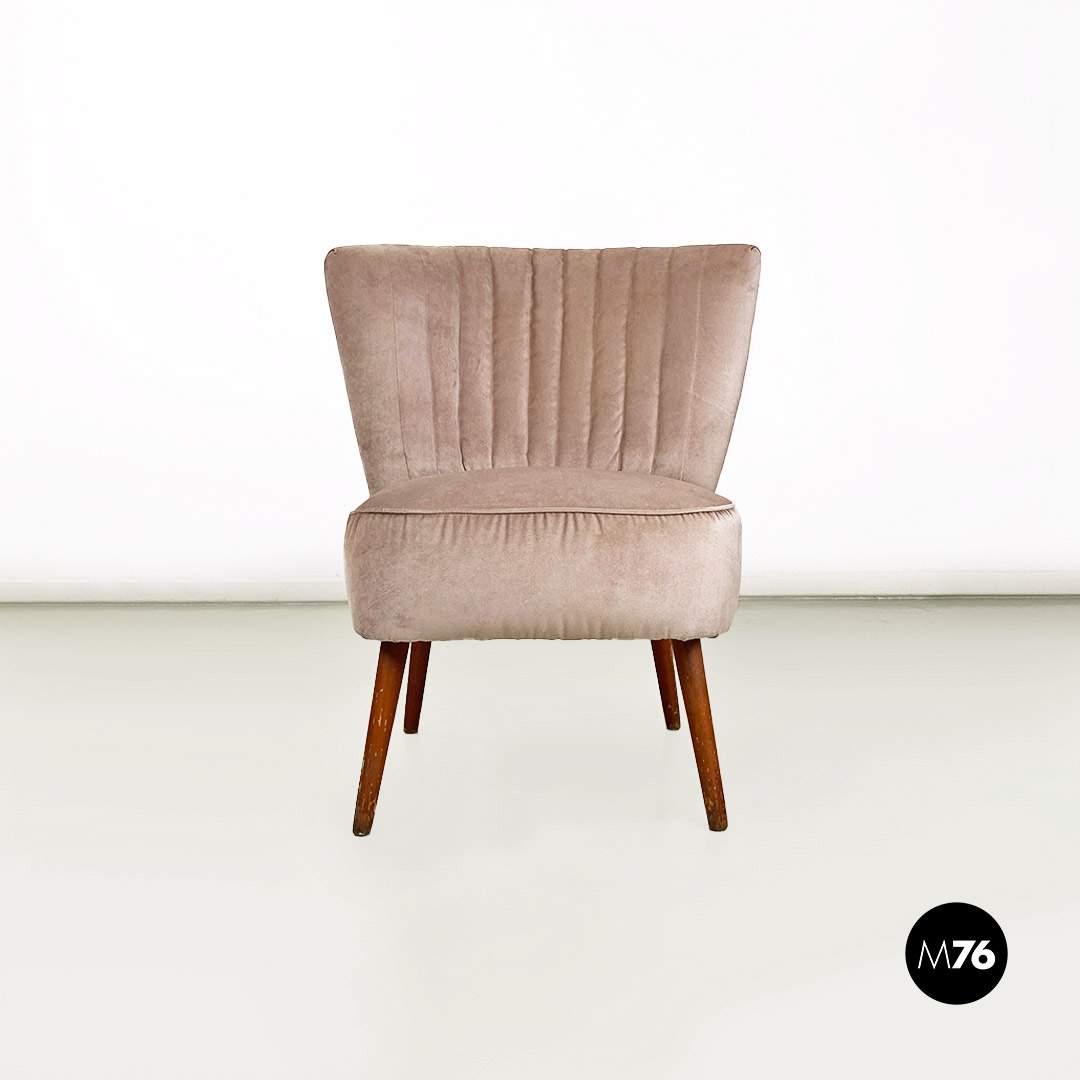 Poltroncina con rivestimento in velluto color rosa cipria, con cucitura decorativa sullo schienale e zampe in legno di faggio tinto.