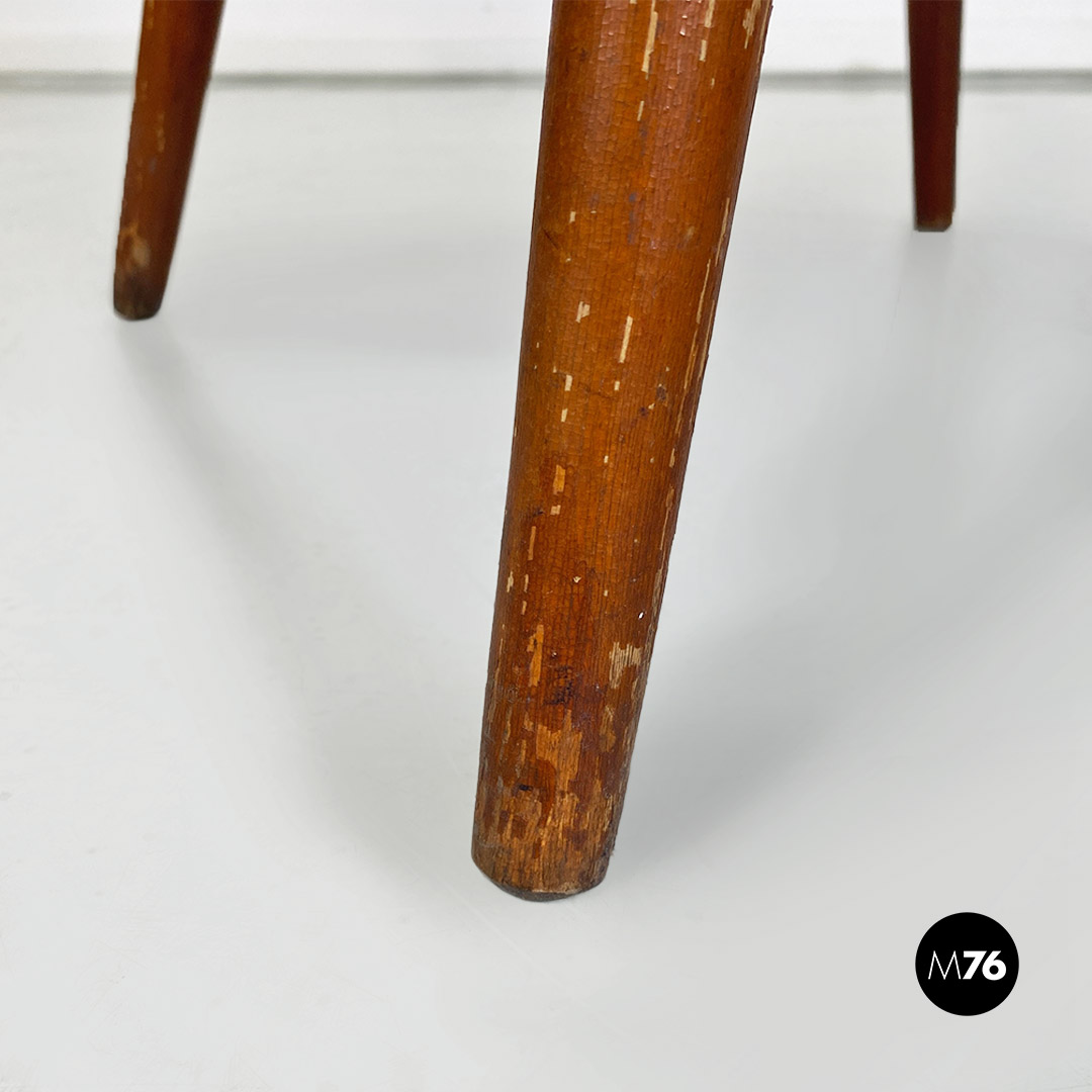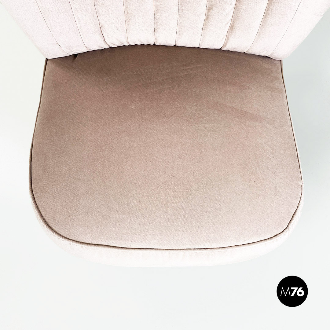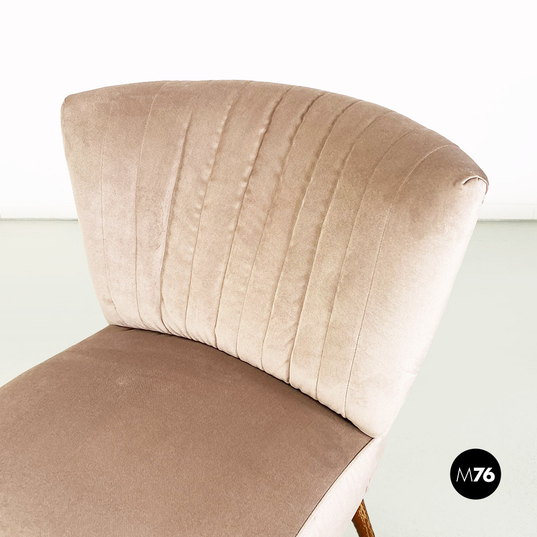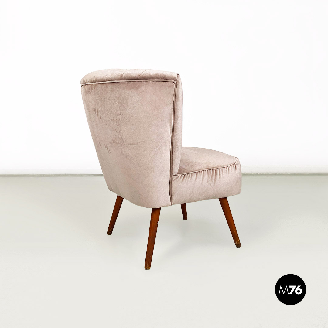 Poltroncina con rivestimento in velluto color rosa cipria, con cucitura decorativa sullo schienale e zampe in legno di faggio tinto.