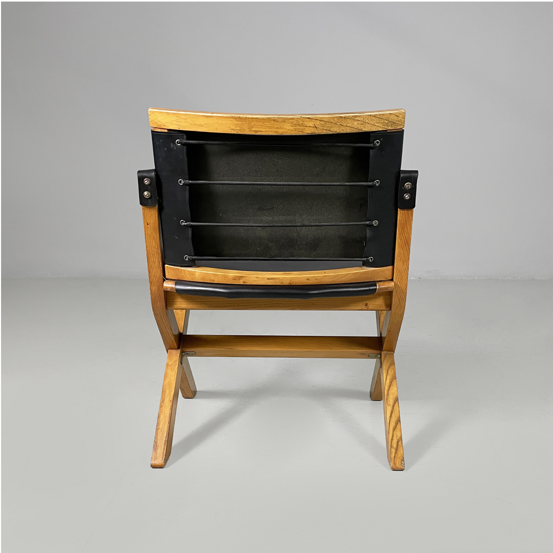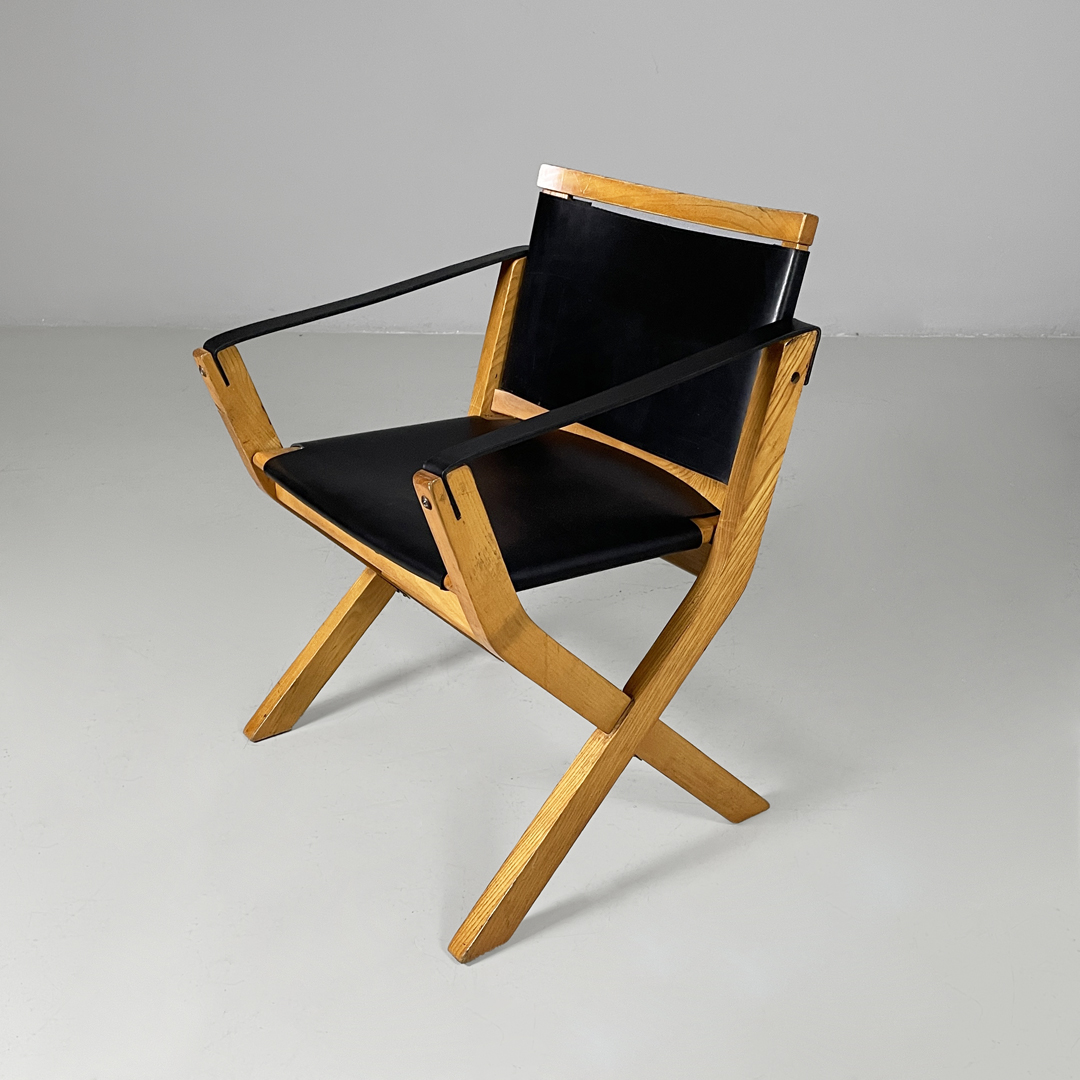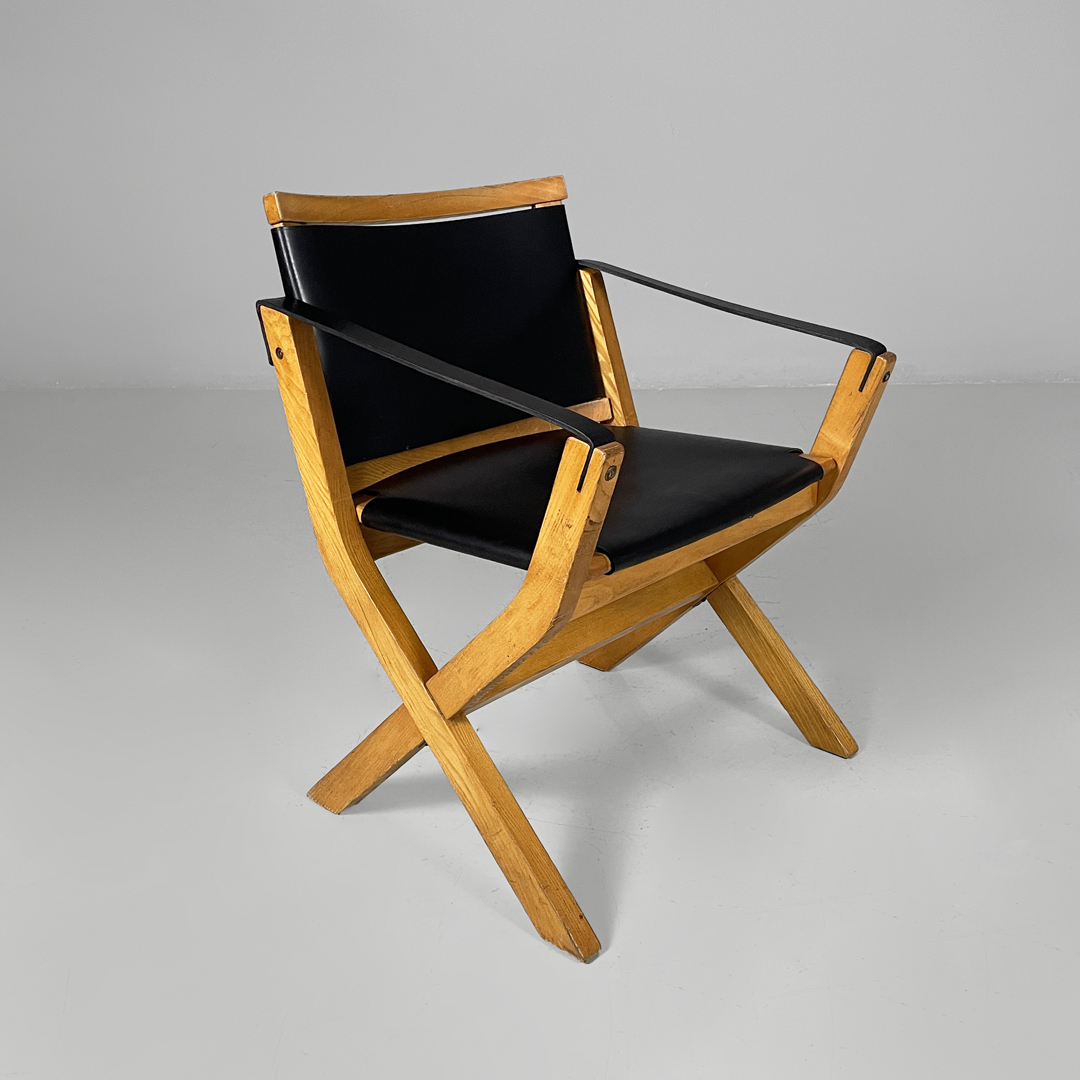Poltrona modello Kiu in legno e pelle. La struttura è in legno e le zampe sono a X. Lo schienale e seduta sono rivestite in cuoio nero. Anche i braccioli sono composti da una fascia di pelle.