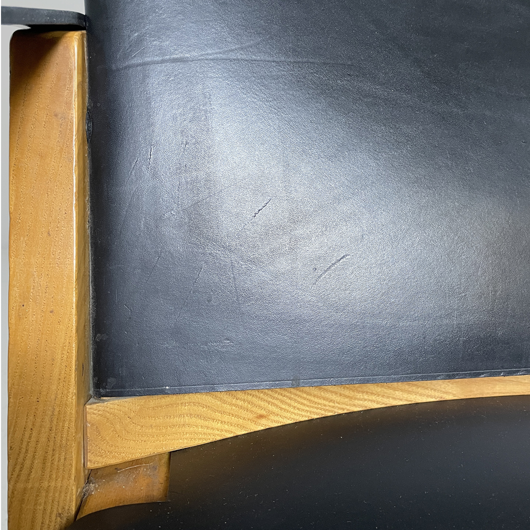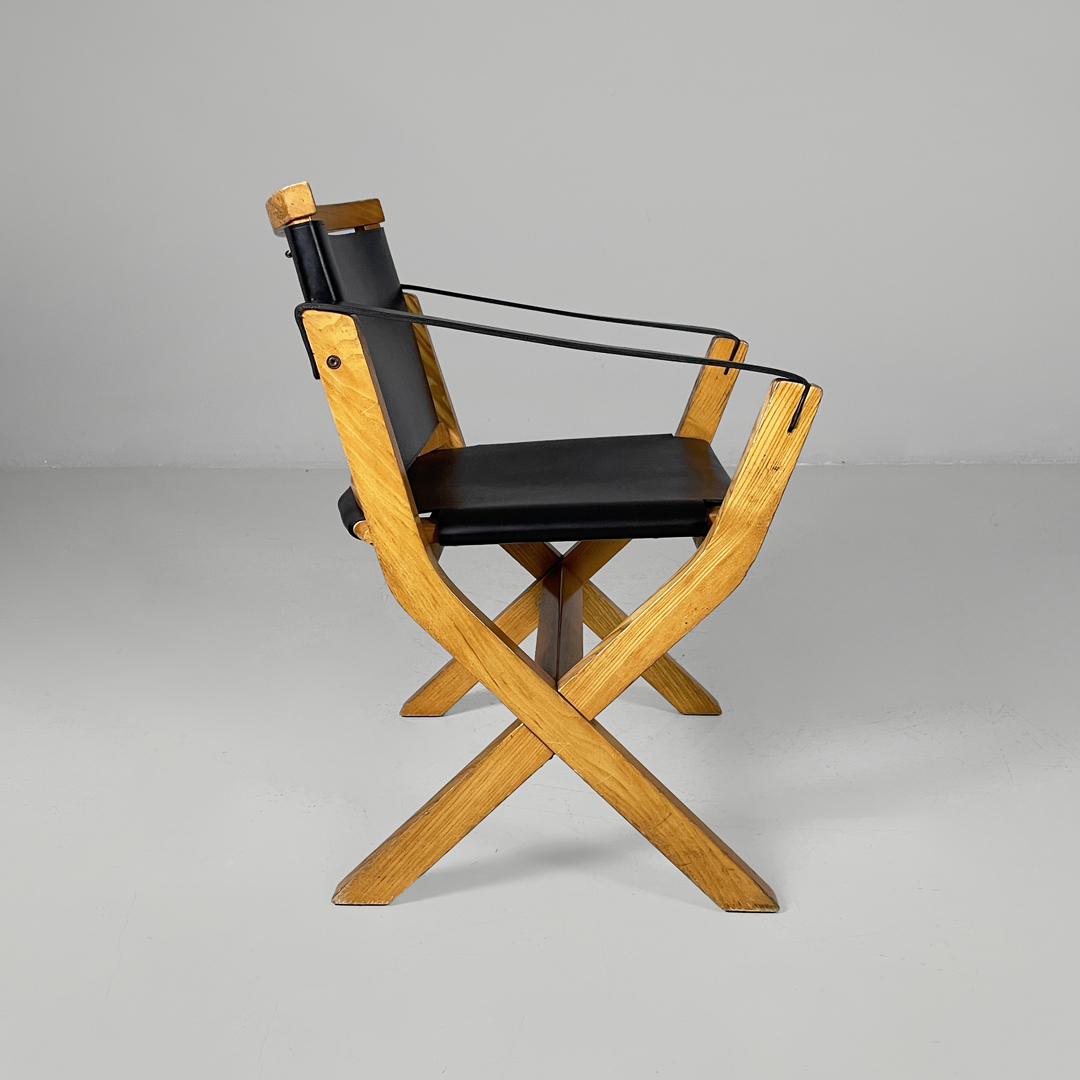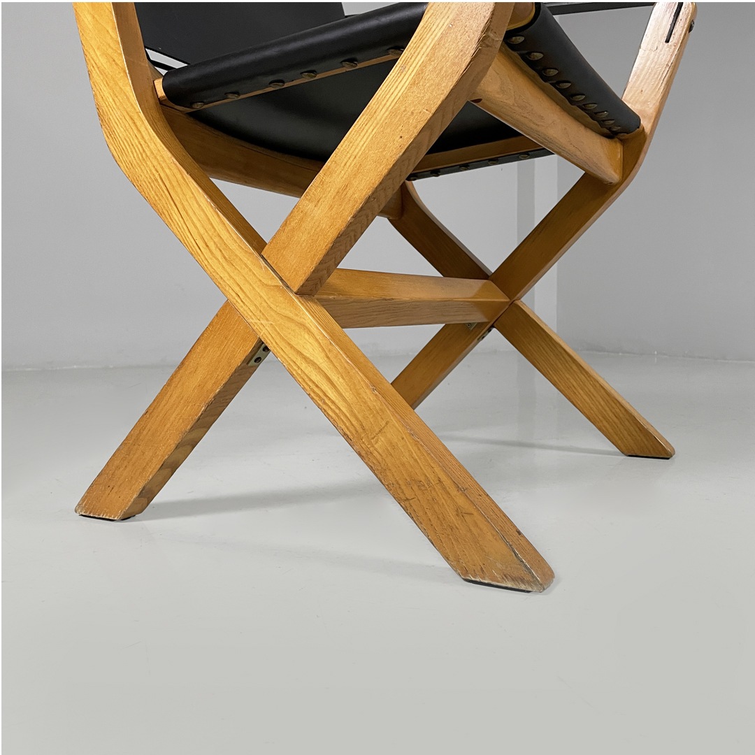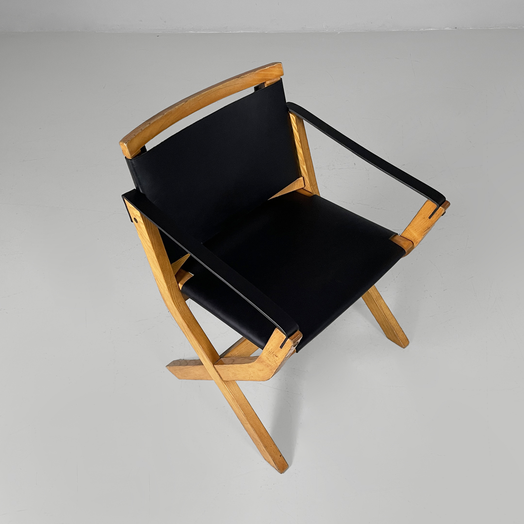 Poltrona modello Kiu in legno e pelle. La struttura è in legno e le zampe sono a X. Lo schienale e seduta sono rivestite in cuoio nero. Anche i braccioli sono composti da una fascia di pelle.