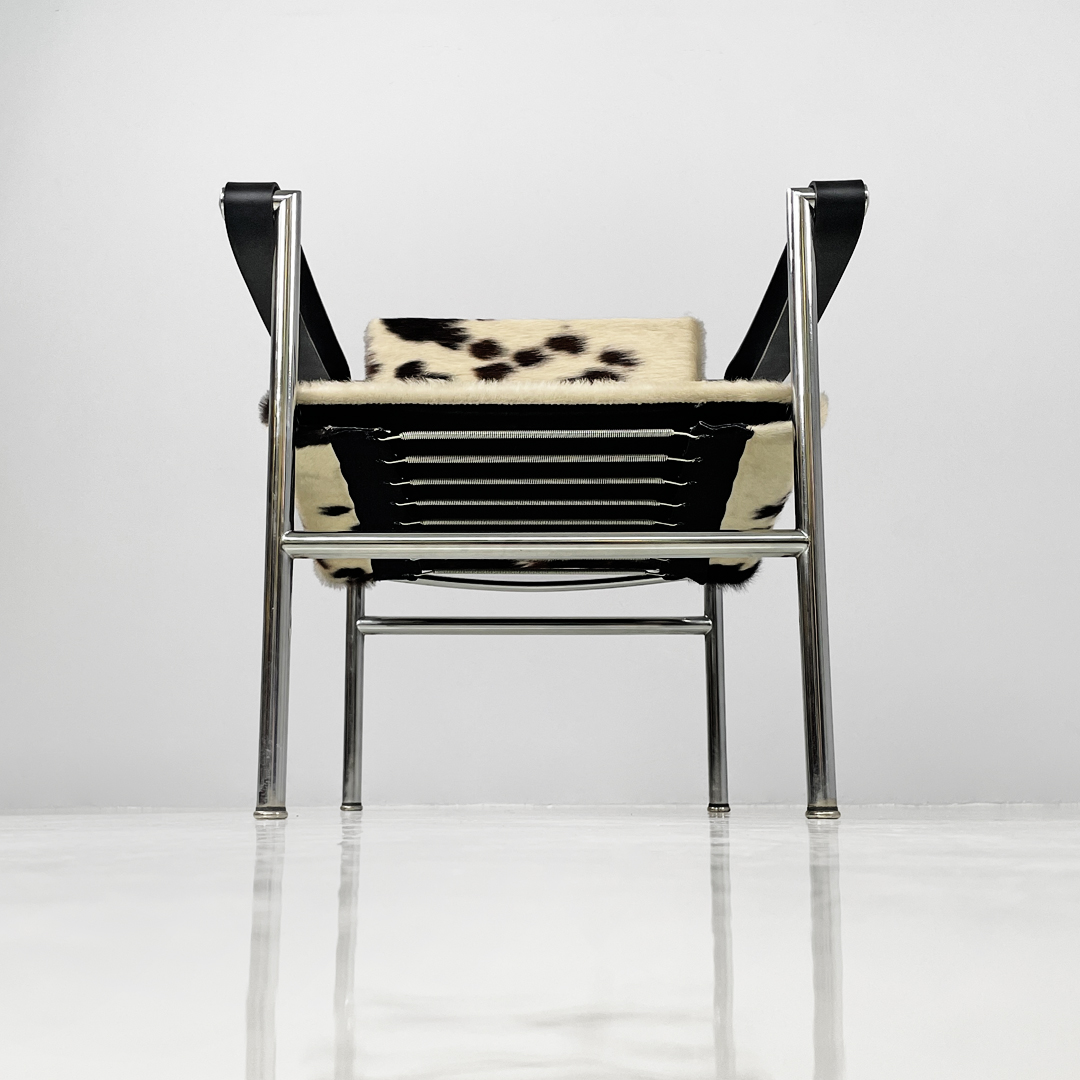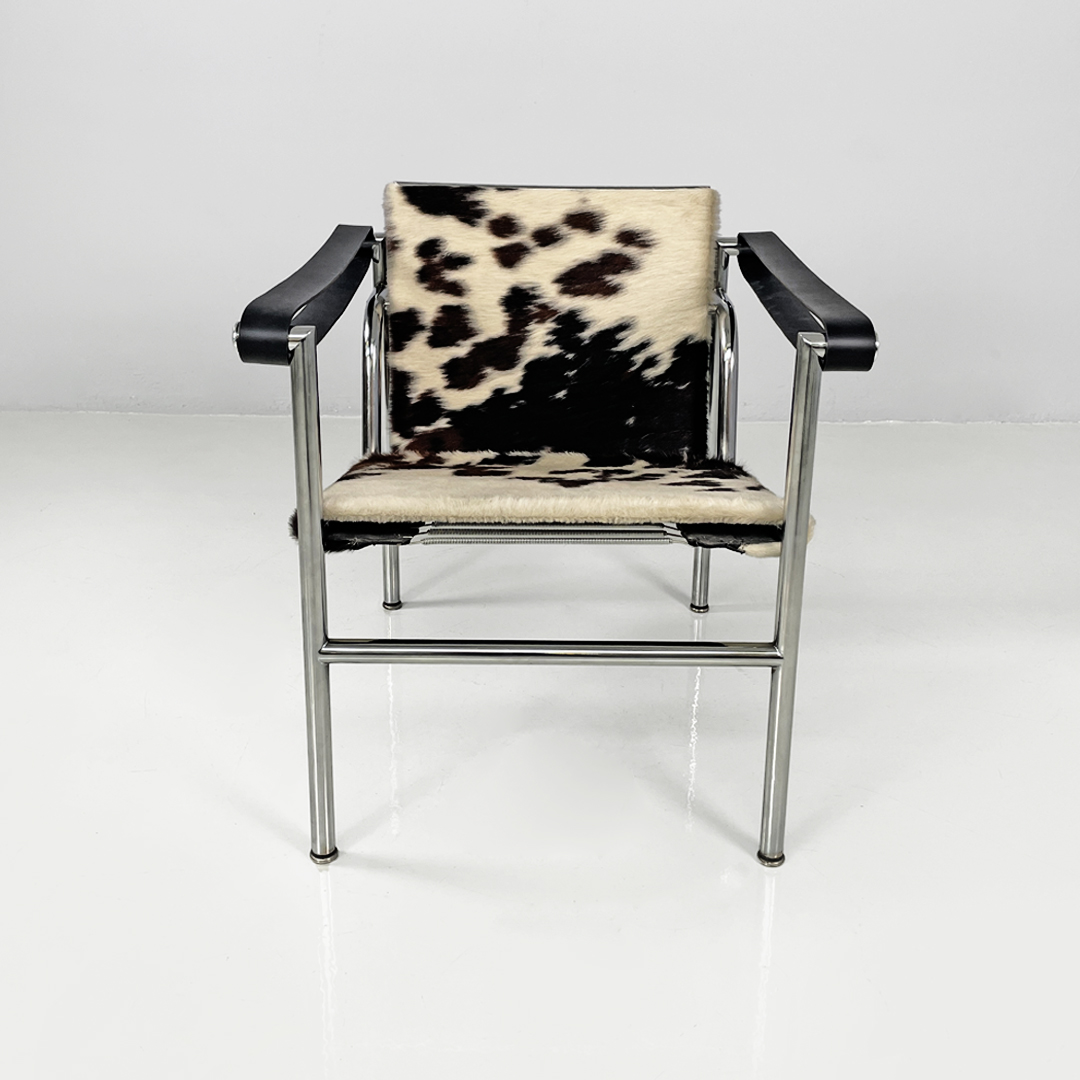 Poltrona modello LC1 o Fauteuil à dossier basculant con schienale basculante. Lo schienale e la seduta sono in pelle di cavallino sui toni del bianco e del marrone, mentre i braccioli sono composti da una fascia di pelle nera. Struttura in metallo.