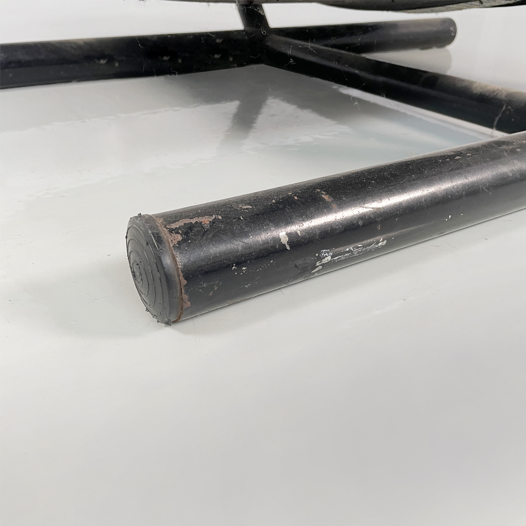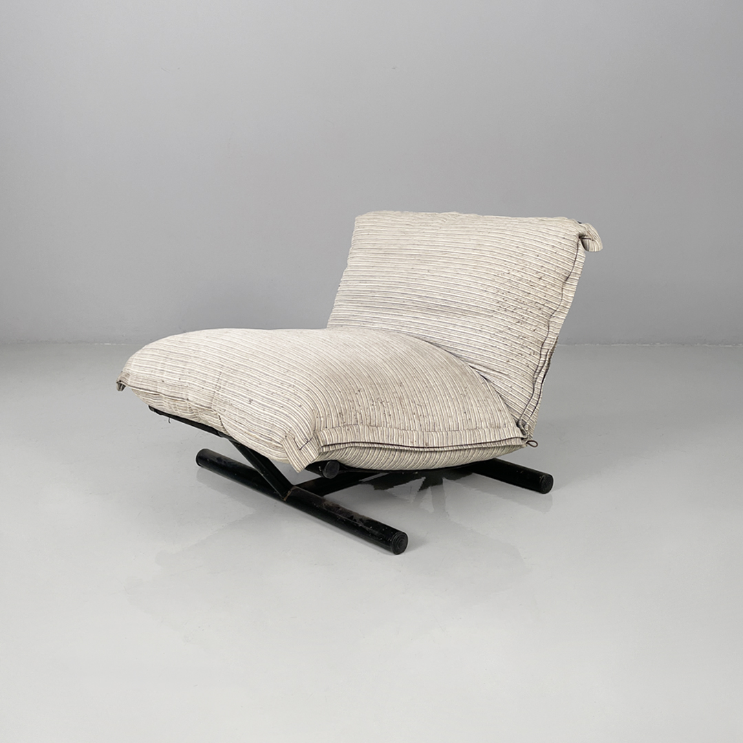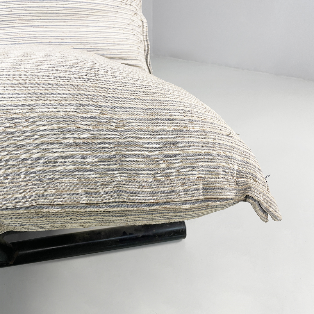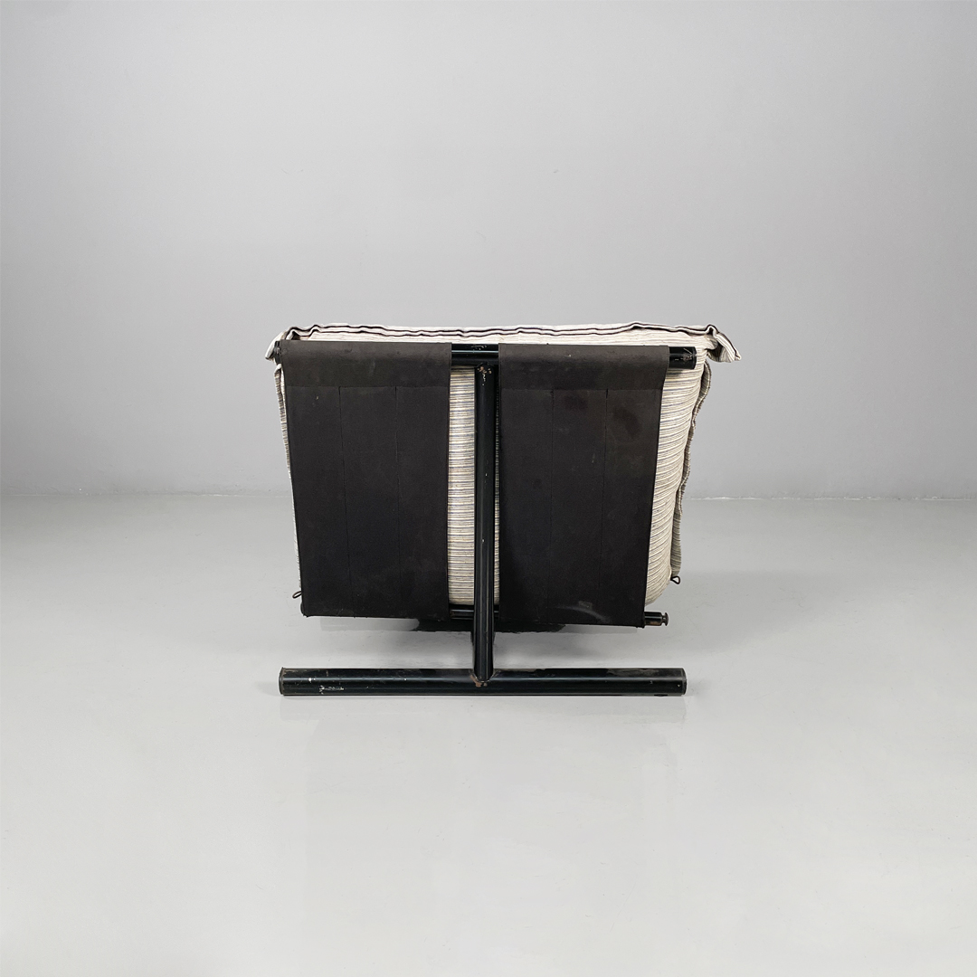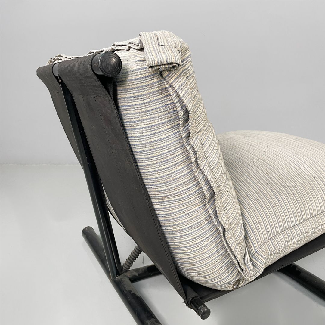 Poltrona mod. Le Farfalle in metallo e tessuto. La struttura è in metallo verniciato nero con tessuto nero come sostegno flessibile. La seduta è composta da un cuscino a doppio snodo rivestito in tessuto a righe bianco e azzurro chiaro.
