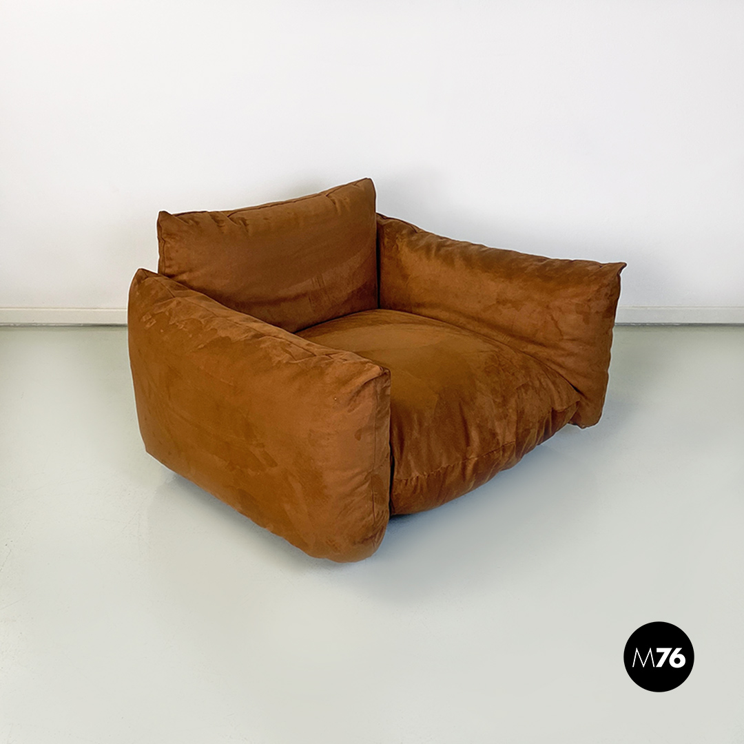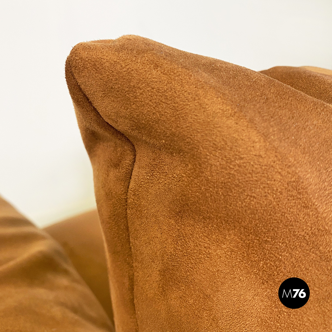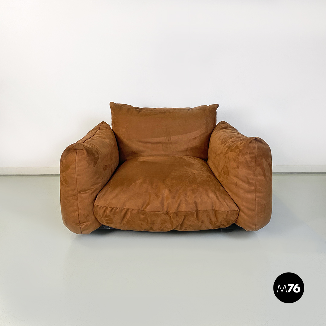 Poltrona modello Marenco, con struttura metallica non visibile e base in legno, alla quale sono ancorati i cuscini che la compongono, rivestiti in pelle scamosciata.