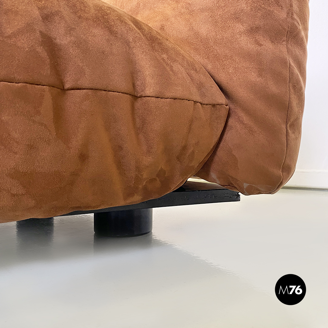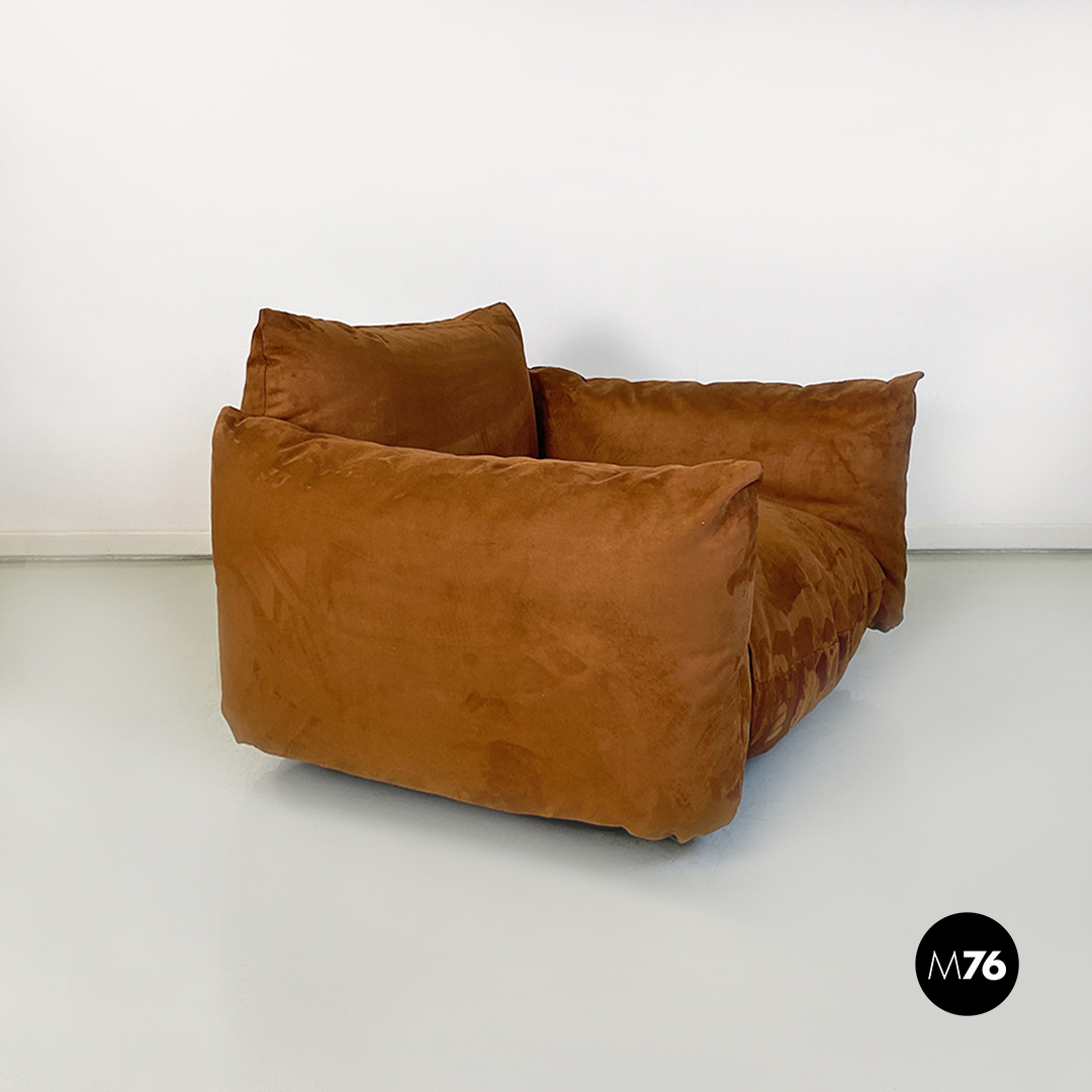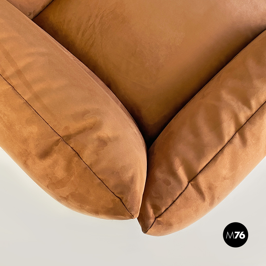 Poltrona modello Marenco, con struttura metallica non visibile e base in legno, alla quale sono ancorati i cuscini che la compongono, rivestiti in pelle scamosciata.